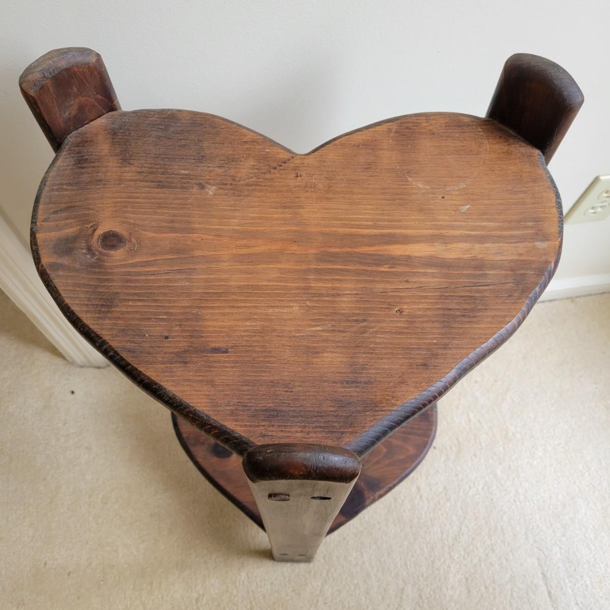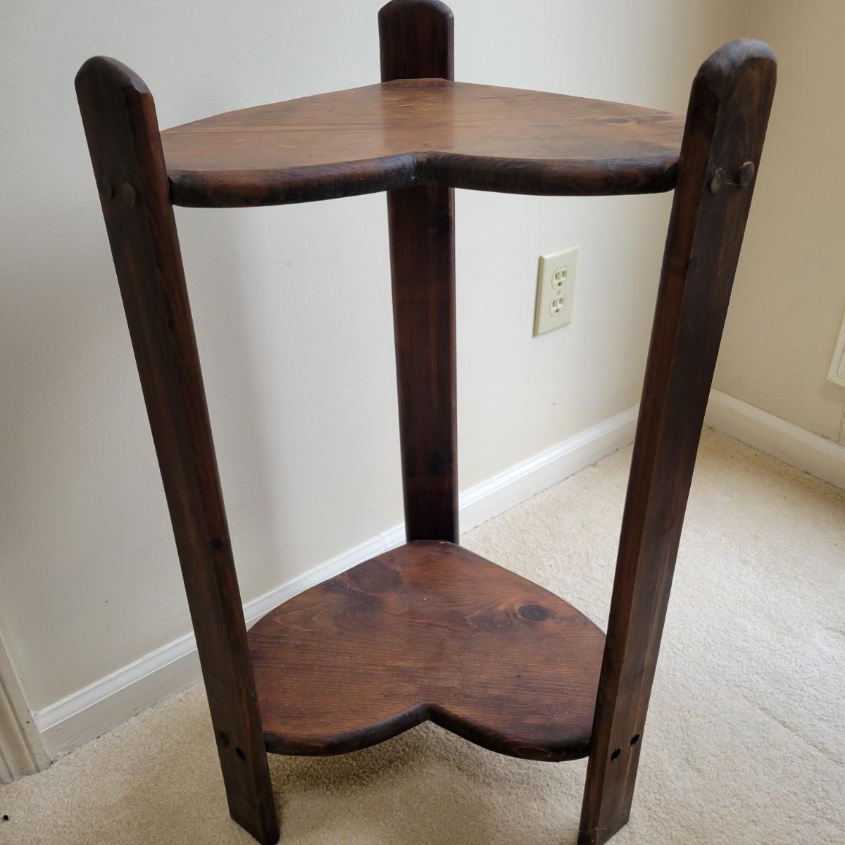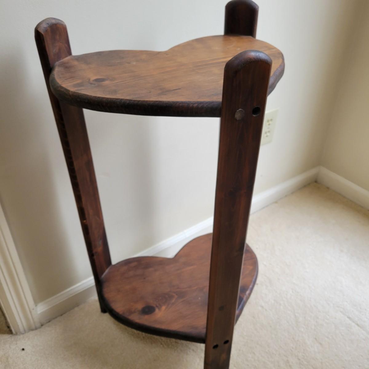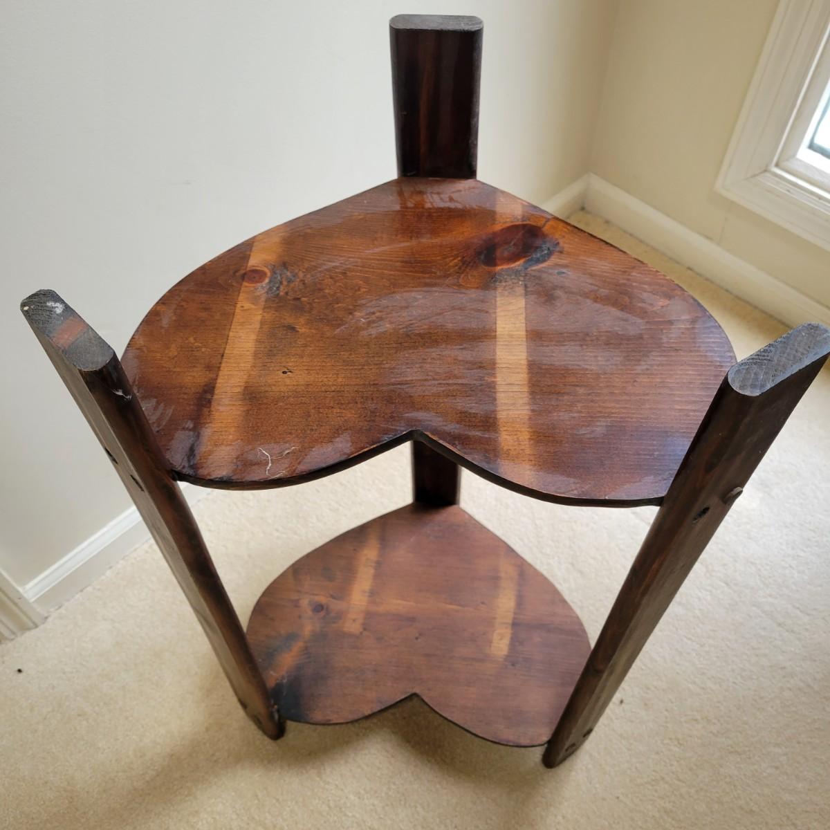 A rustic two tiered heart table in good condition. It has a water ring and is missing a few dowel plugs for screw holes. This table appears to be made of pine and has dark walnut stain. Measures approximately 16" x 12" x 28". Local pickup only