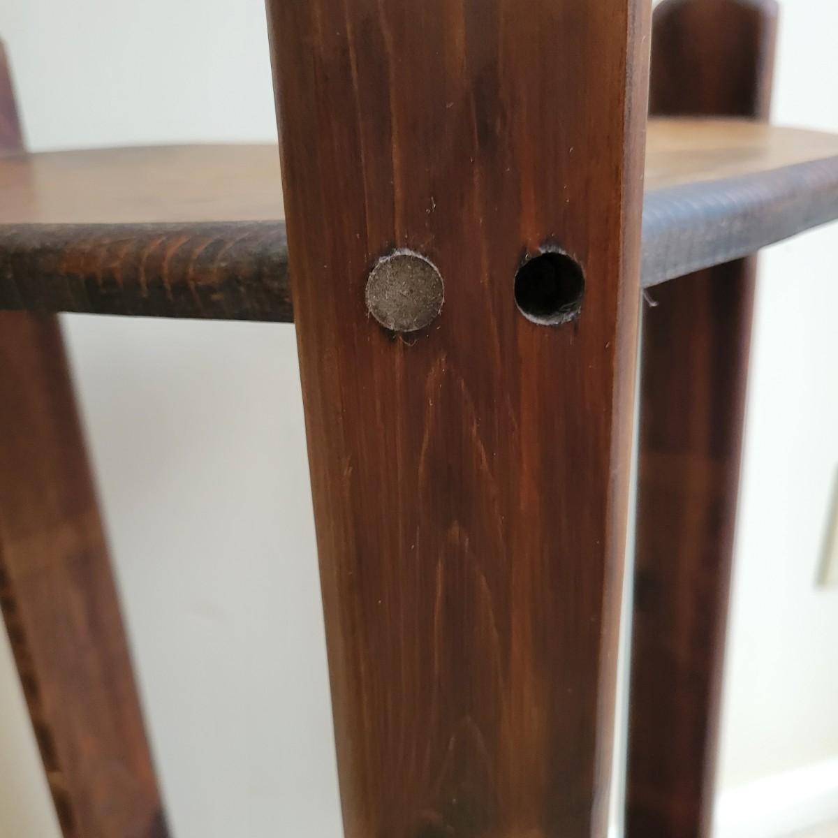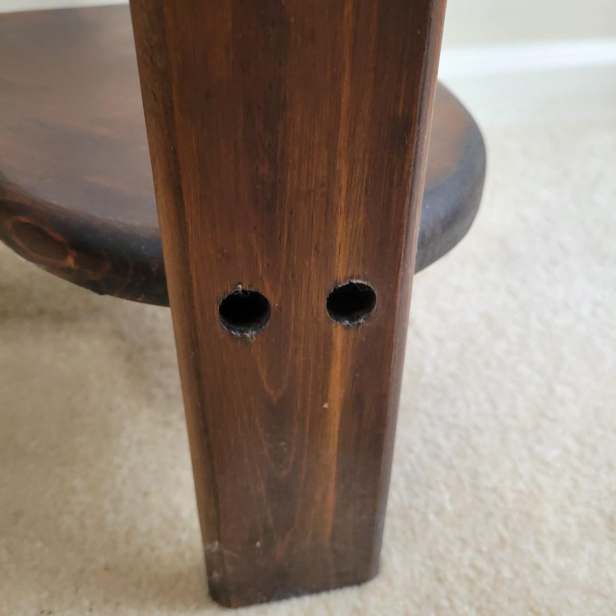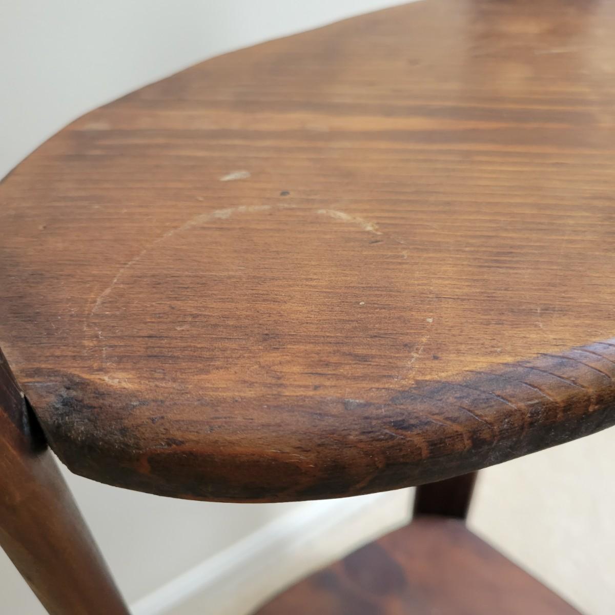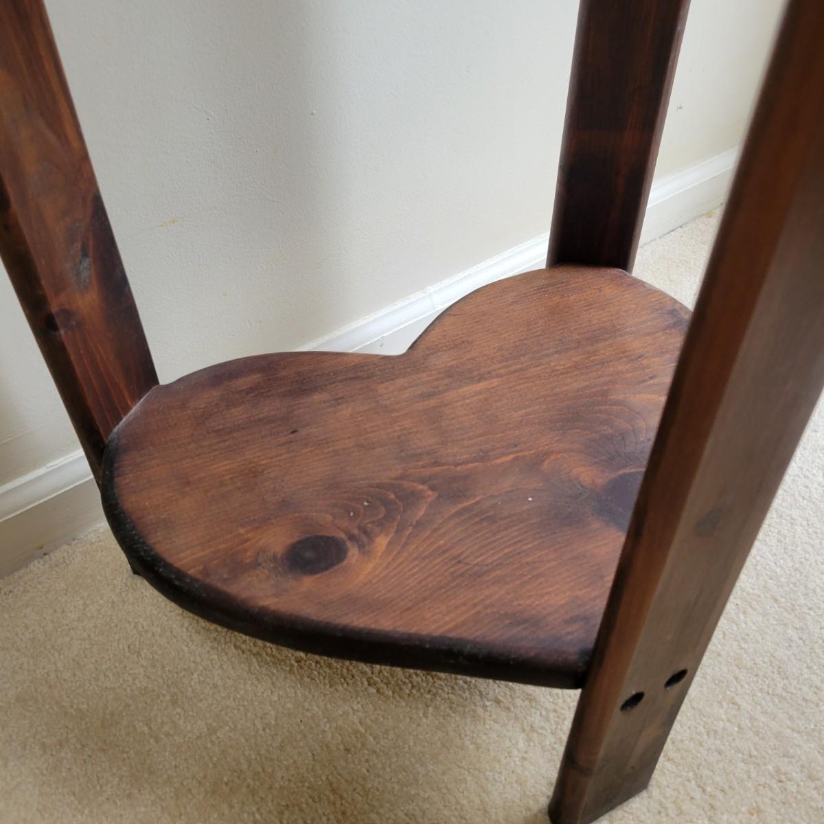 A rustic two tiered heart table in good condition. It has a water ring and is missing a few dowel plugs for screw holes. This table appears to be made of pine and has dark walnut stain. Measures approximately 16" x 12" x 28". Local pickup only