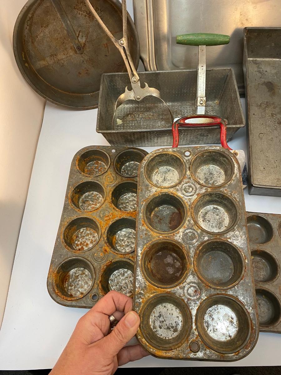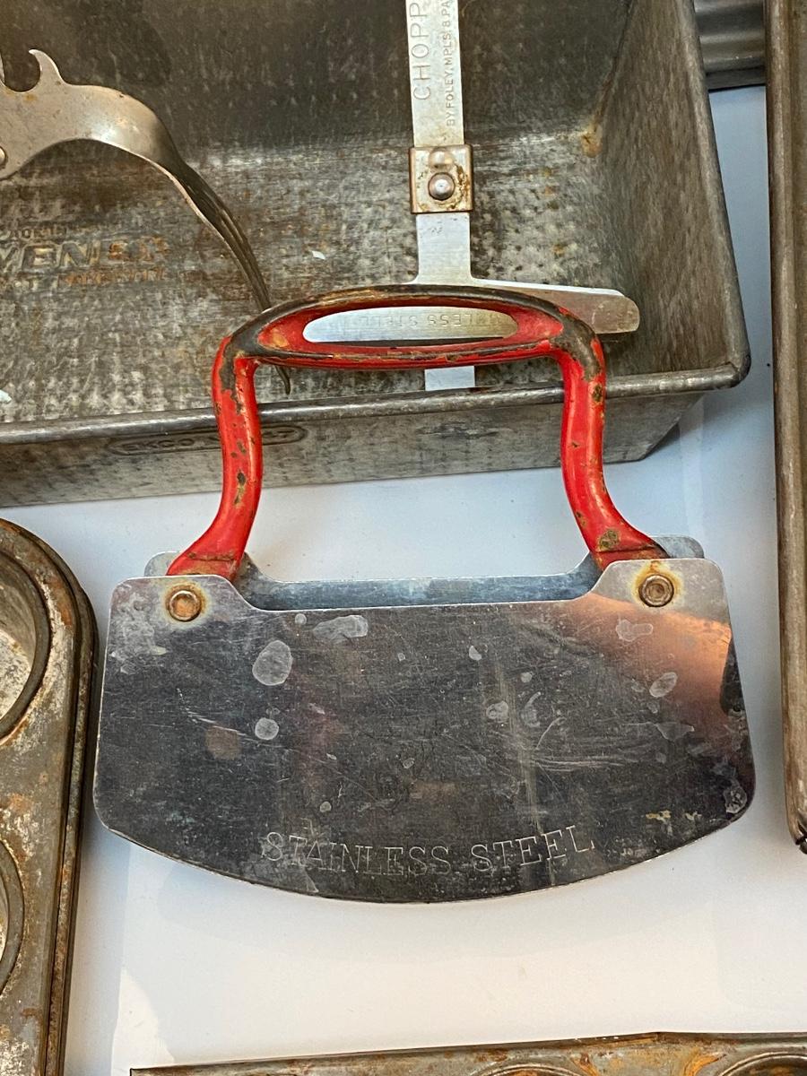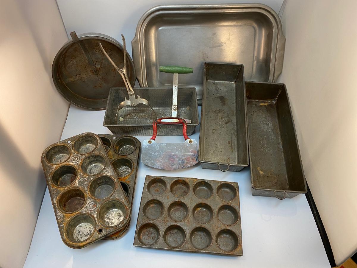 Rustic Vintage Baking Pans and Hand Held Gadgets. In well used condition. Great for rustic farmhouse decor. See photos.