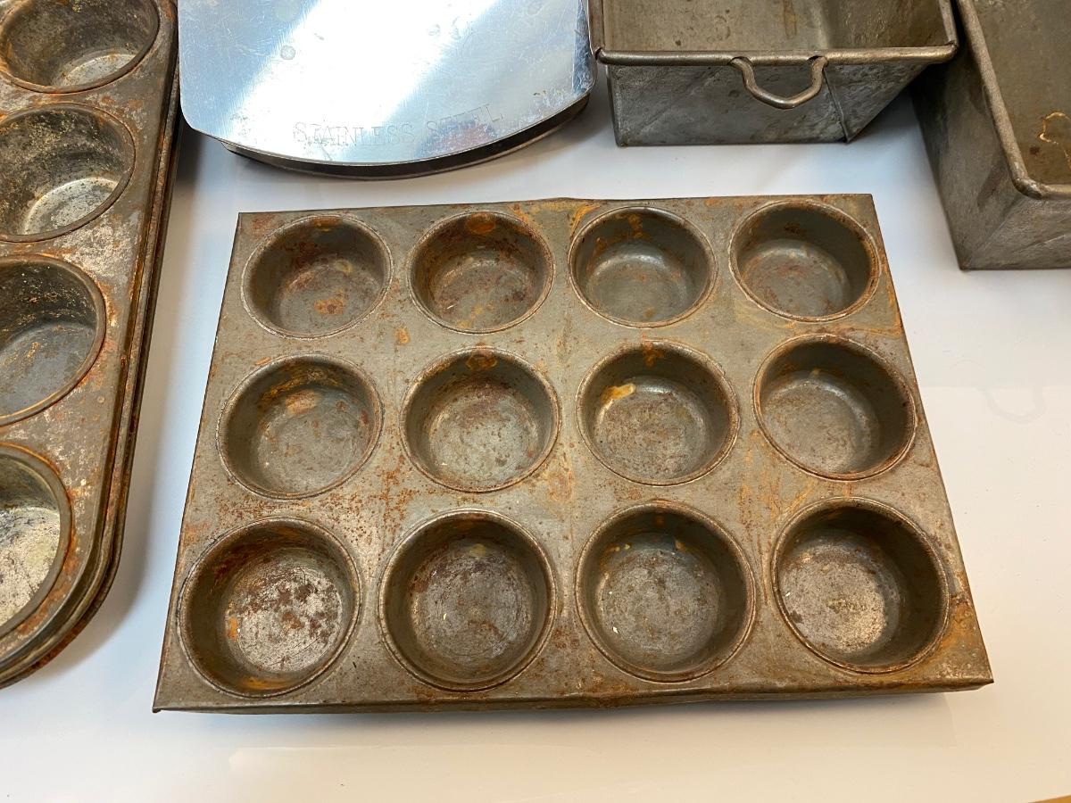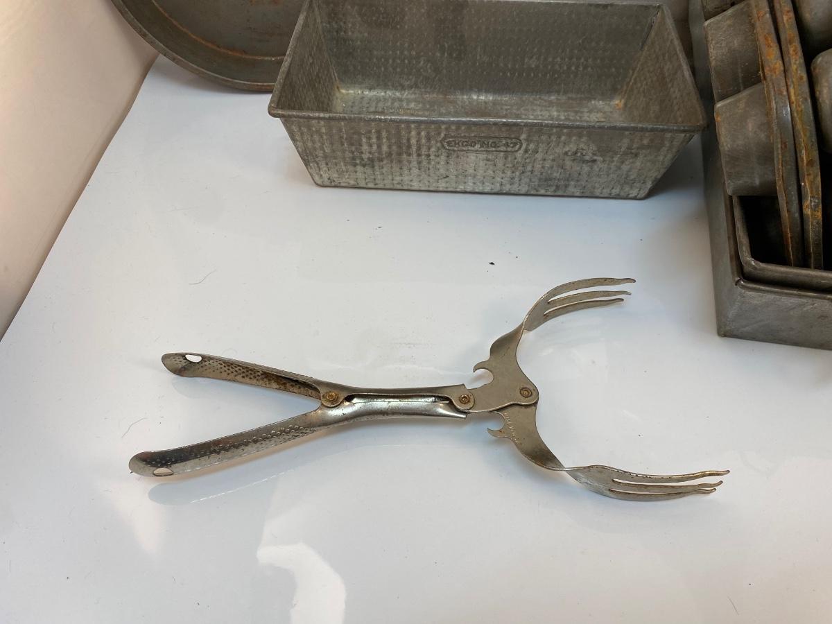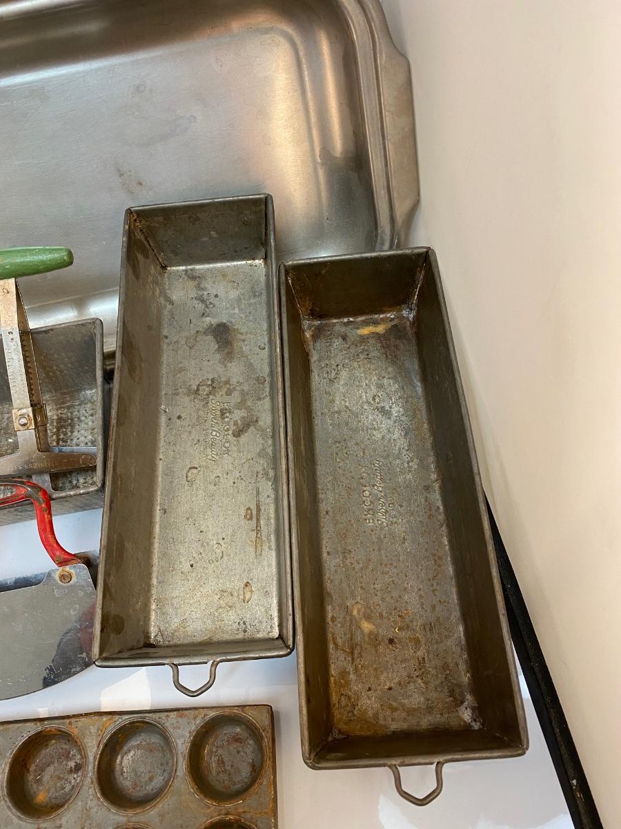 Rustic Vintage Baking Pans and Hand Held Gadgets. In well used condition. Great for rustic farmhouse decor. See photos.