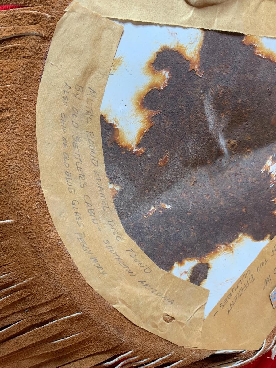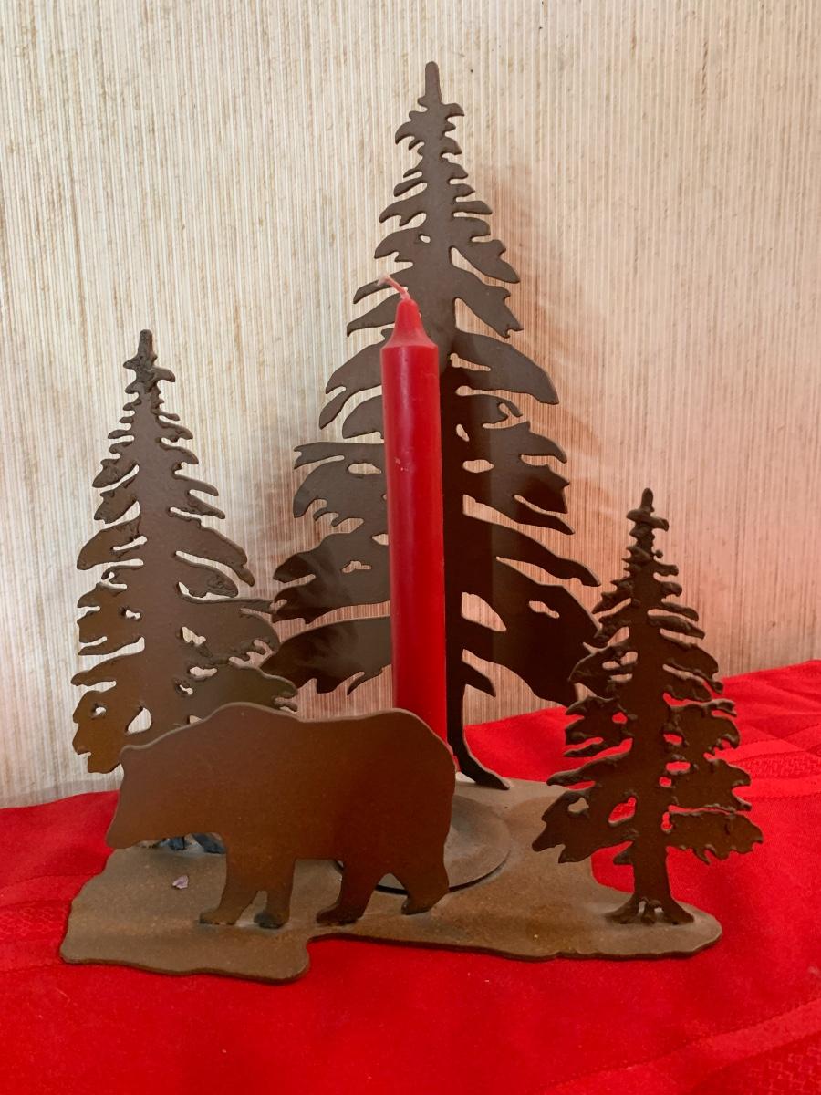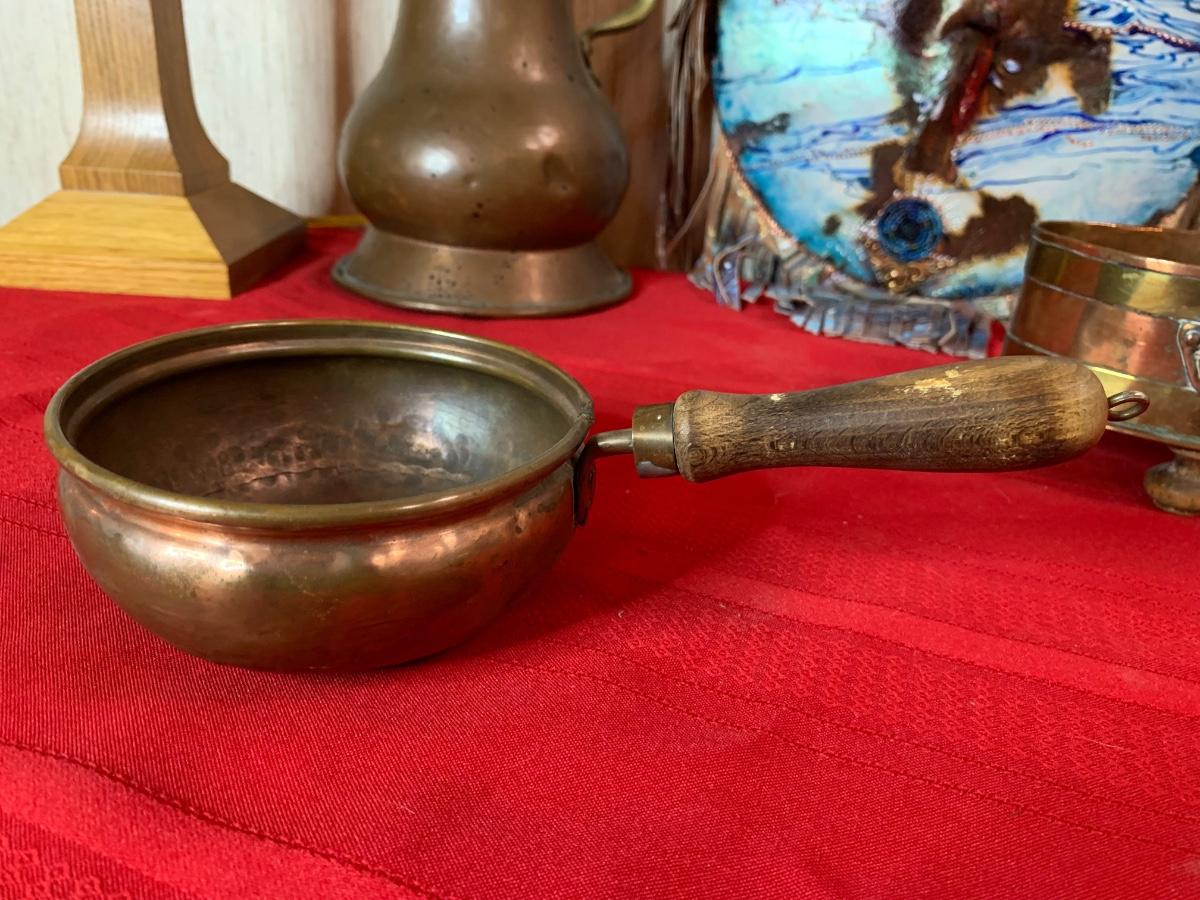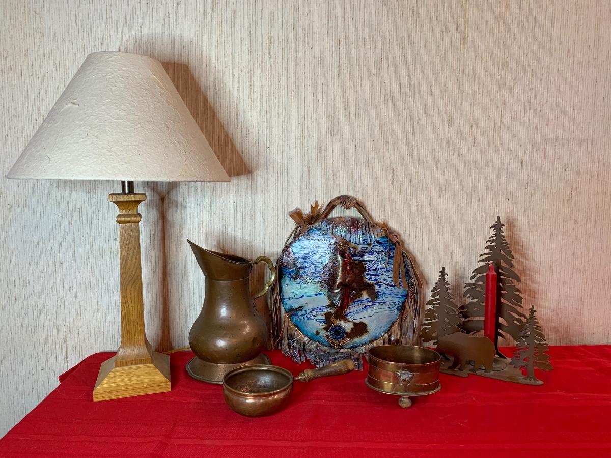 One wooden lamp, one copper small bowl, one copper water pitcher, one bear candle stand decor and one wall hanging with fringe decor piece called “the meeting of two cultures” made in 1997 (round enameled disc found by an old settlers cabin in southern Arizona)
