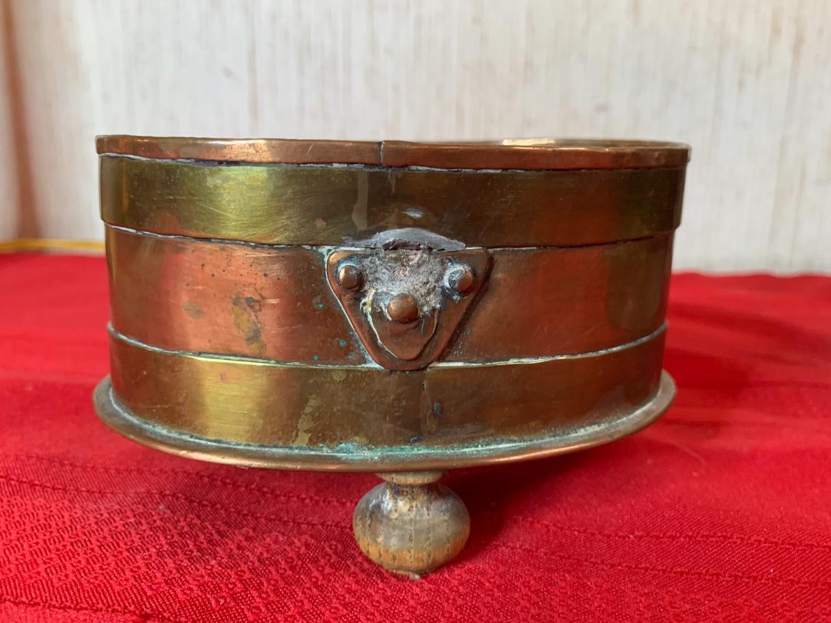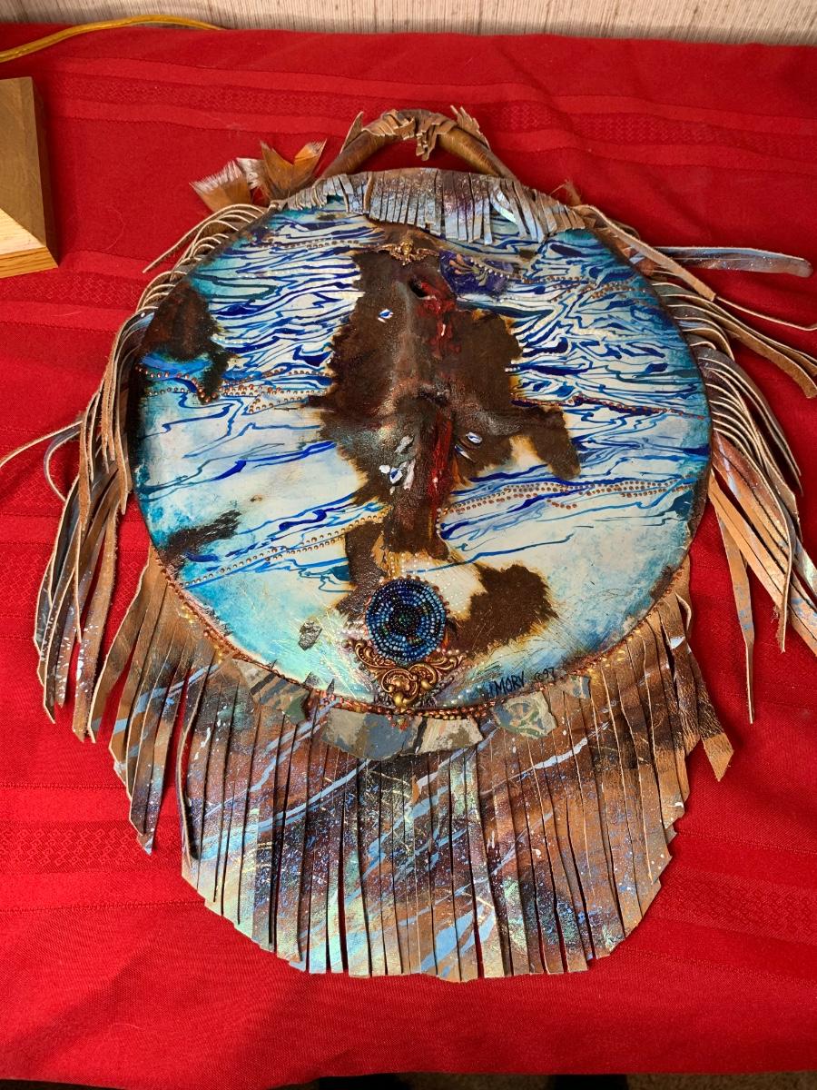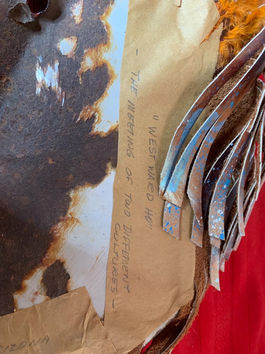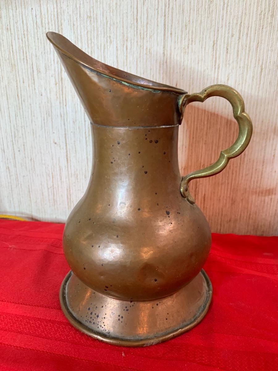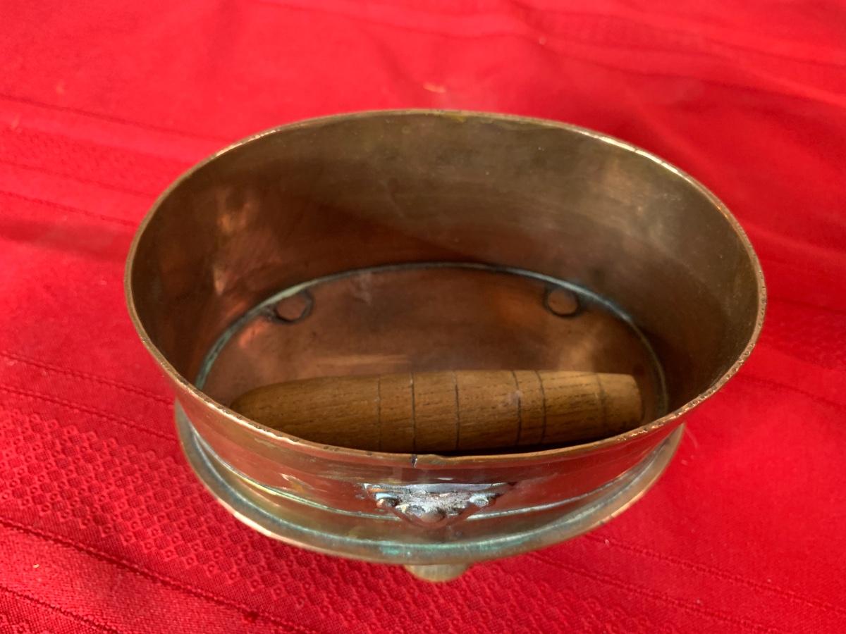 One wooden lamp, one copper small bowl, one copper water pitcher, one bear candle stand decor and one wall hanging with fringe decor piece called “the meeting of two cultures” made in 1997 (round enameled disc found by an old settlers cabin in southern Arizona)