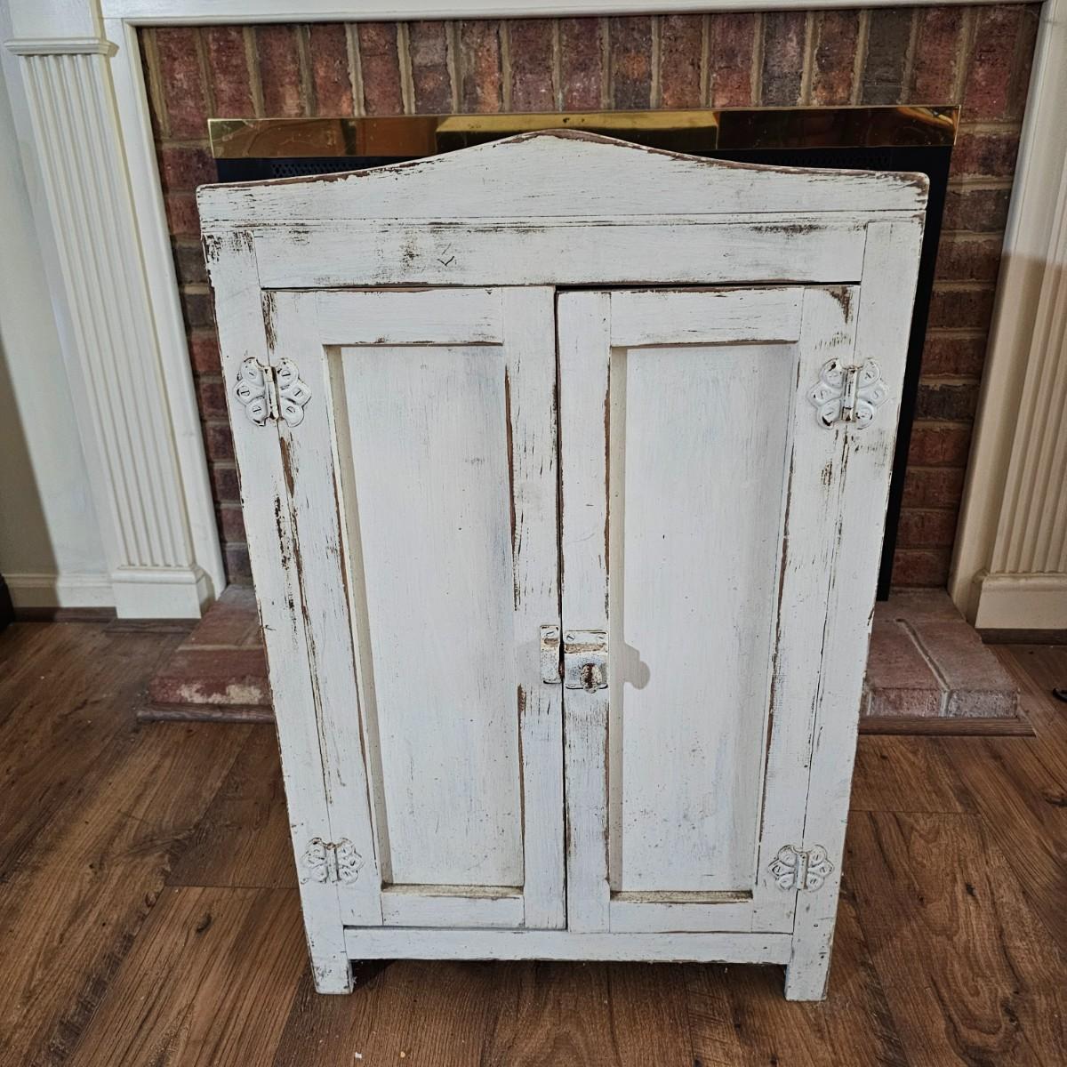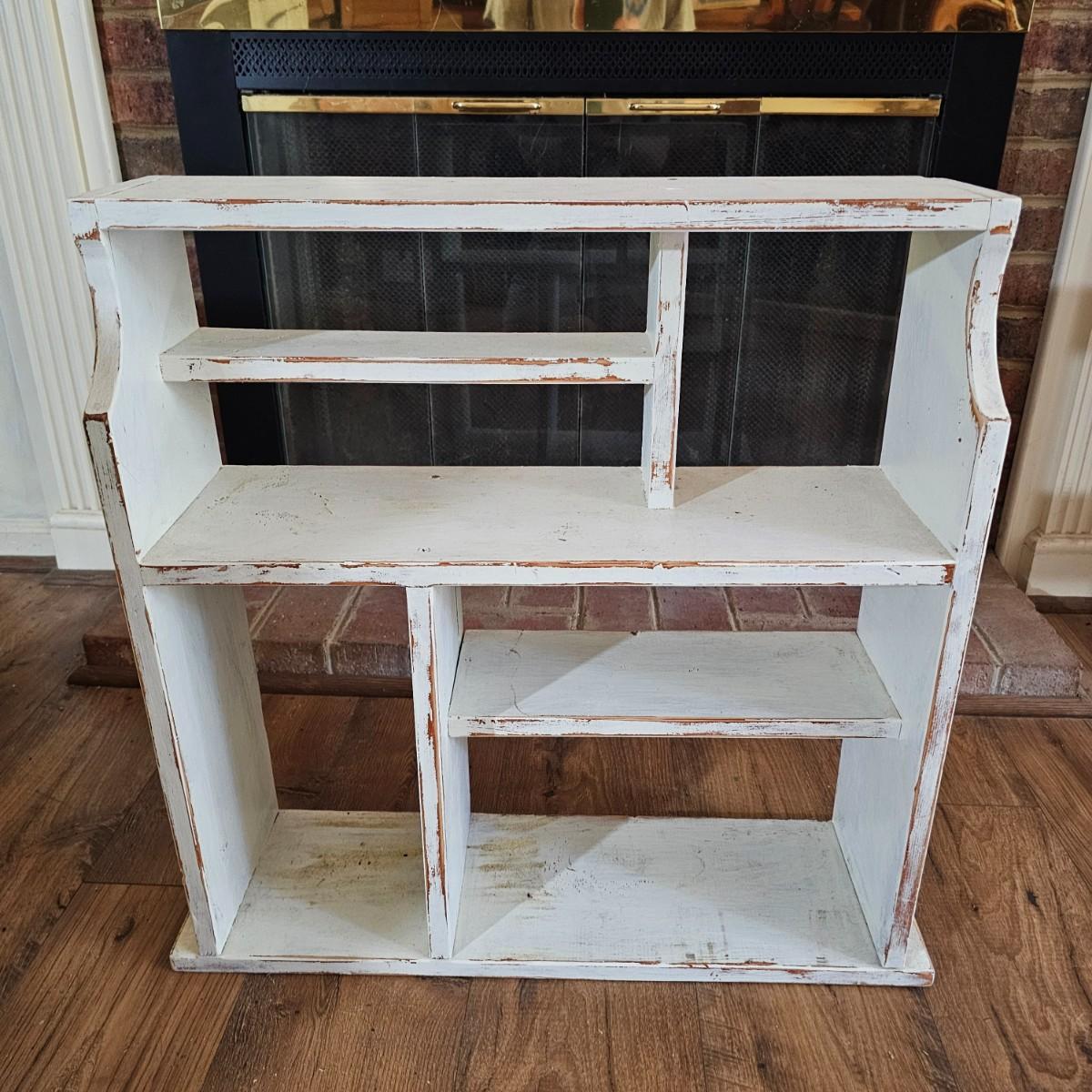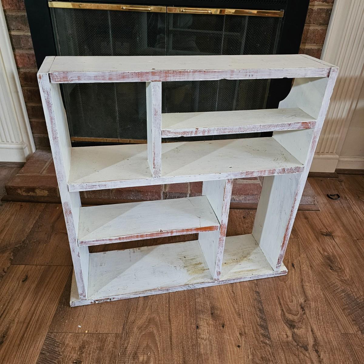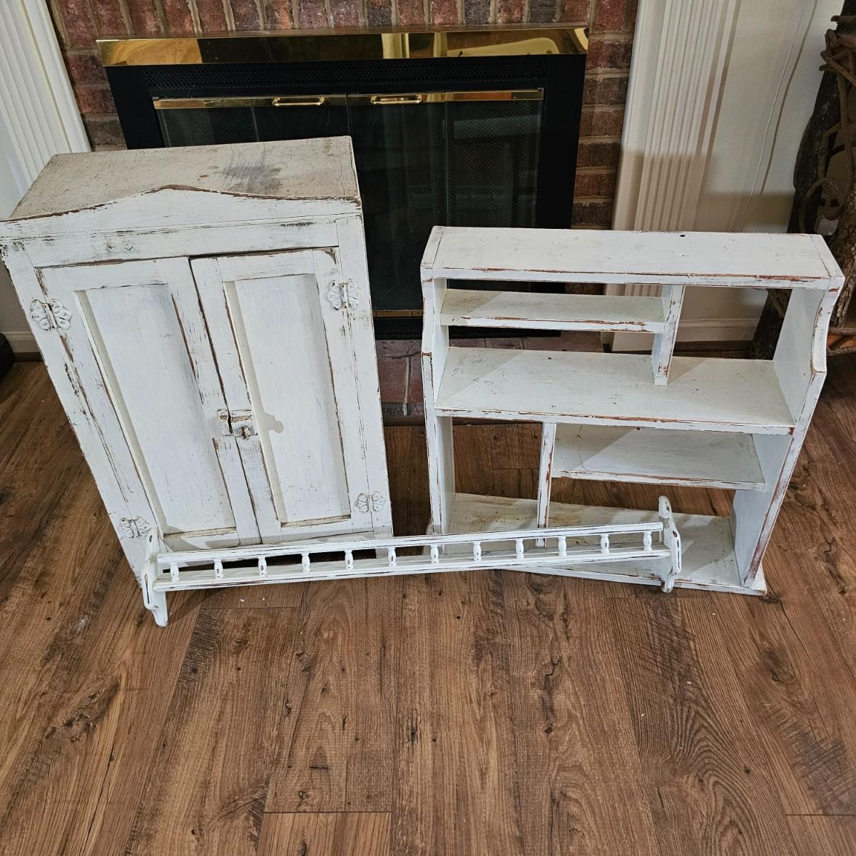 Three pieces of wood furniture items in a rustic, worn style. Cabinet with doors is wood frame with plywood sides and back. Twist lock closure and small interior shelf, this item measures 19.5" x 13" x 30.5"H. Combo shelf unit is solid wood, measures 23.5" x 7" x 25"H. Long skinny shelf is 37.5" x 2.5" x 7"H, has plate groove behind front railing. Paint on all pieces has the distressed look, with sections being sanded or scraped off. See photos for details. Local pickup only.