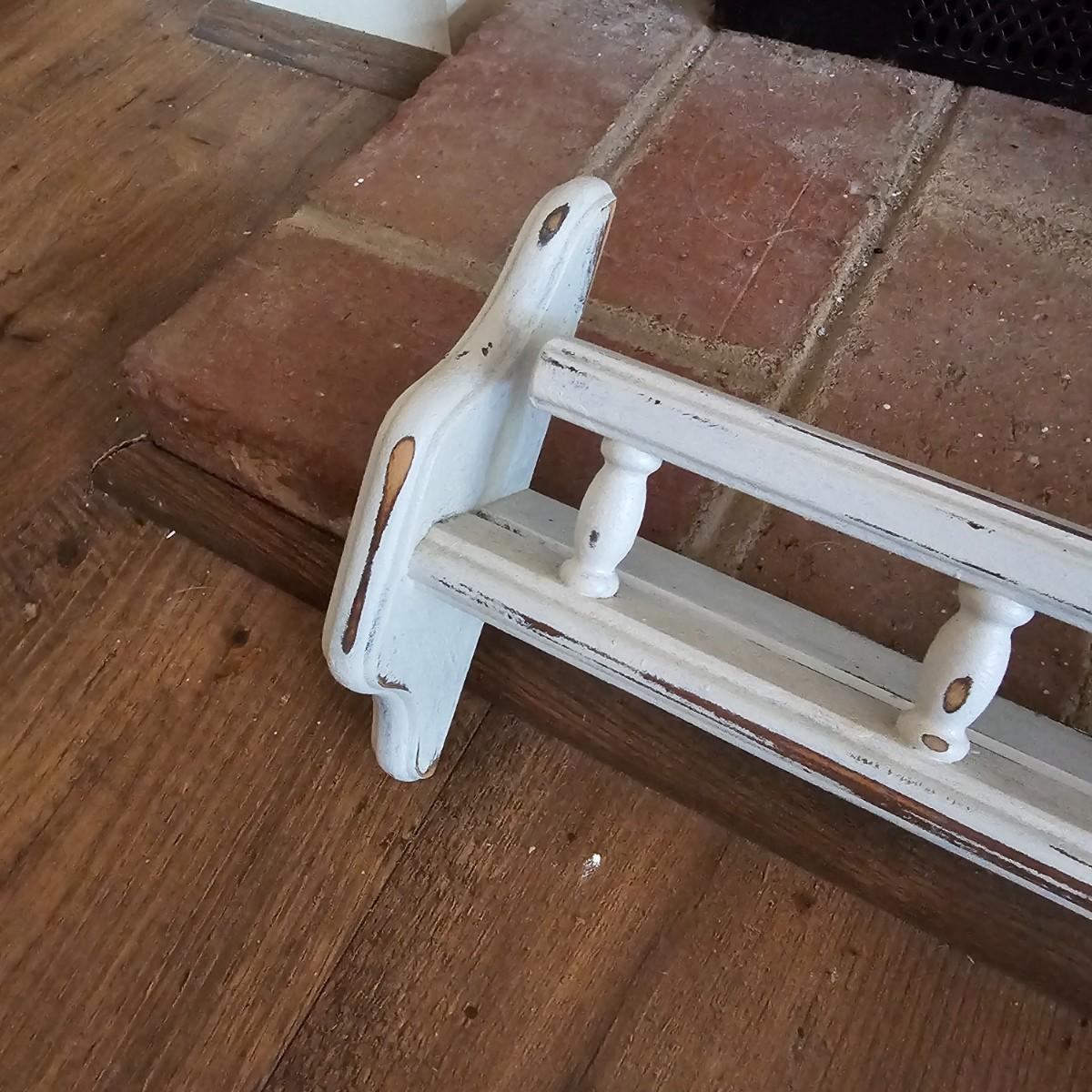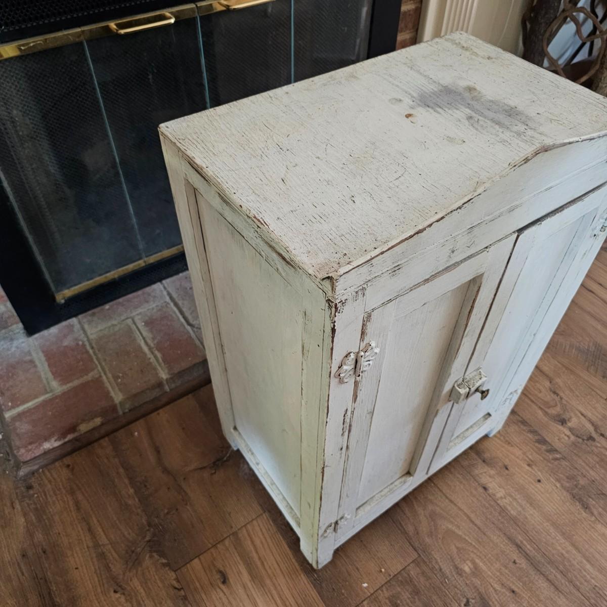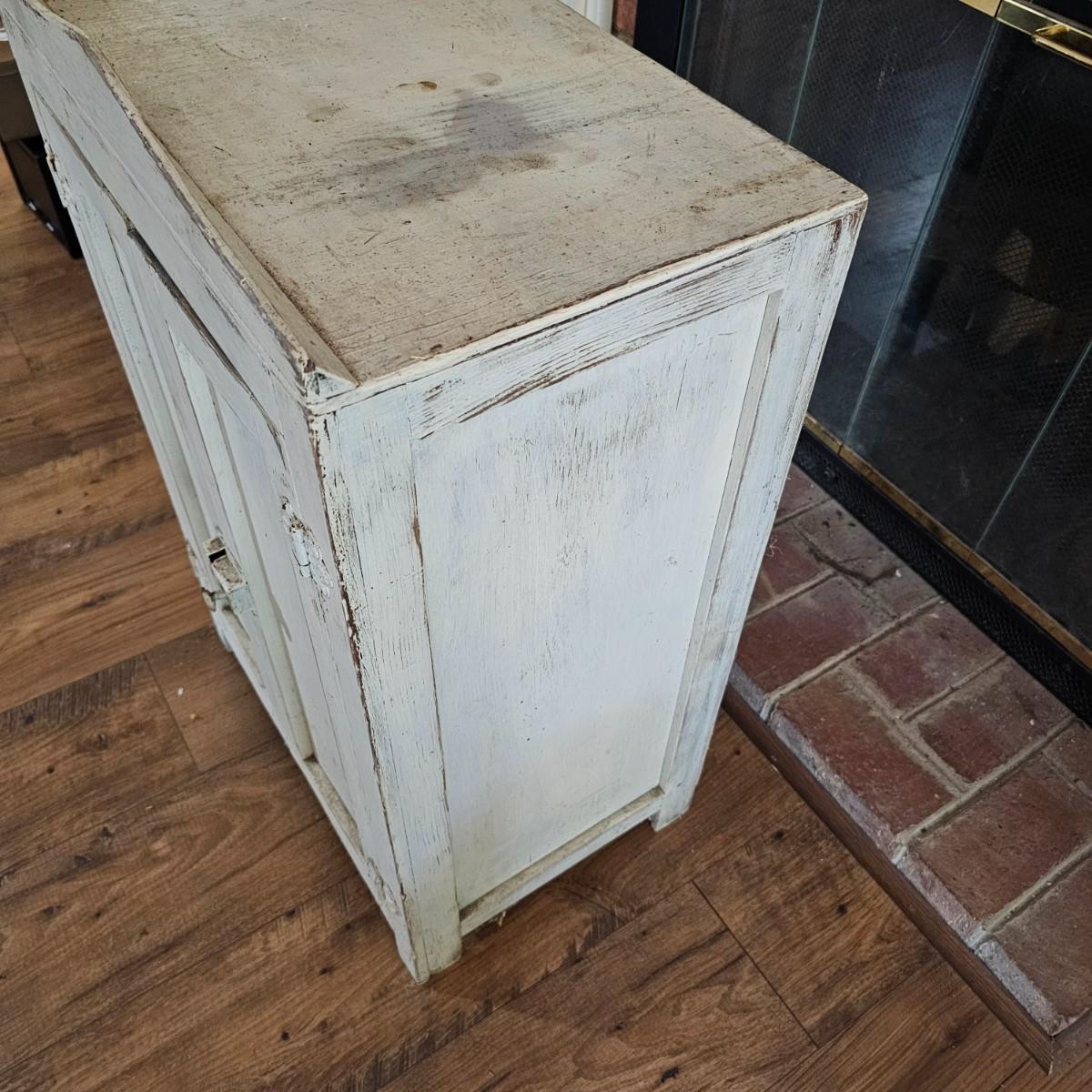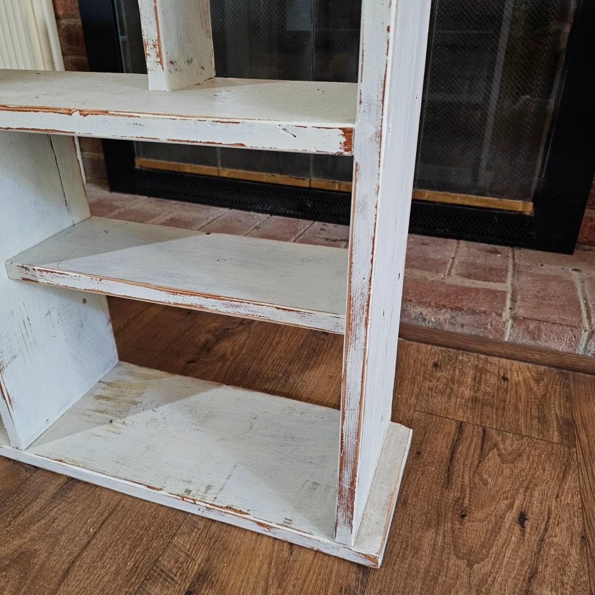Three pieces of wood furniture items in a rustic, worn style. Cabinet with doors is wood frame with plywood sides and back. Twist lock closure and small interior shelf, this item measures 19.5" x 13" x 30.5"H. Combo shelf unit is solid wood, measures 23.5" x 7" x 25"H. Long skinny shelf is 37.5" x 2.5" x 7"H, has plate groove behind front railing. Paint on all pieces has the distressed look, with sections being sanded or scraped off. See photos for details. Local pickup only.