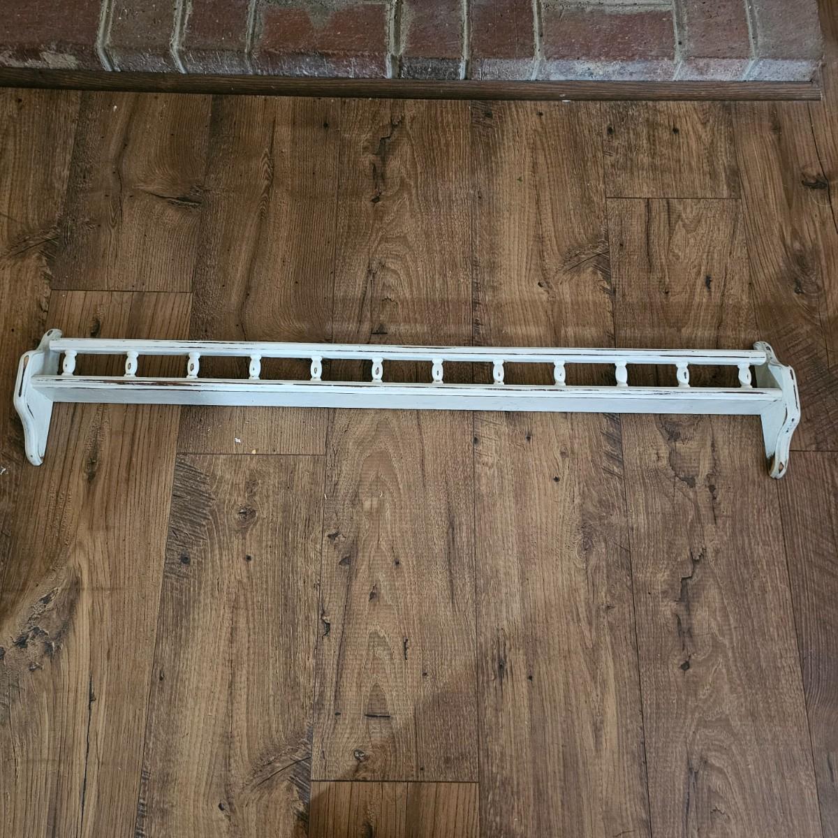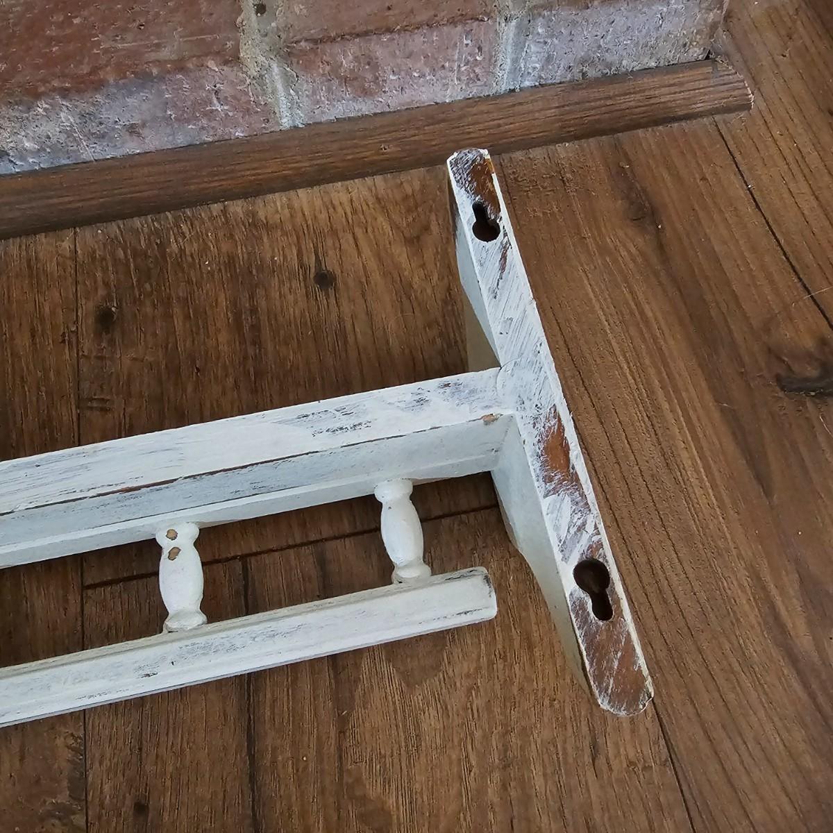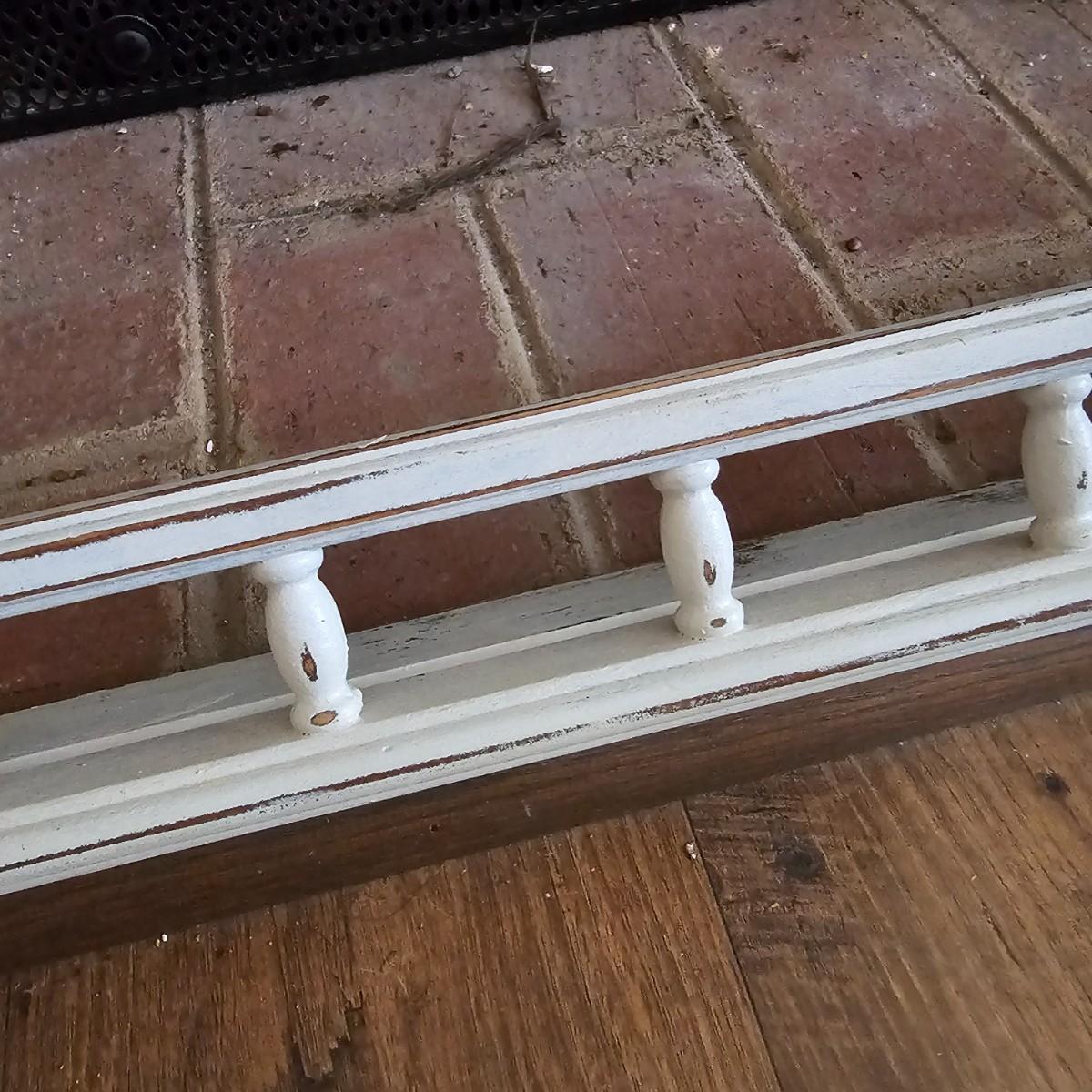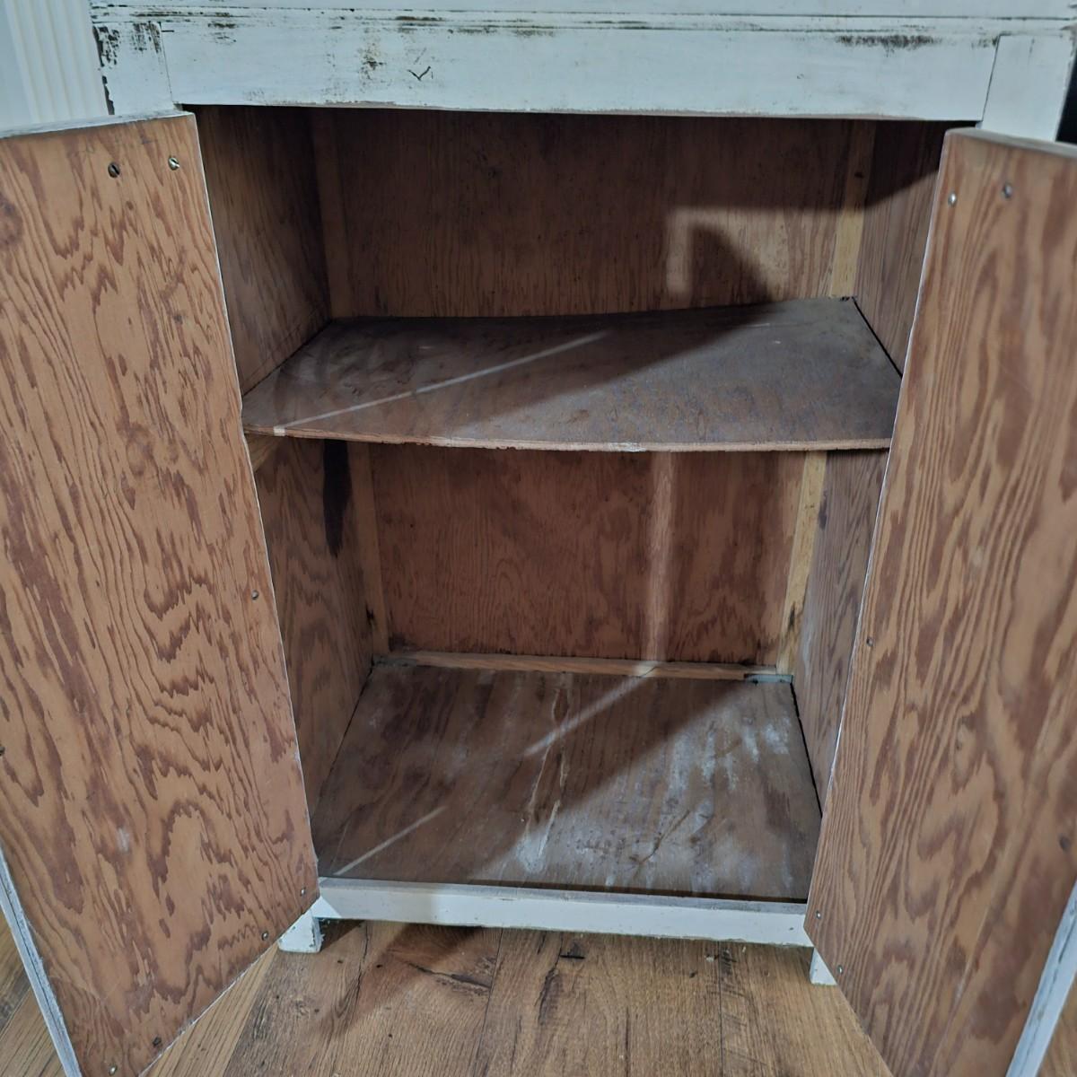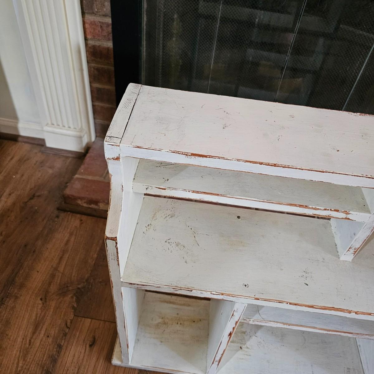 Three pieces of wood furniture items in a rustic, worn style. Cabinet with doors is wood frame with plywood sides and back. Twist lock closure and small interior shelf, this item measures 19.5" x 13" x 30.5"H. Combo shelf unit is solid wood, measures 23.5" x 7" x 25"H. Long skinny shelf is 37.5" x 2.5" x 7"H, has plate groove behind front railing. Paint on all pieces has the distressed look, with sections being sanded or scraped off. See photos for details. Local pickup only.