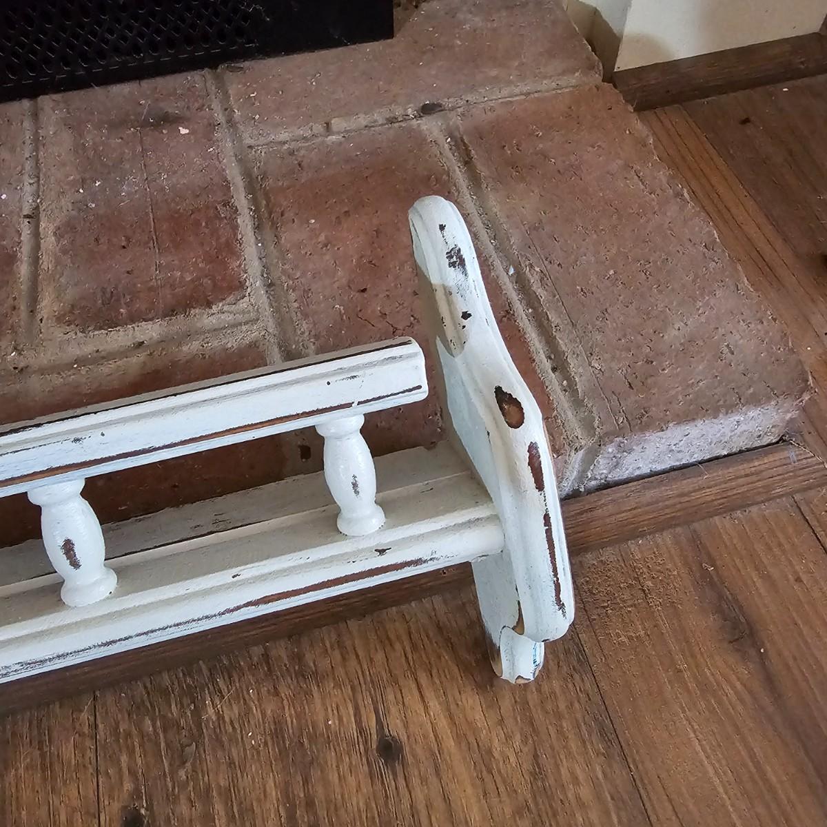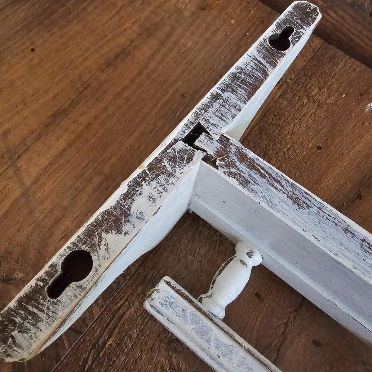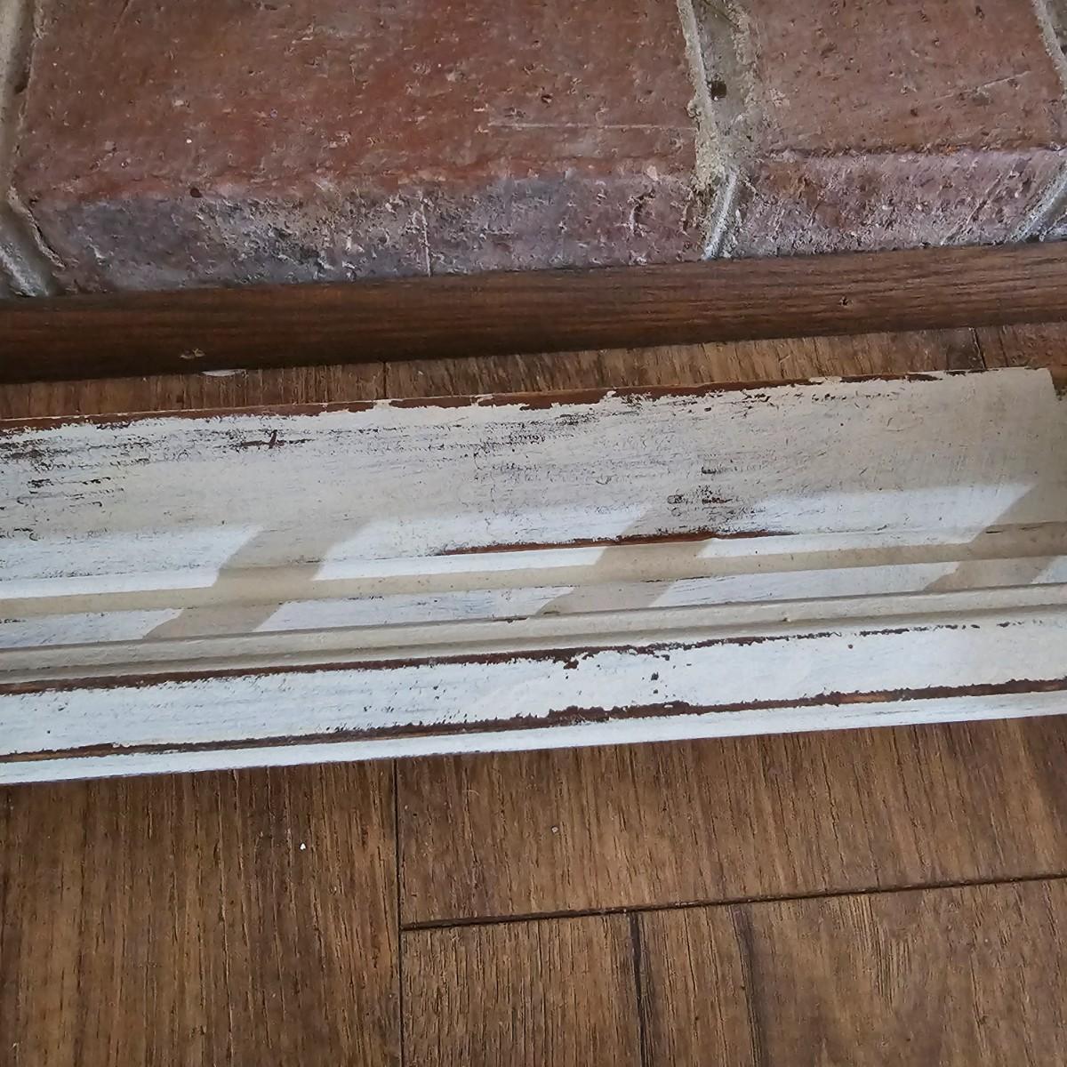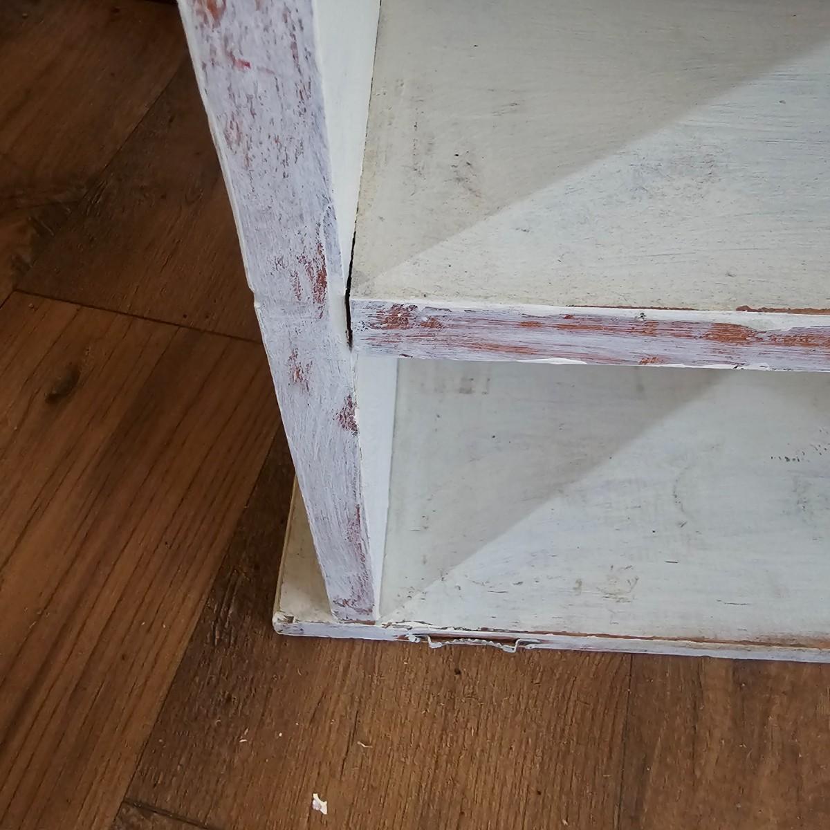 Three pieces of wood furniture items in a rustic, worn style. Cabinet with doors is wood frame with plywood sides and back. Twist lock closure and small interior shelf, this item measures 19.5" x 13" x 30.5"H. Combo shelf unit is solid wood, measures 23.5" x 7" x 25"H. Long skinny shelf is 37.5" x 2.5" x 7"H, has plate groove behind front railing. Paint on all pieces has the distressed look, with sections being sanded or scraped off. See photos for details. Local pickup only.