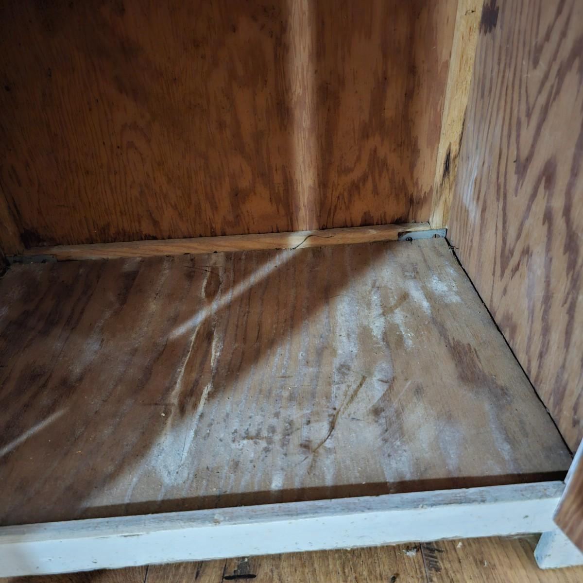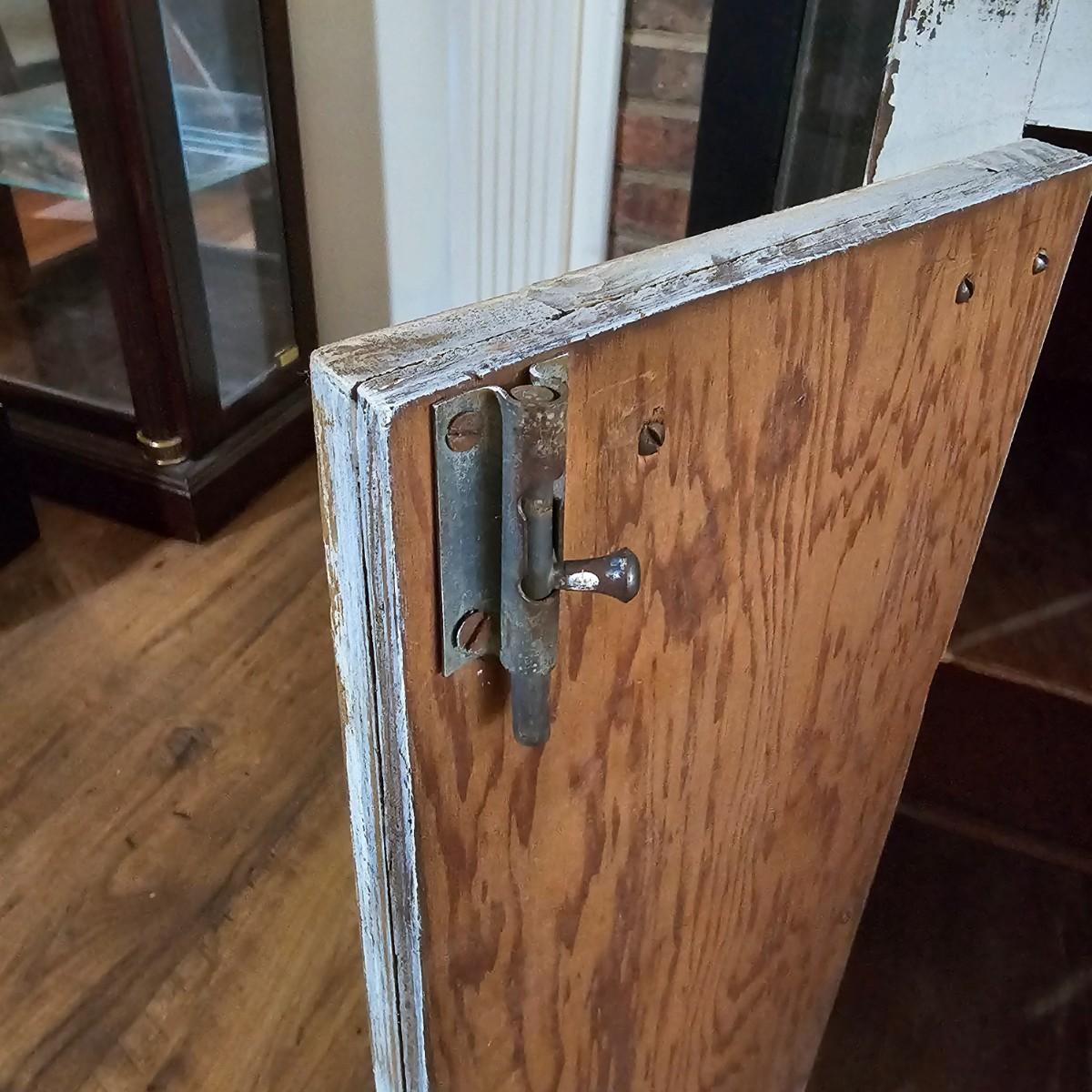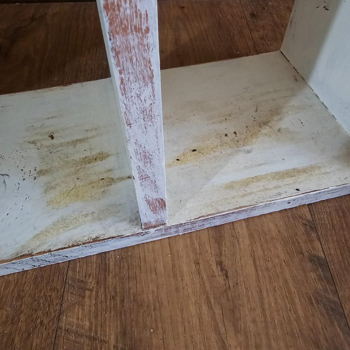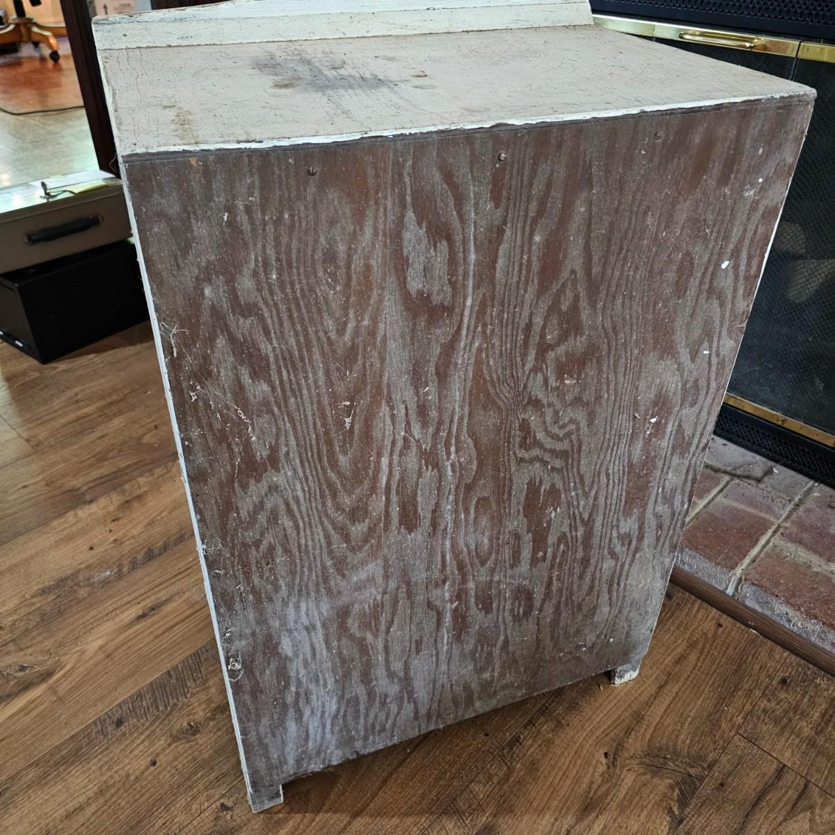 Three pieces of wood furniture items in a rustic, worn style. Cabinet with doors is wood frame with plywood sides and back. Twist lock closure and small interior shelf, this item measures 19.5" x 13" x 30.5"H. Combo shelf unit is solid wood, measures 23.5" x 7" x 25"H. Long skinny shelf is 37.5" x 2.5" x 7"H, has plate groove behind front railing. Paint on all pieces has the distressed look, with sections being sanded or scraped off. See photos for details. Local pickup only.
