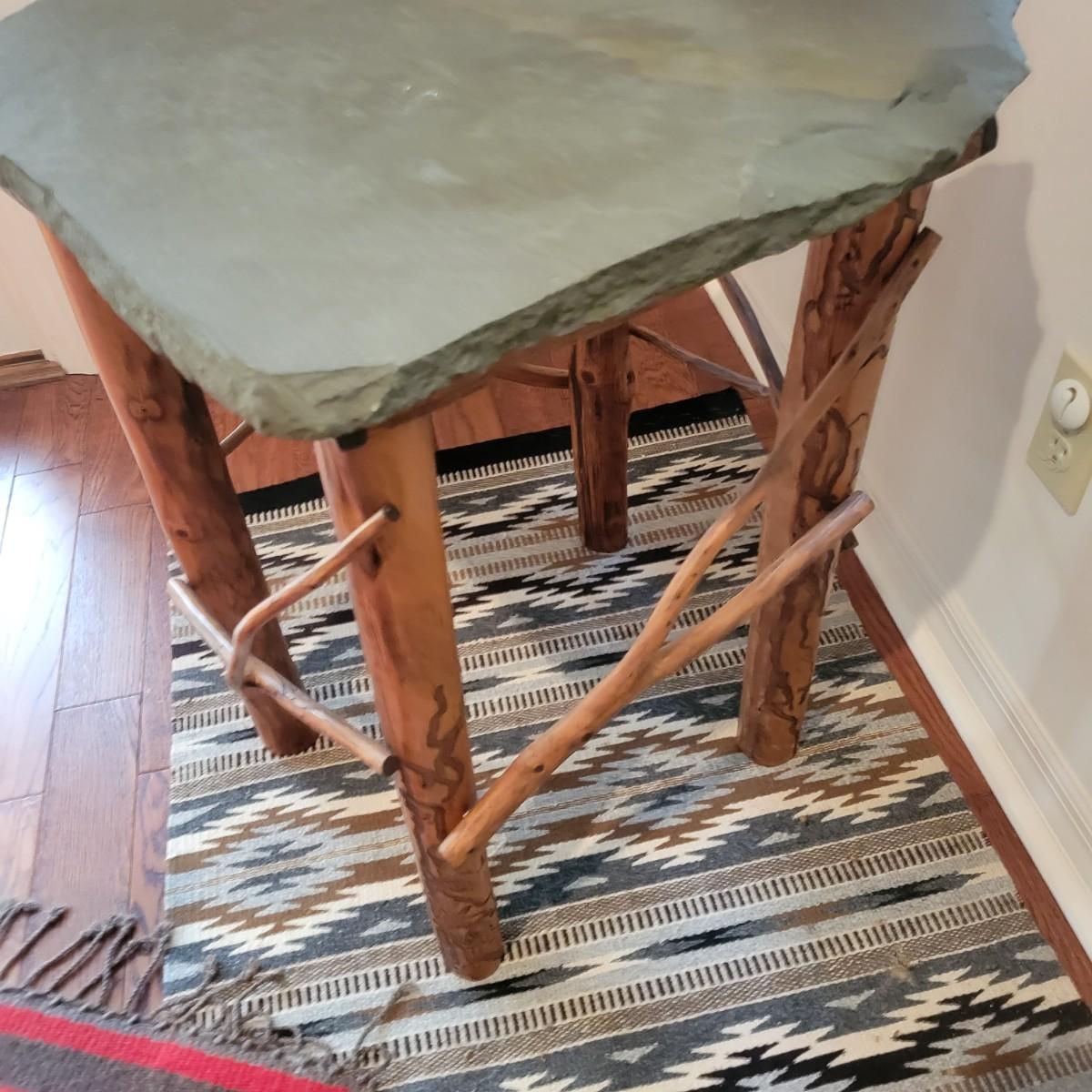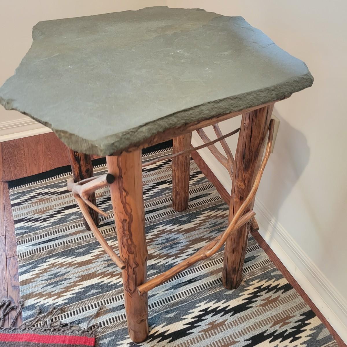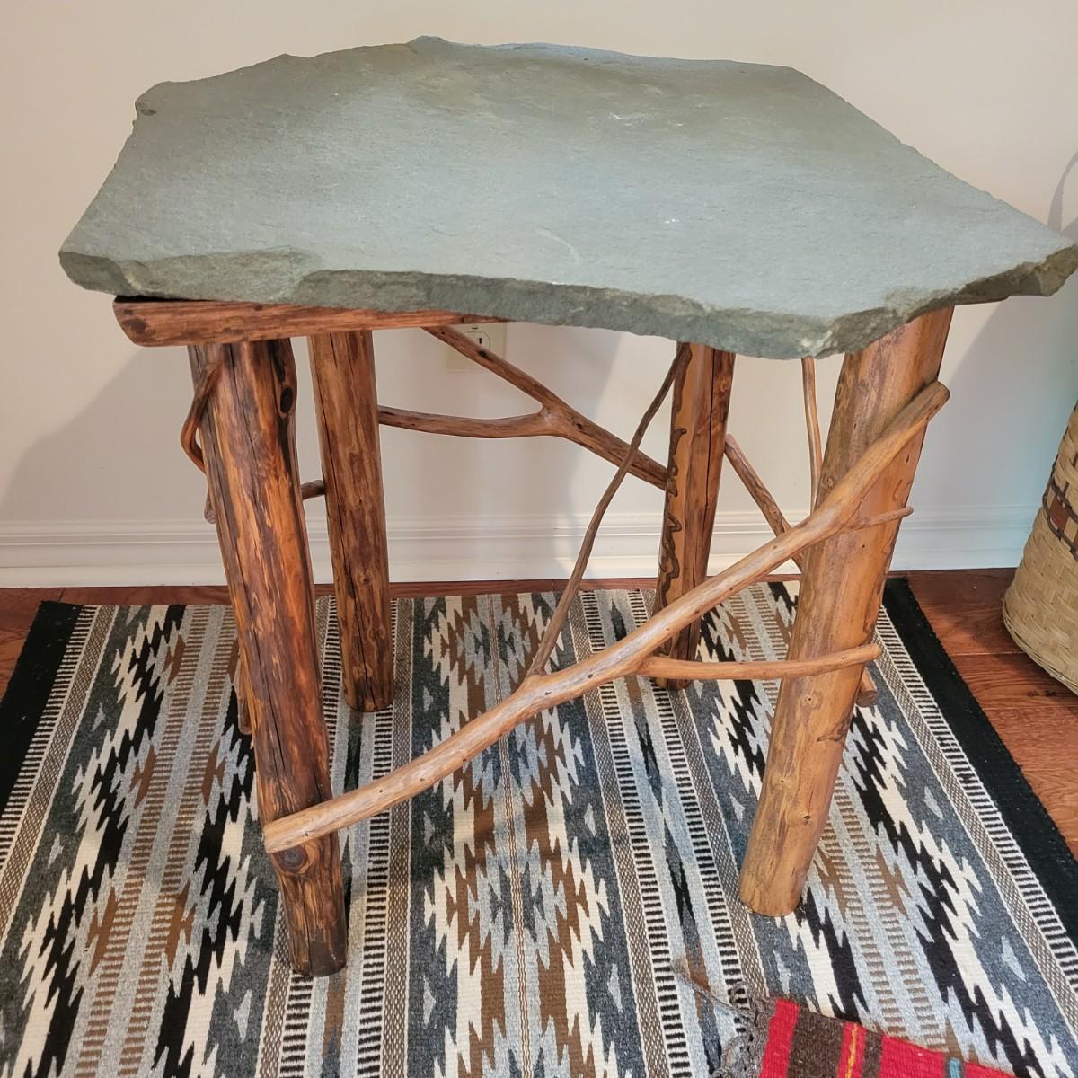 A rustic, raw wood side table with a slate top. This piece features raw wood legs and branches for accents that have a medium brown stain. It also has an irregular shaped slate top. This piece measures approximately 22" x 22" x 25.5"H. Local pickup only
