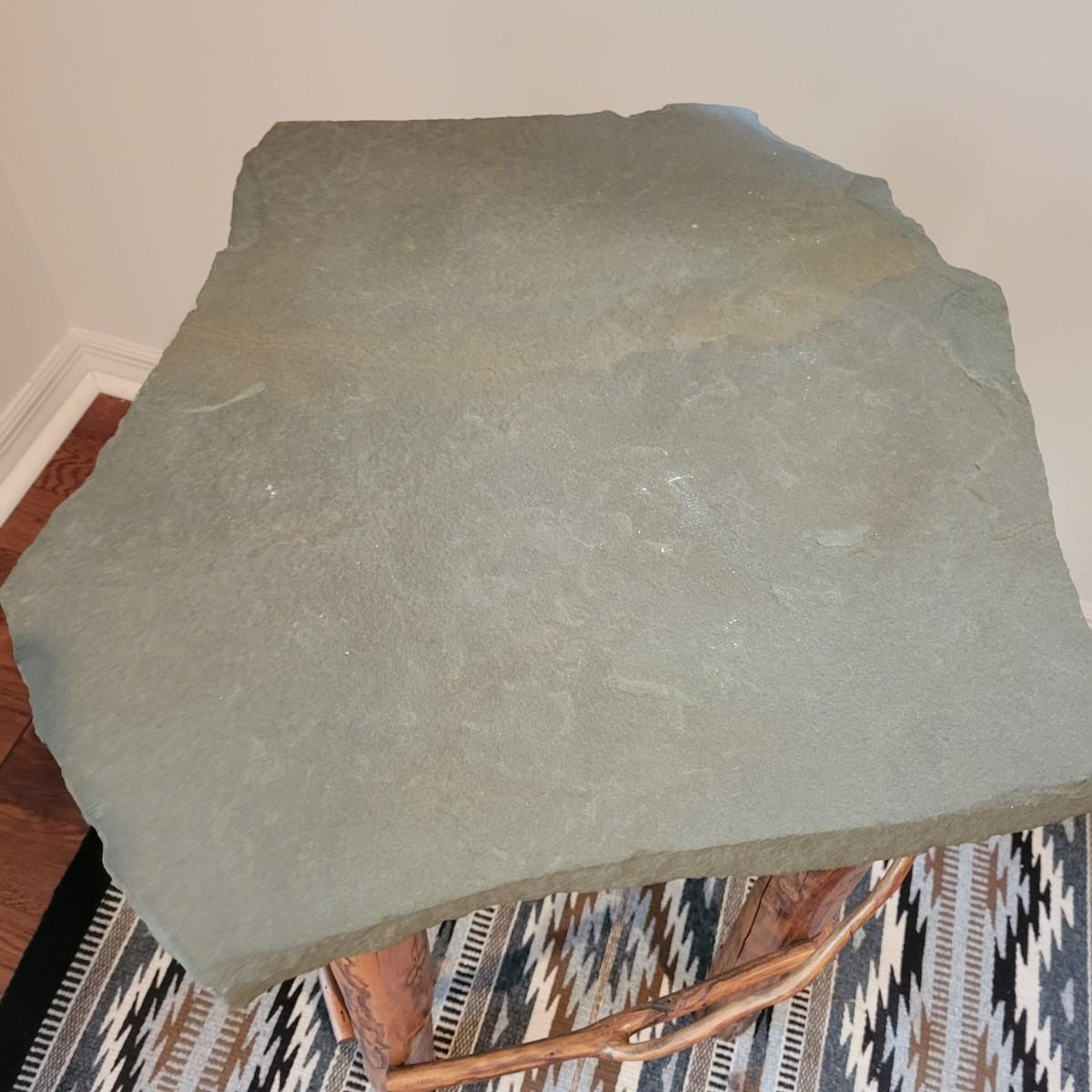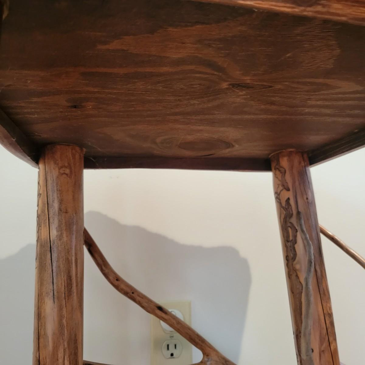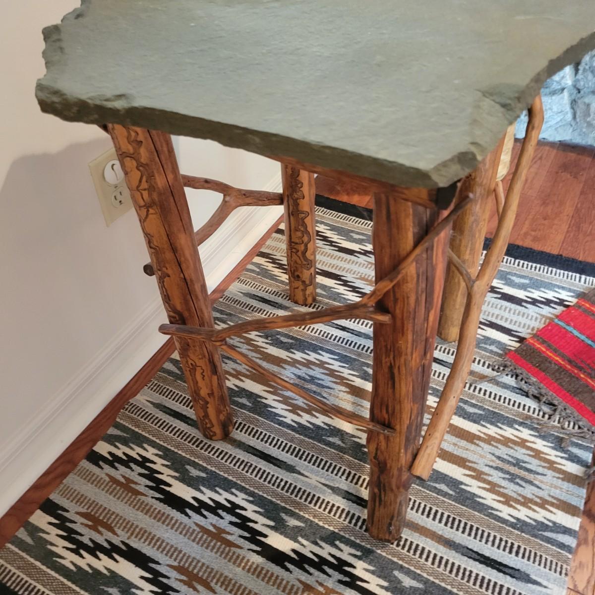A rustic, raw wood side table with a slate top. This piece features raw wood legs and branches for accents that have a medium brown stain. It also has an irregular shaped slate top. This piece measures approximately 22" x 22" x 25.5"H. Local pickup only
