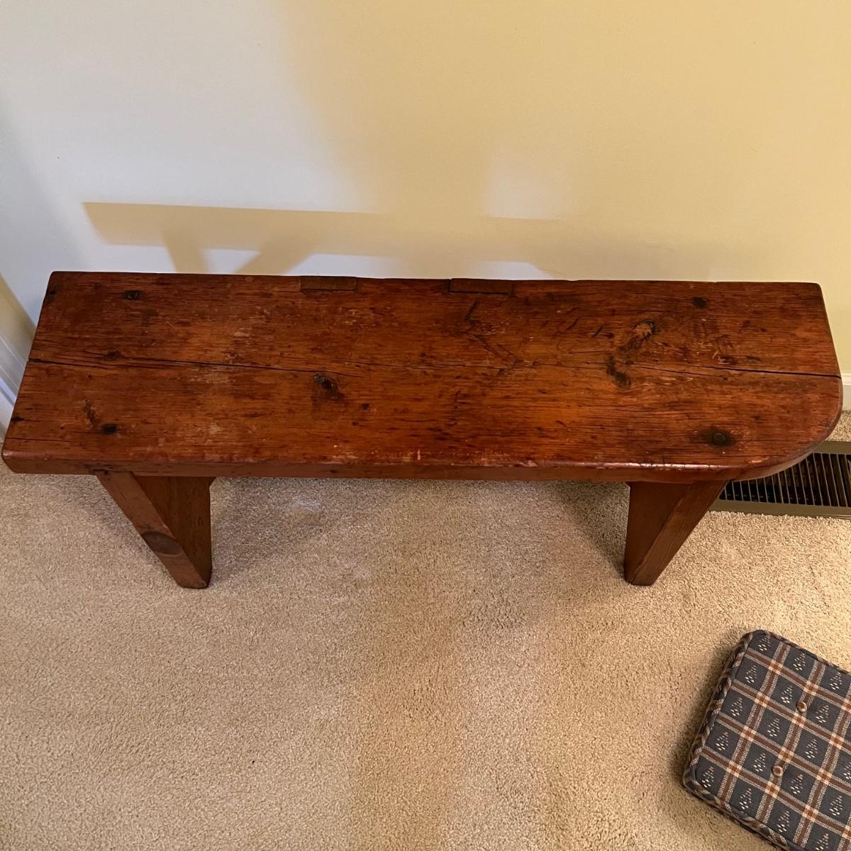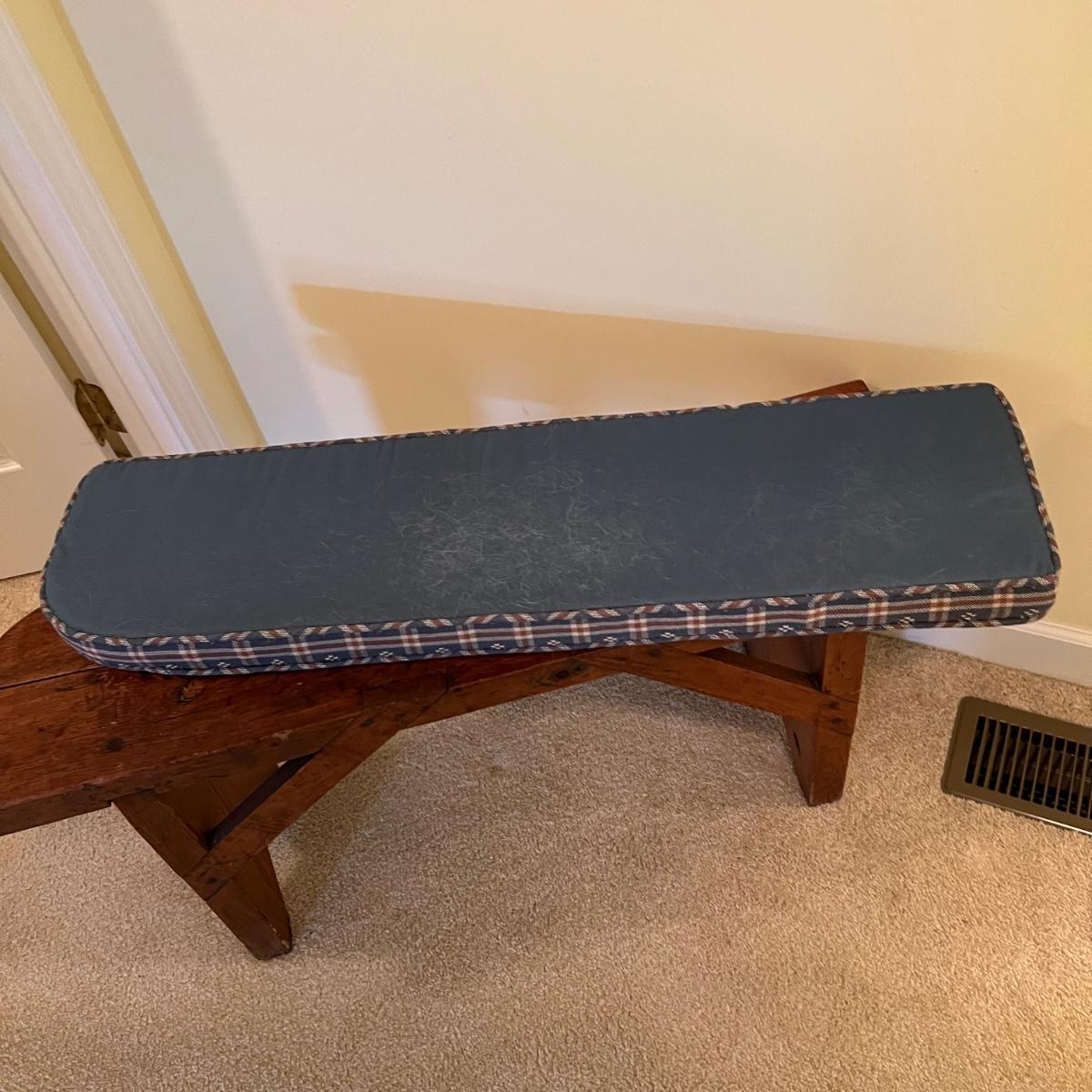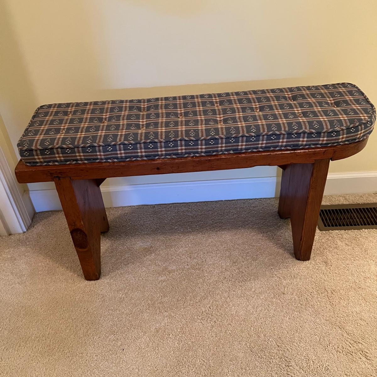 Plenty of character in this lovely small solid wood bench. It has some separating of wood in places that add to its charm, see images. It comes with a padded and upholstered seat cushion that is a blue checkered fabric.