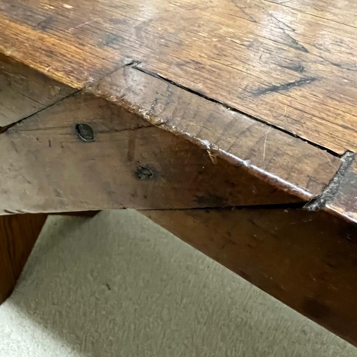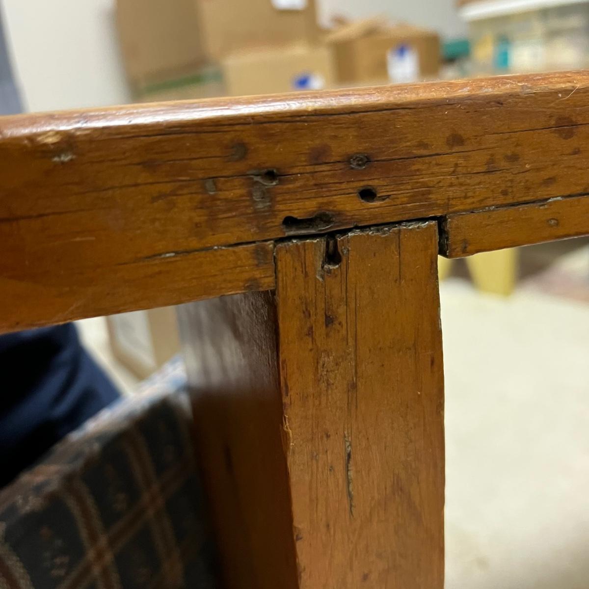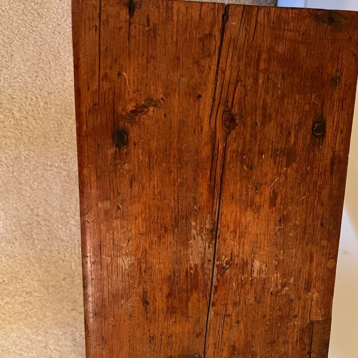 Plenty of character in this lovely small solid wood bench. It has some separating of wood in places that add to its charm, see images. It comes with a padded and upholstered seat cushion that is a blue checkered fabric.