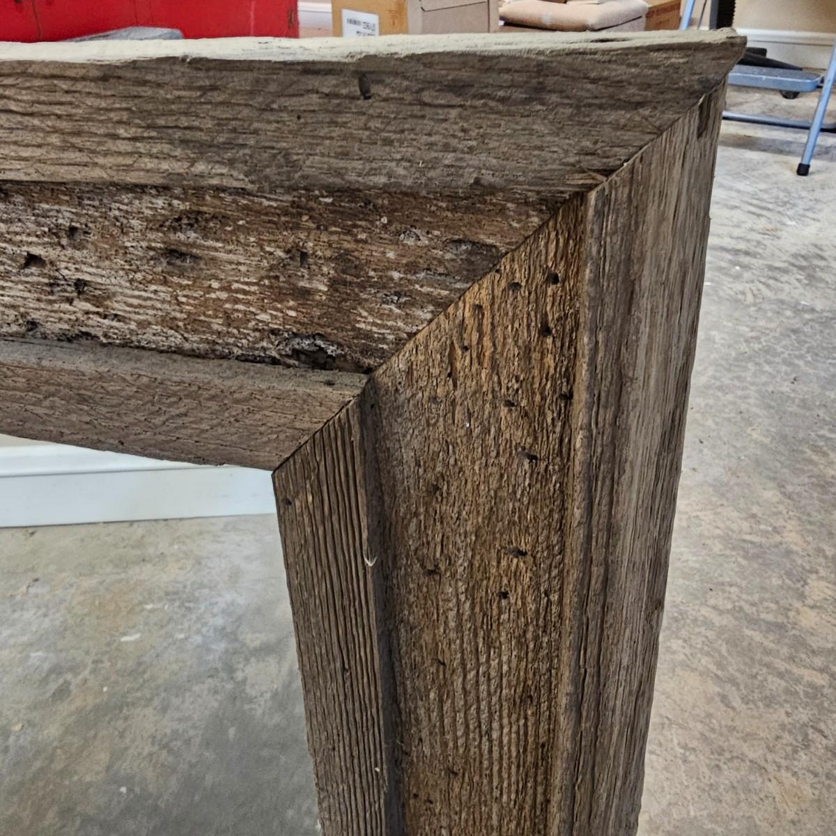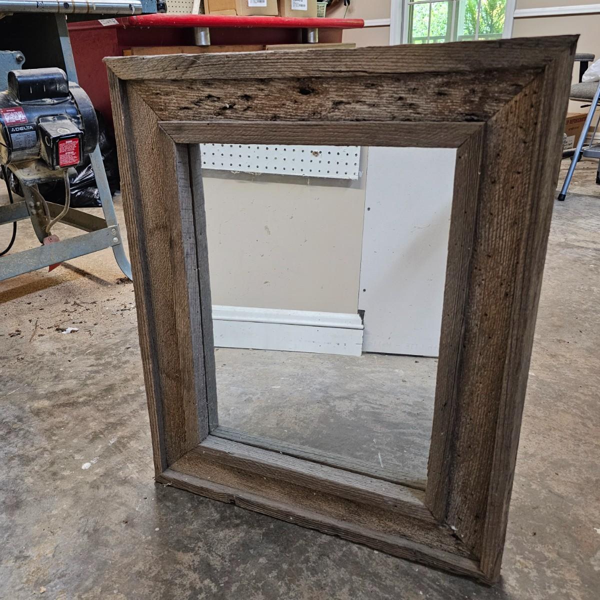 A wood framed mirror that appears to be old barn wood. Mirror measures 24" x 28". Definitely rustic appeal, see photos for details. Shipping available. Shipping can be costly. We suggest contacting our preferred local shipping provider, Postage Express, with dimensions and getting an estimate before bidding: (828) 670-5501 or postageexpress@yahoo.com.