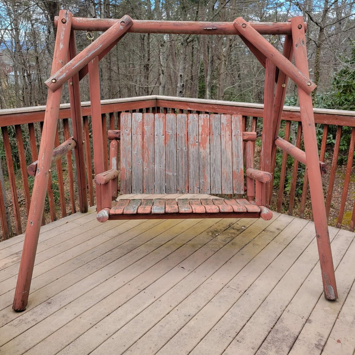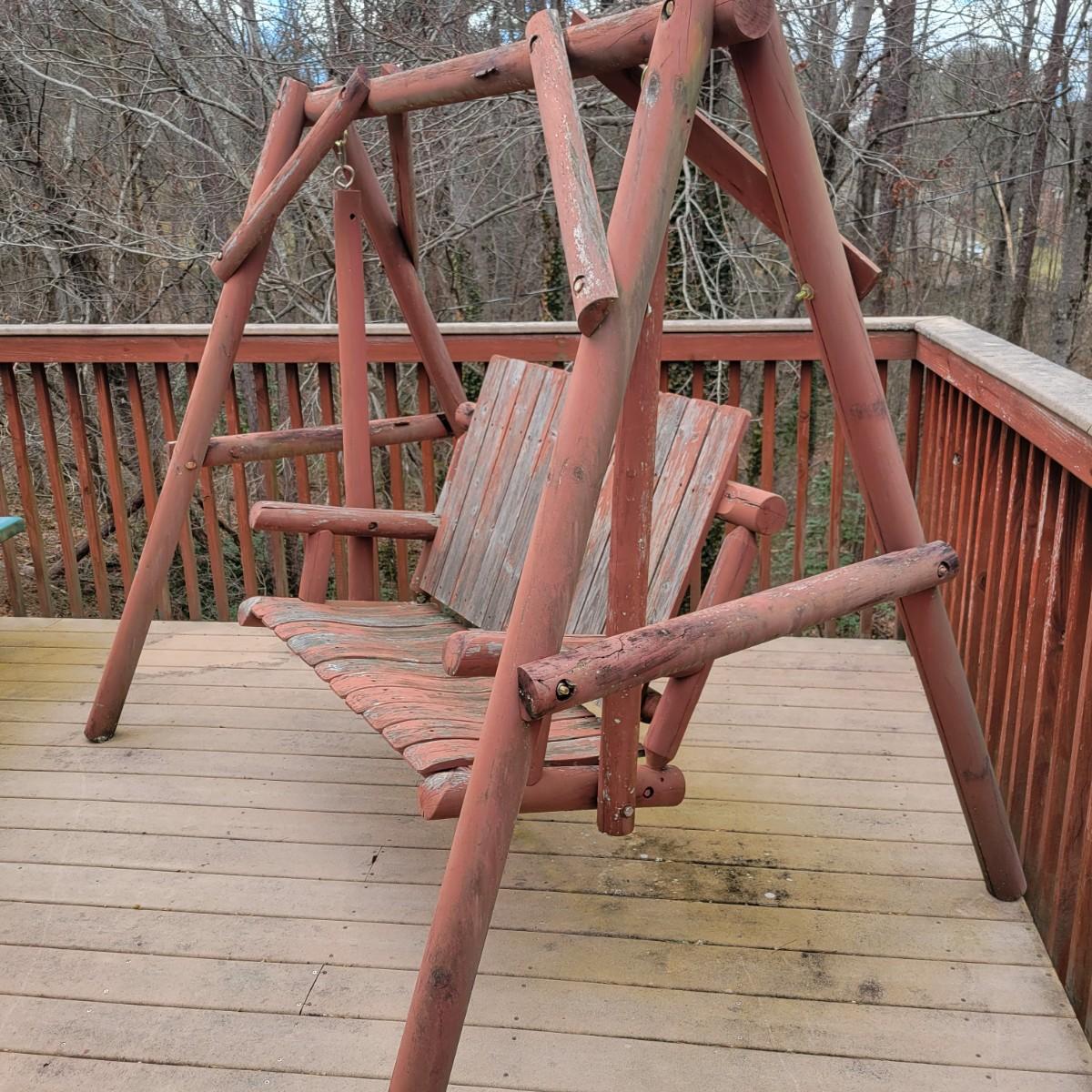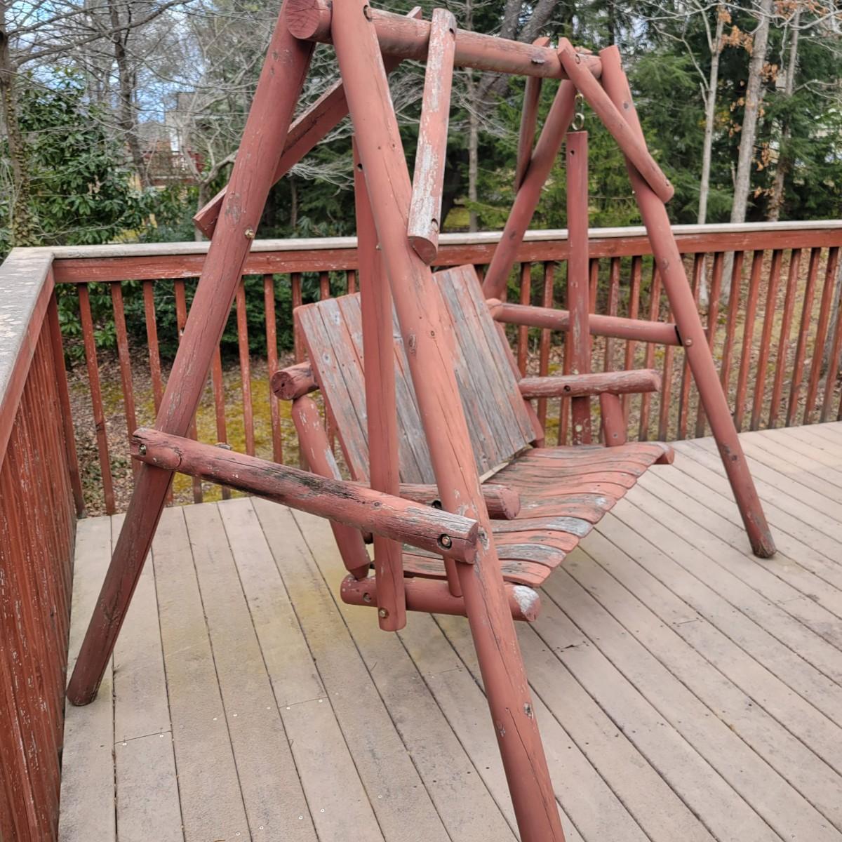 A rustic free standing swing with faded red paint. Some paint has weathered off, but swing is still structurally sound. Measures approximately 80" x 60" x 69". With 19” seat height. Local pickup only. Winning bidder must bring assistance to help move and load this item due to its weight and/or size.