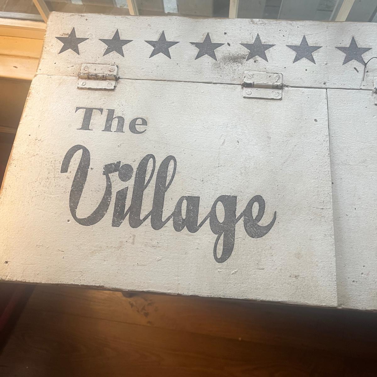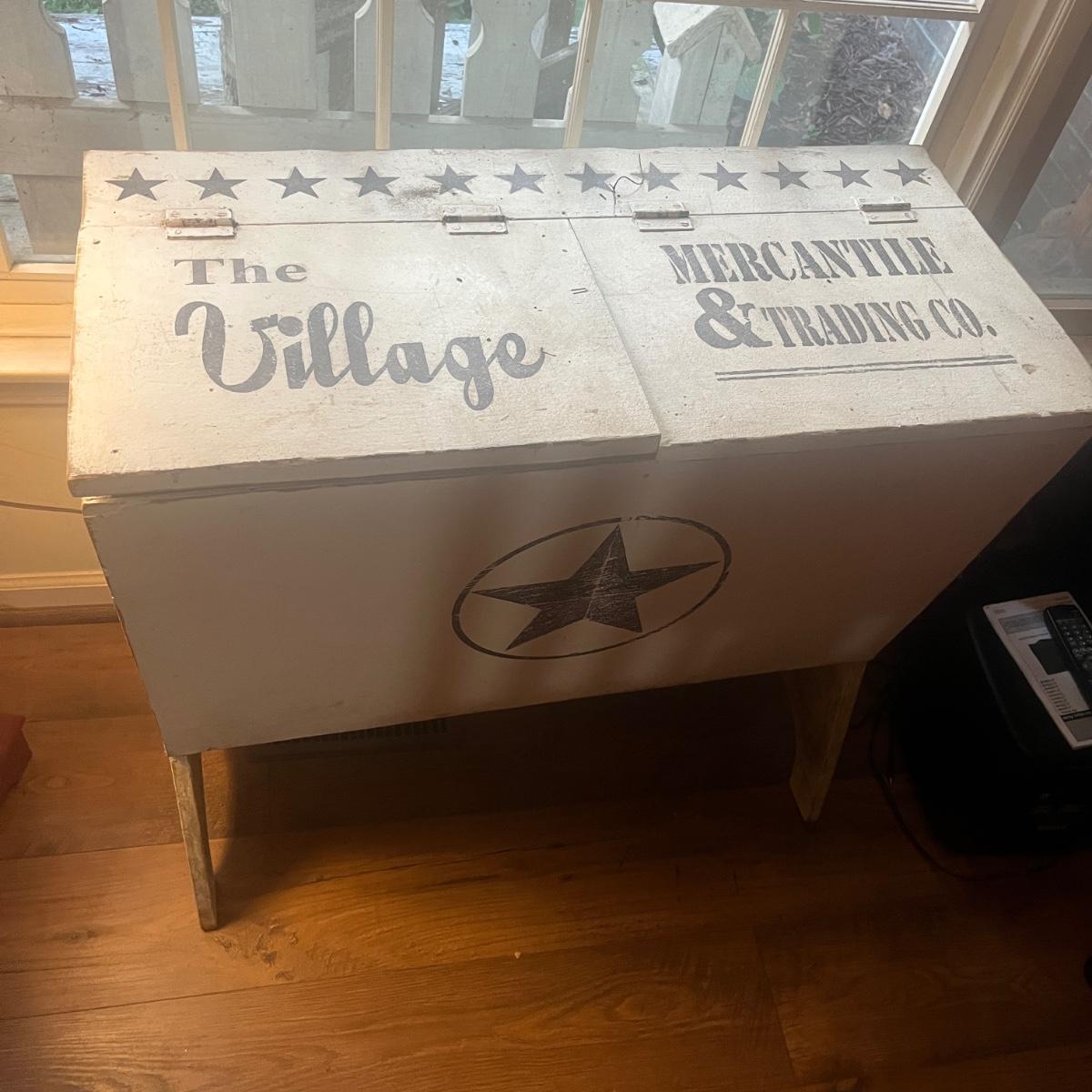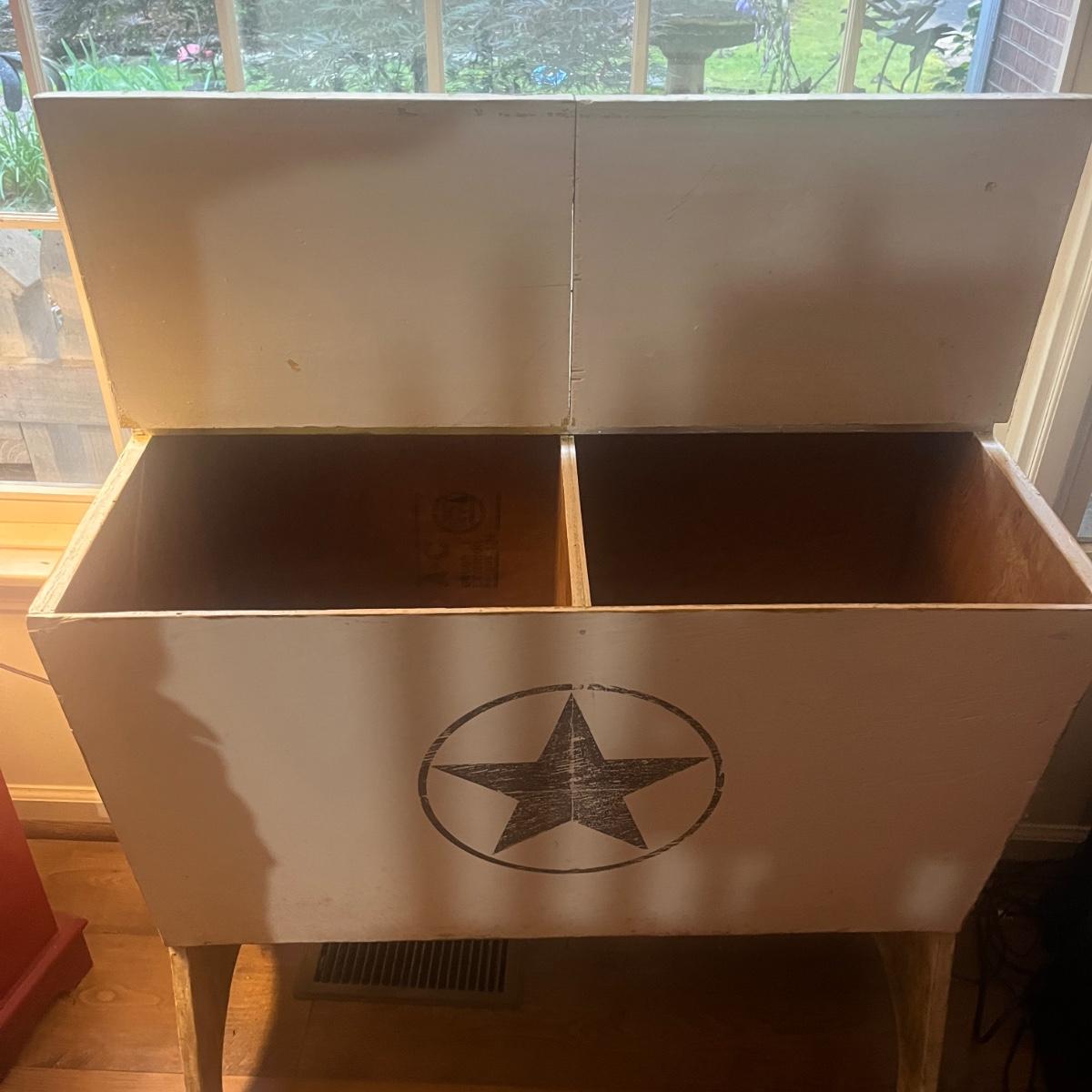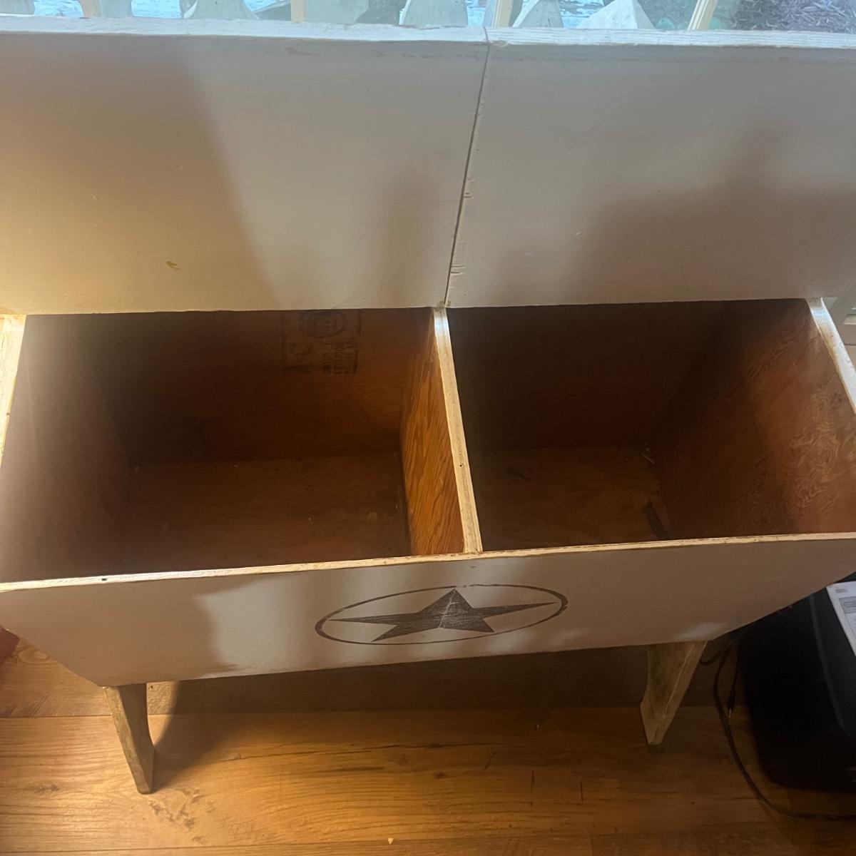 This rustic wooden bin has two compartments with hinged lids and measures 32” x 15.5” x 31”H.