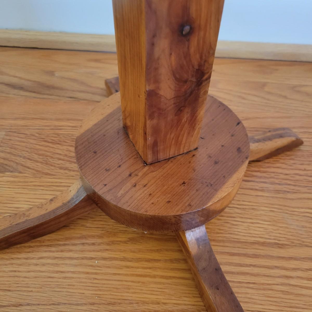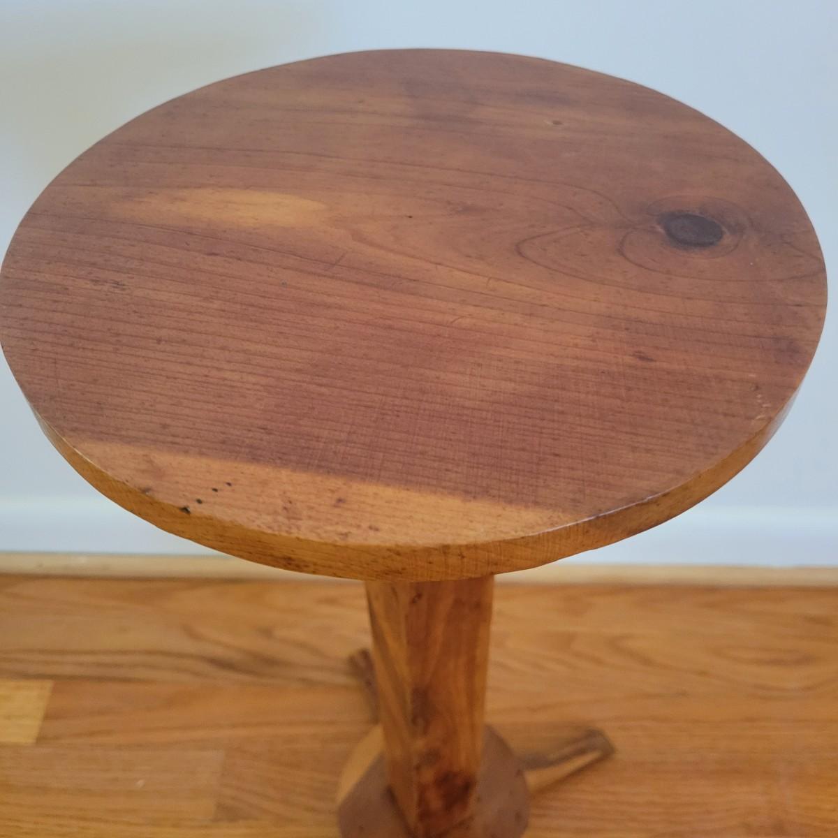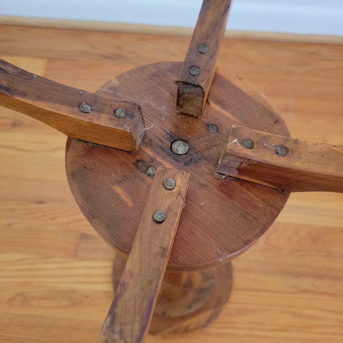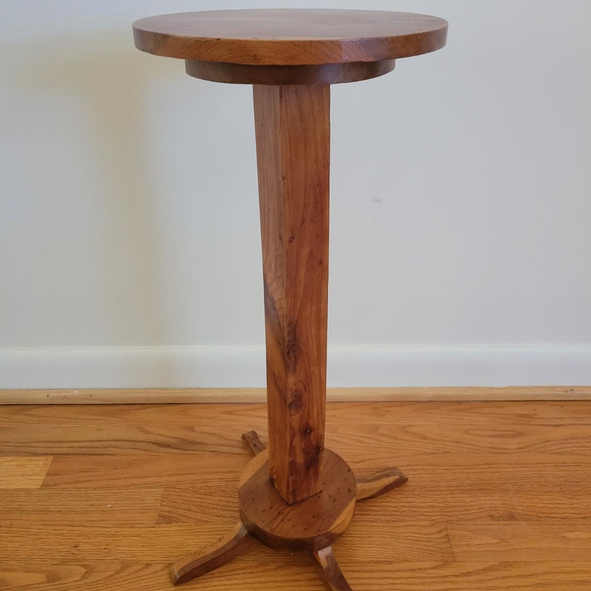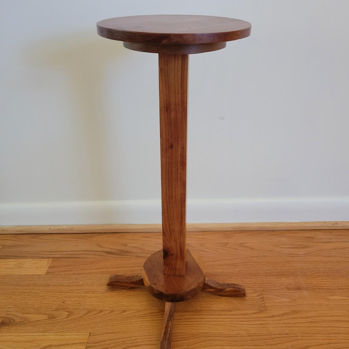 A rustic wooden plant stand in good condition with no notable damage. It appears this stand is made of pine. It has four legs at its base. Measures approximately 13"d x 24"h. Local pickup only