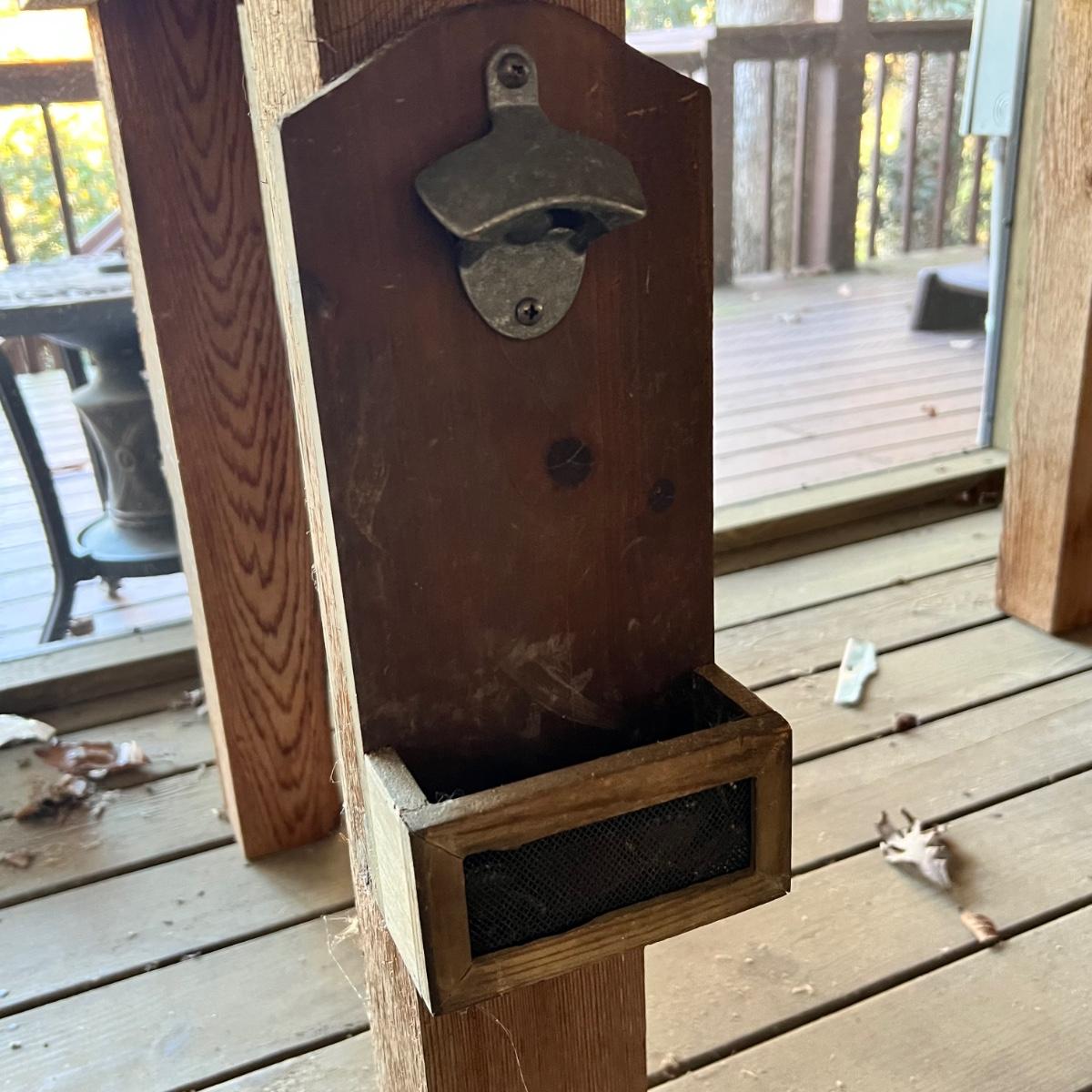 This farmhouse style table appears to have been handmade with fencing wood; four sturdy posts for legs and fencing boards for the tops. A bottle opener is screwed to one leg.