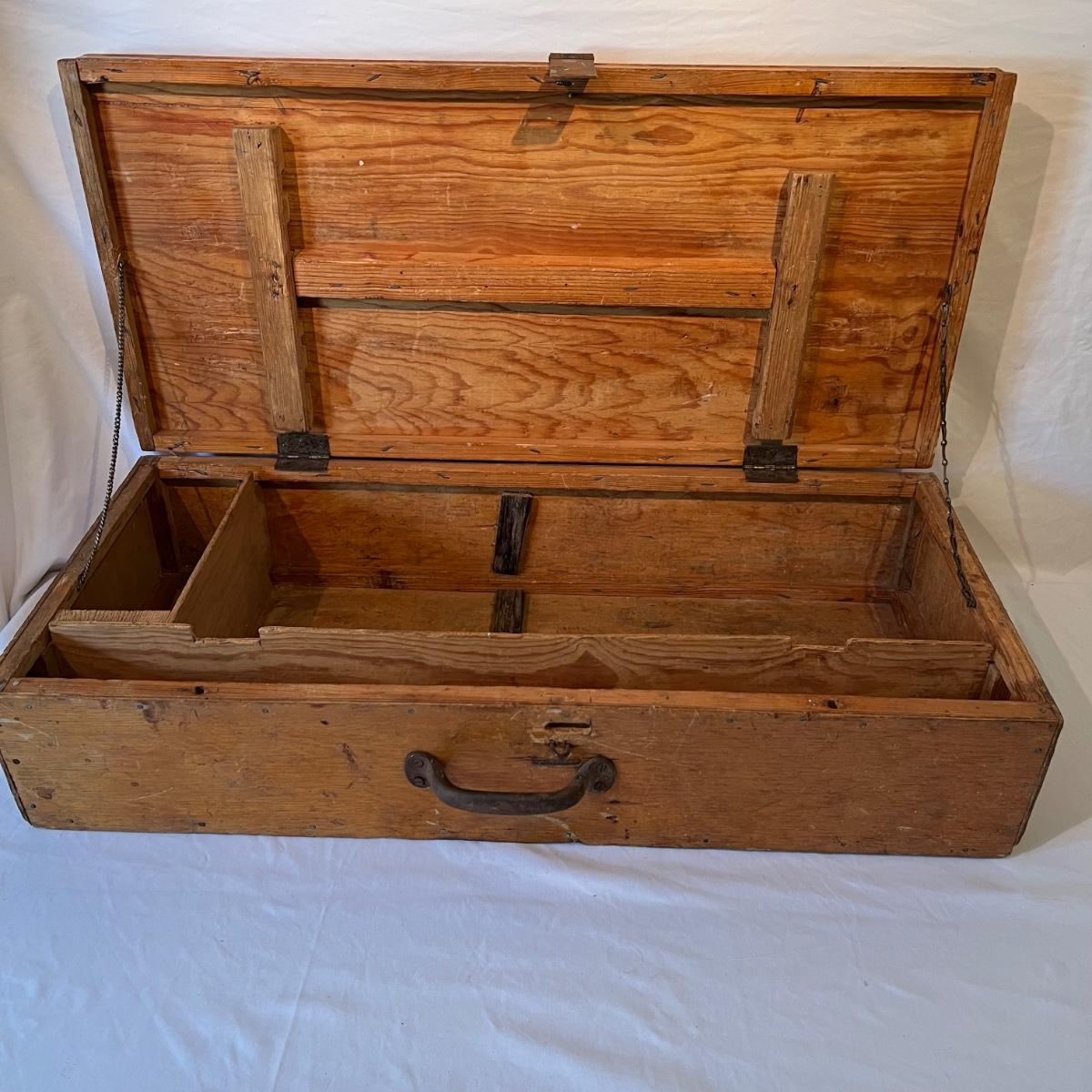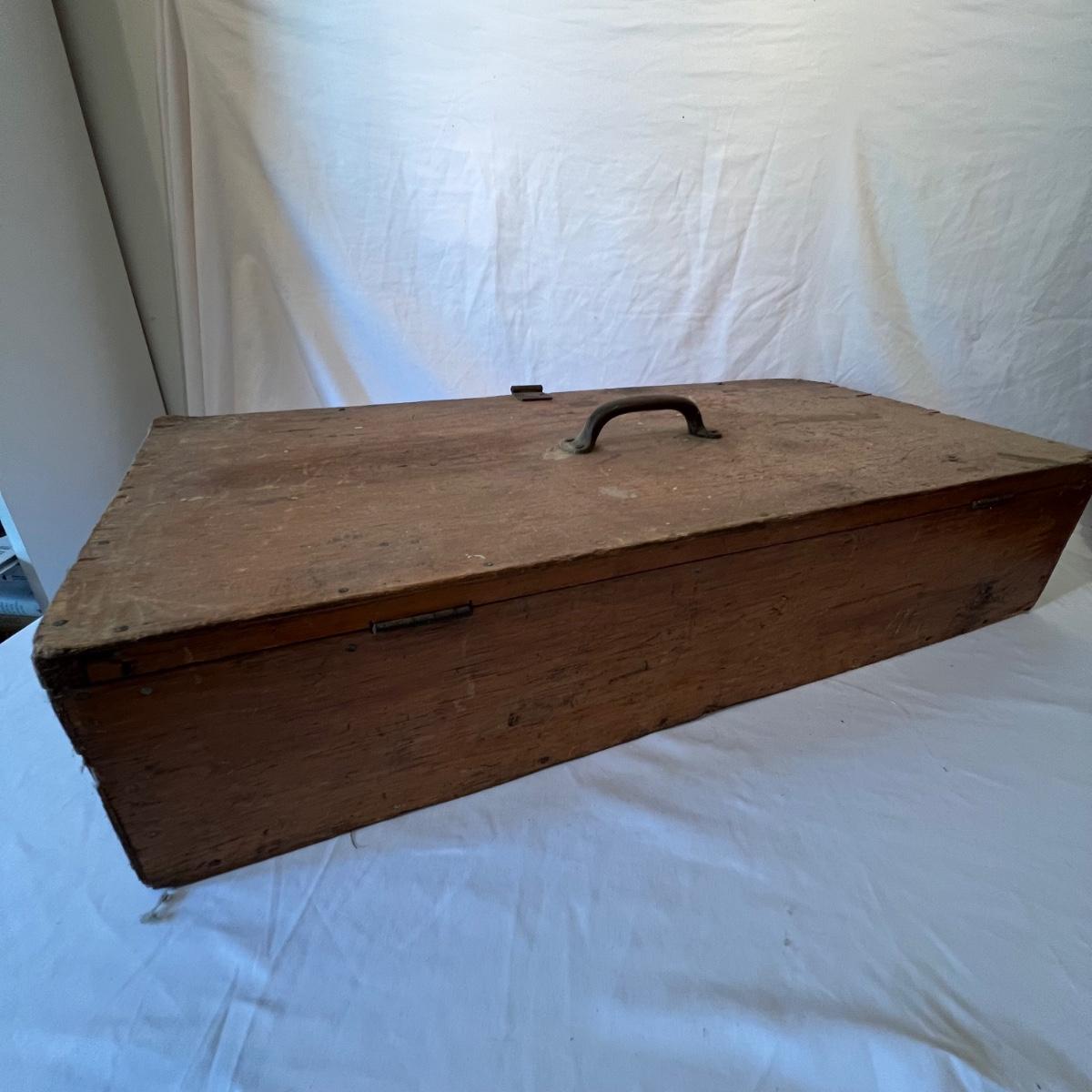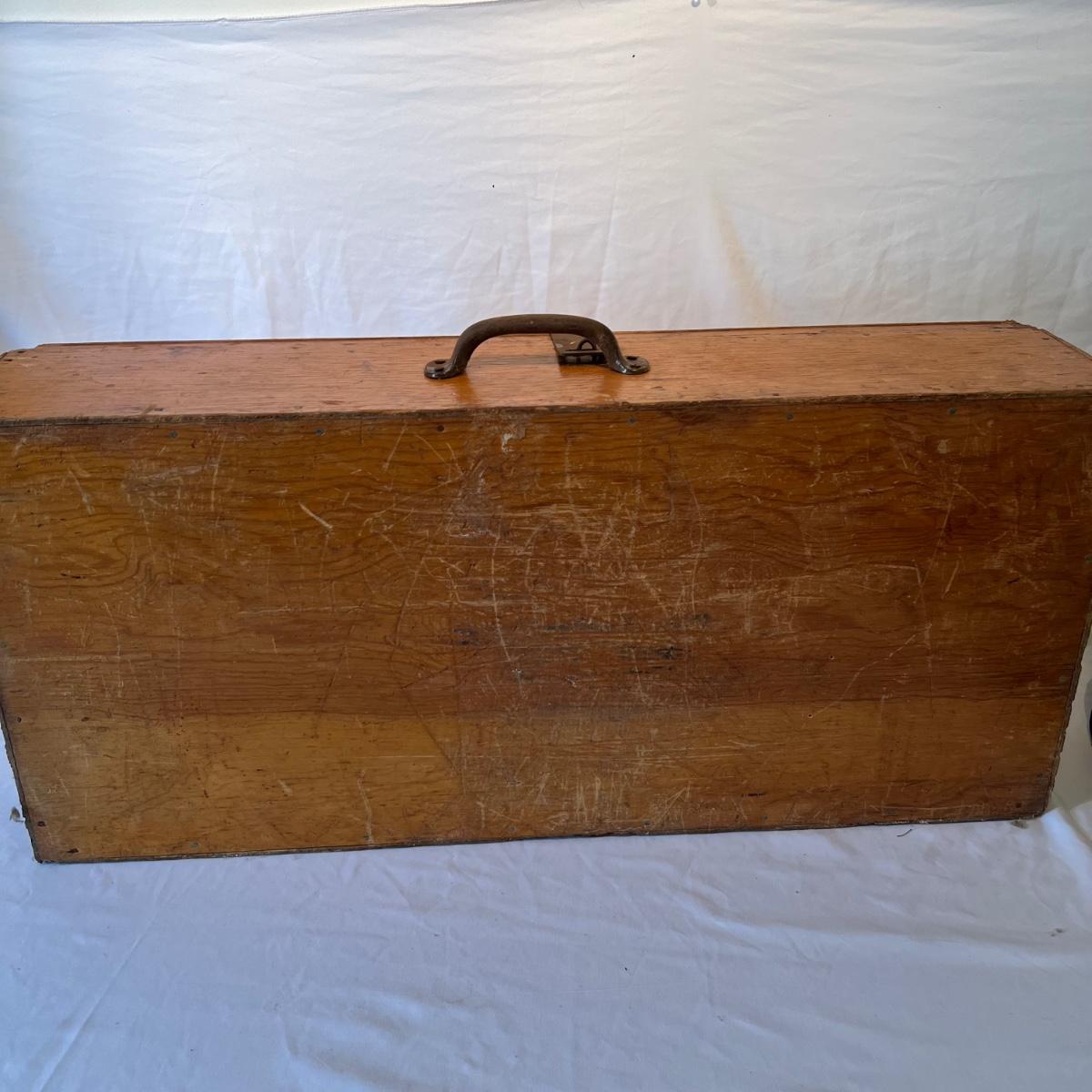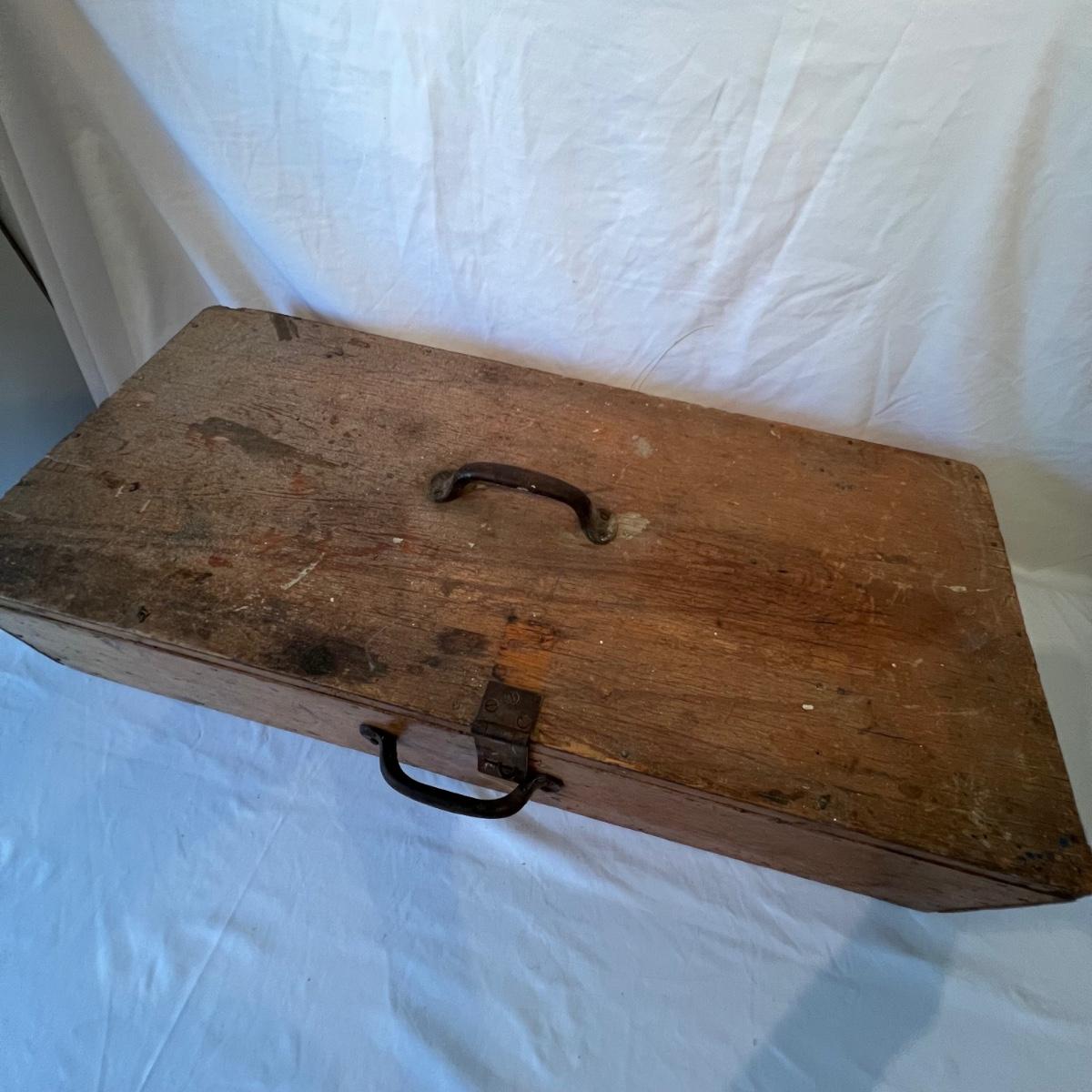 This wooden tool box would make a wonderful display piece. It has multiple compartments; a saw (available in one of the tool lots) was housed in the front compartment. Box has metal latch and handle.