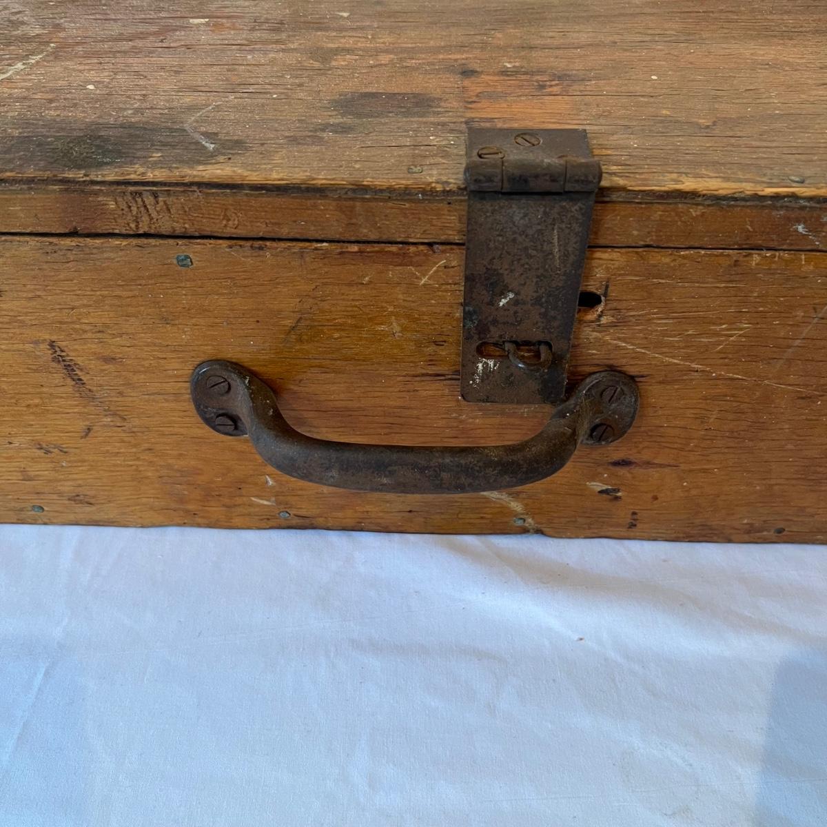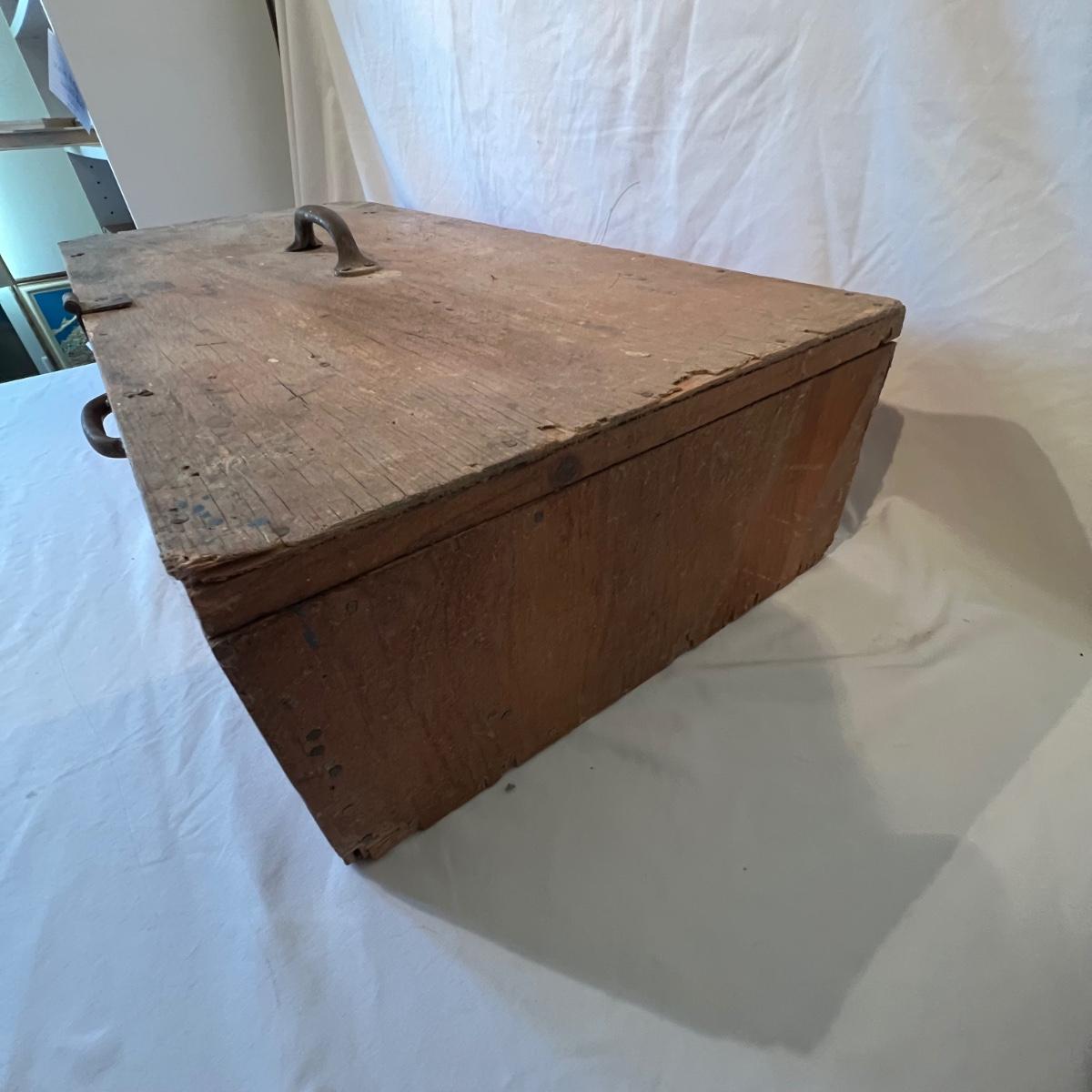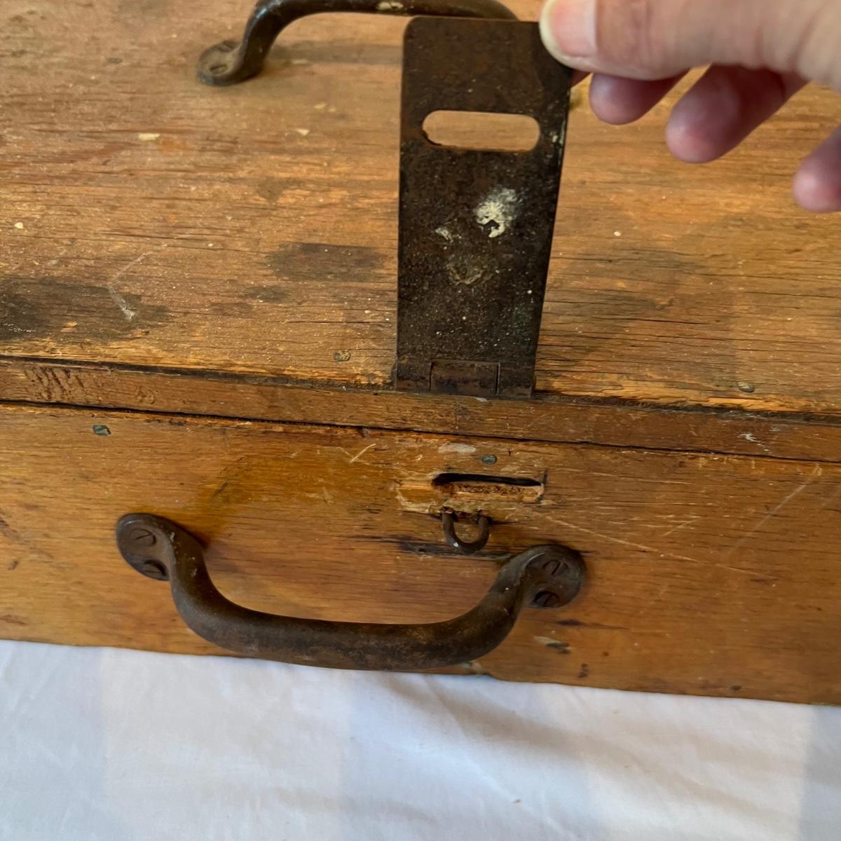 This wooden tool box would make a wonderful display piece. It has multiple compartments; a saw (available in one of the tool lots) was housed in the front compartment. Box has metal latch and handle.
