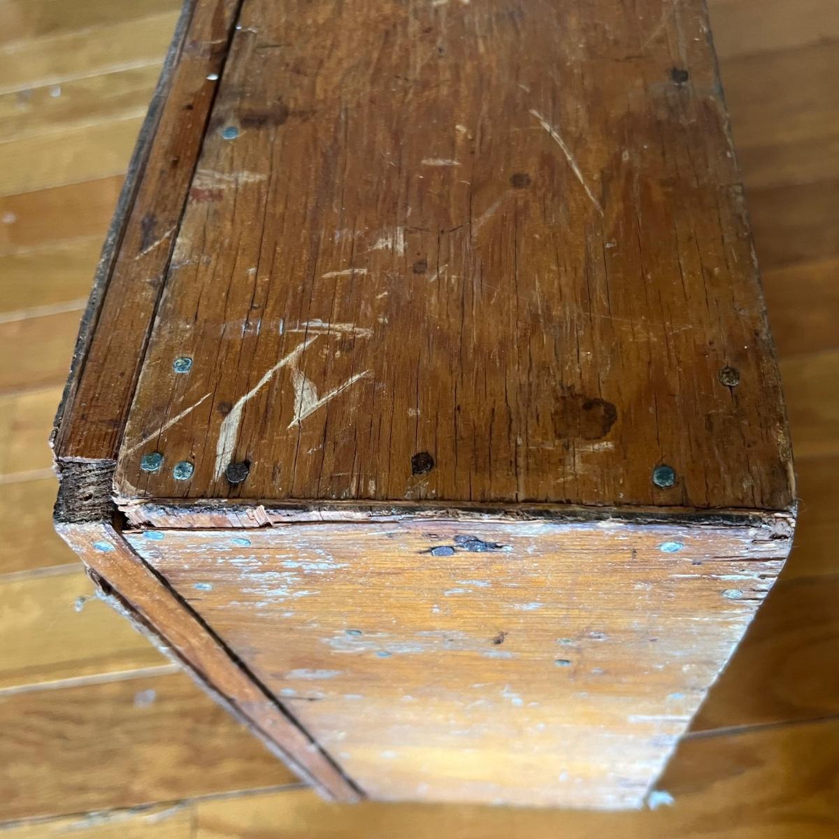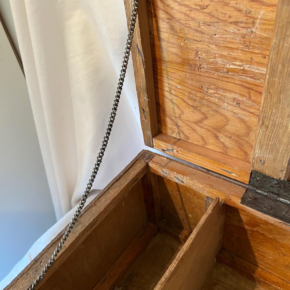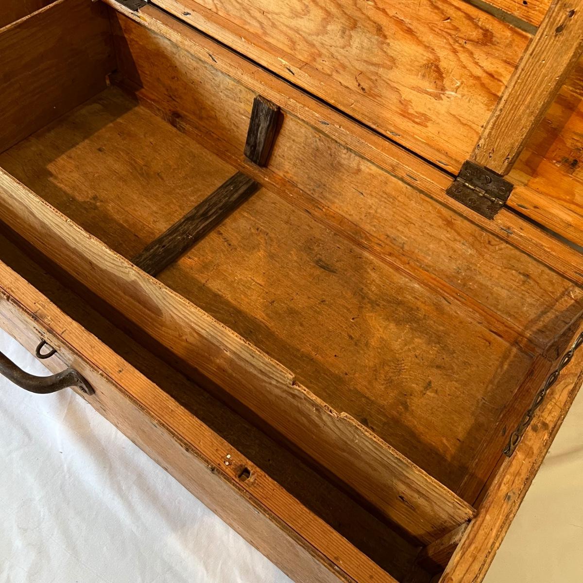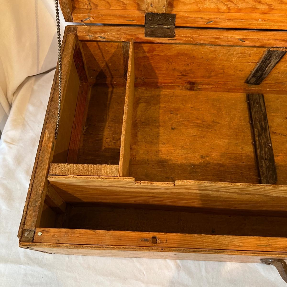 This wooden tool box would make a wonderful display piece. It has multiple compartments; a saw (available in one of the tool lots) was housed in the front compartment. Box has metal latch and handle.