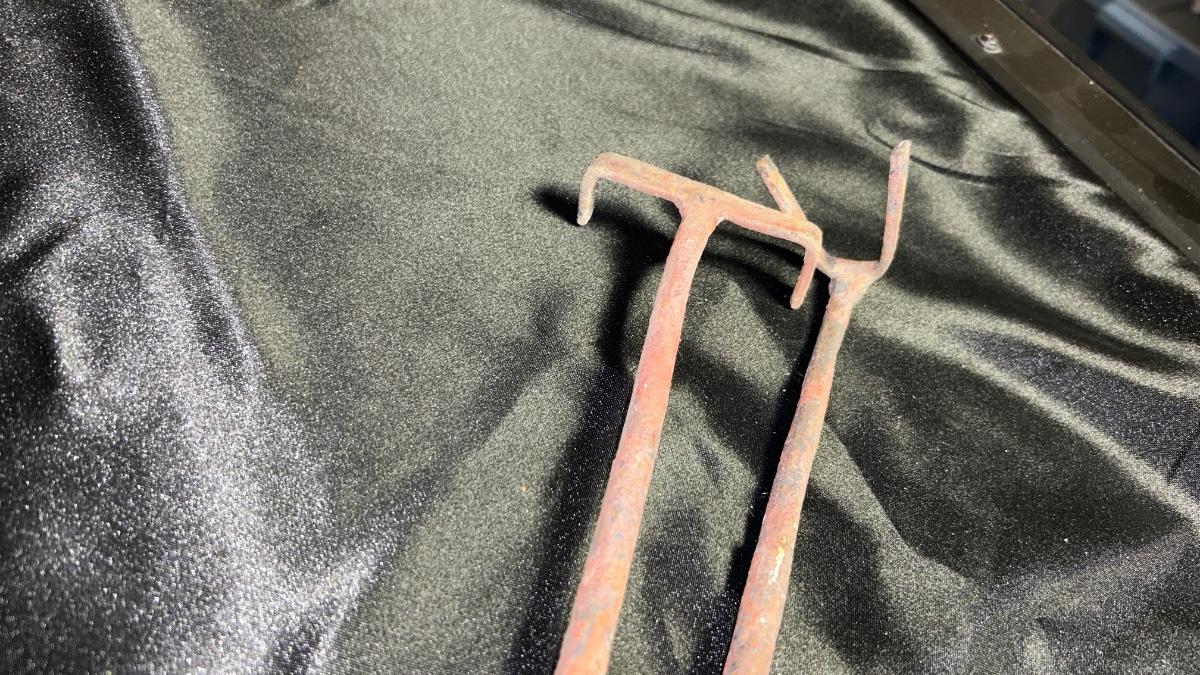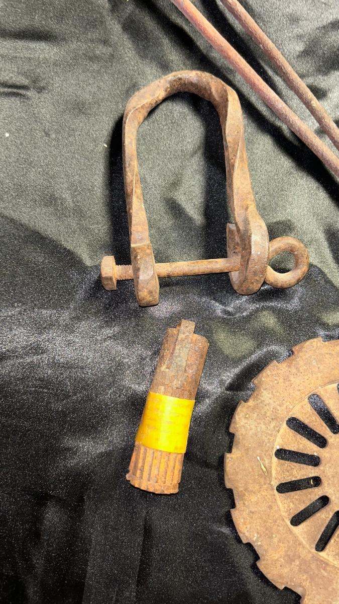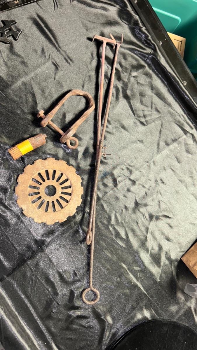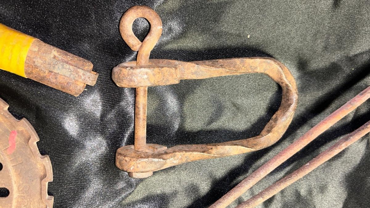 OLD FARM ITEMS, BRANDING IRONS, BIT, HOMEMADE SHACKLE AND MORE