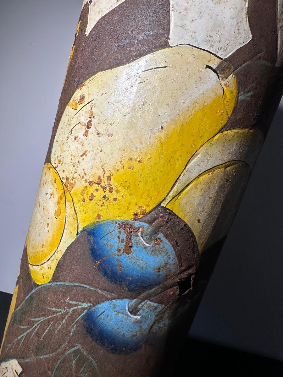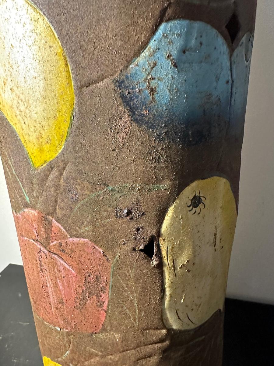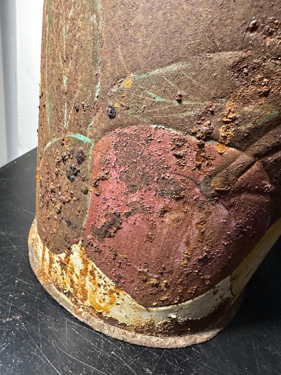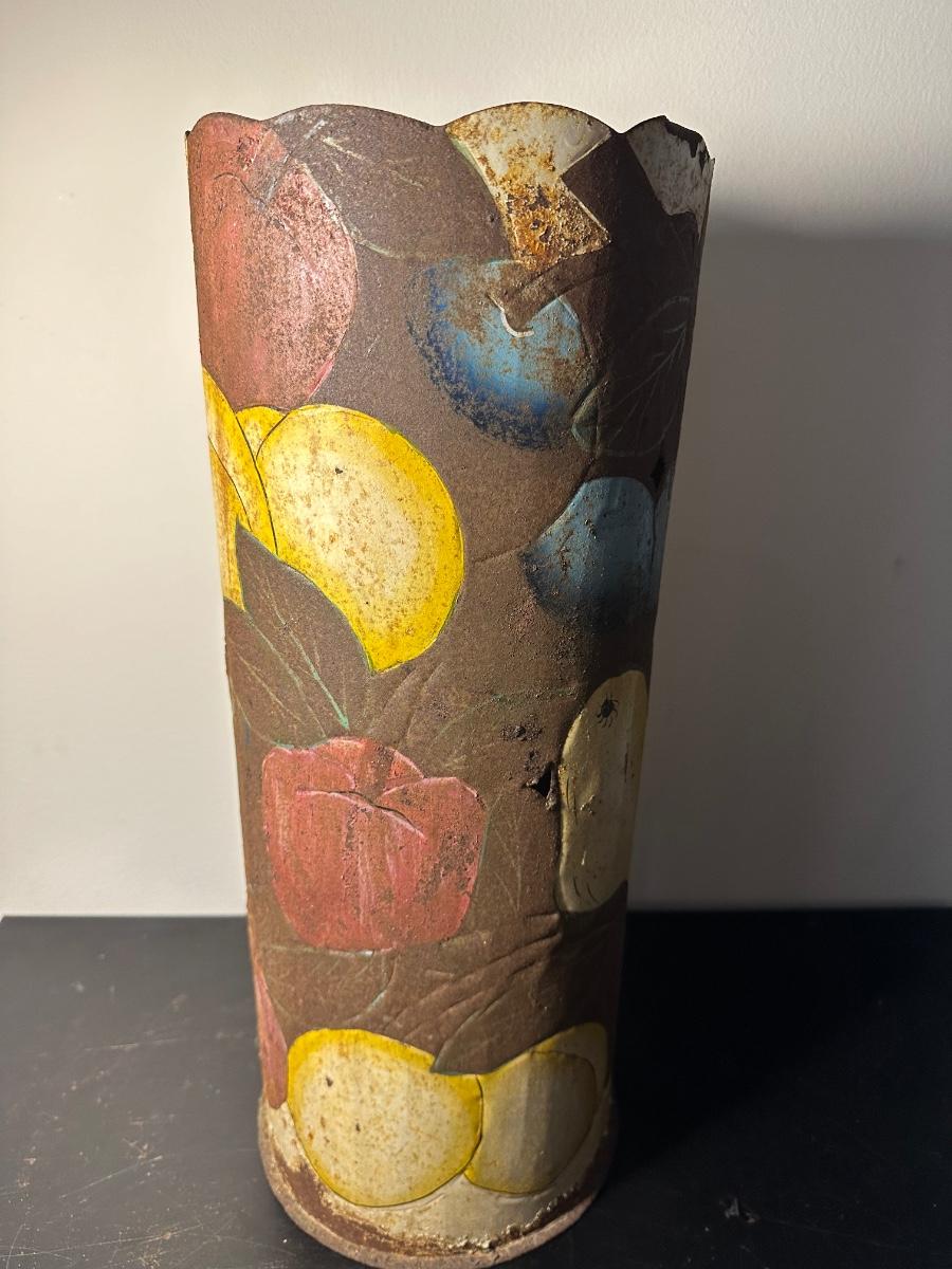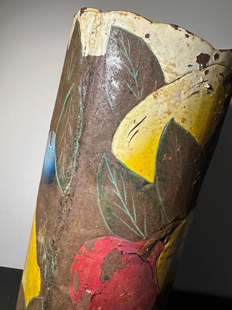 PAINTED RUSTY TIN UMBRELLA STAND, SOME HOLES ON SIDE, 20" TALL, AS PICTURED