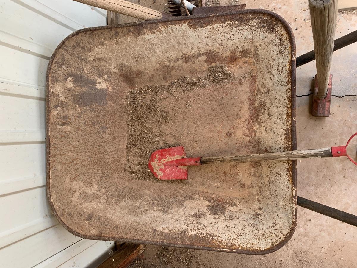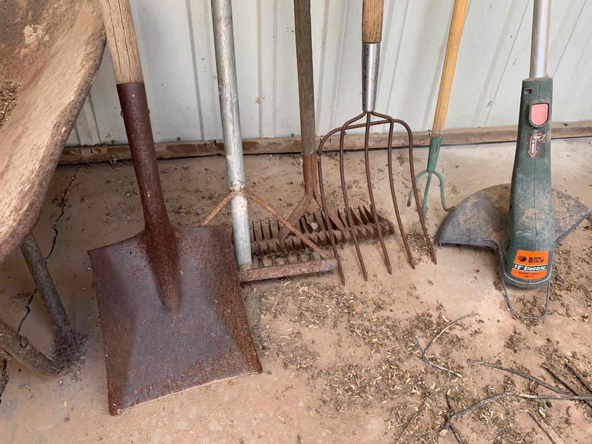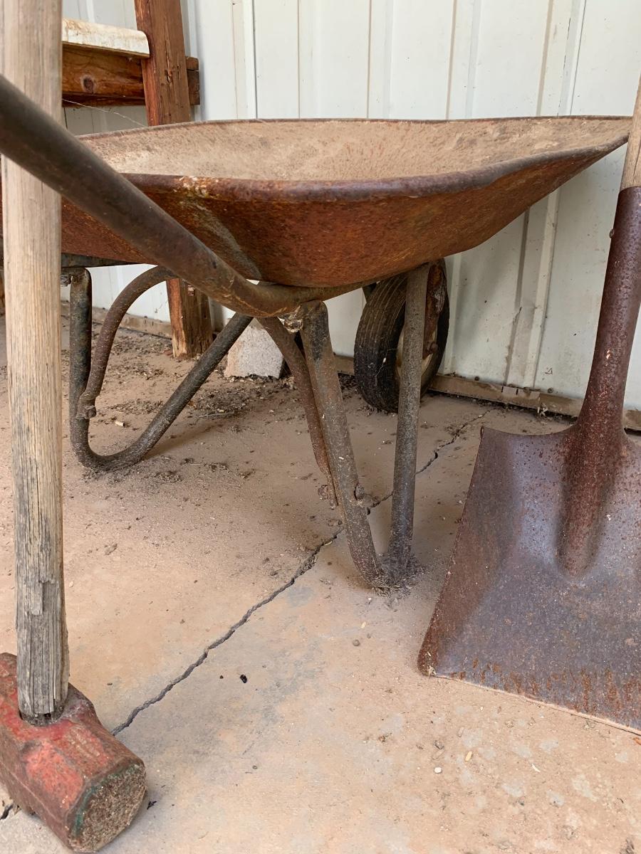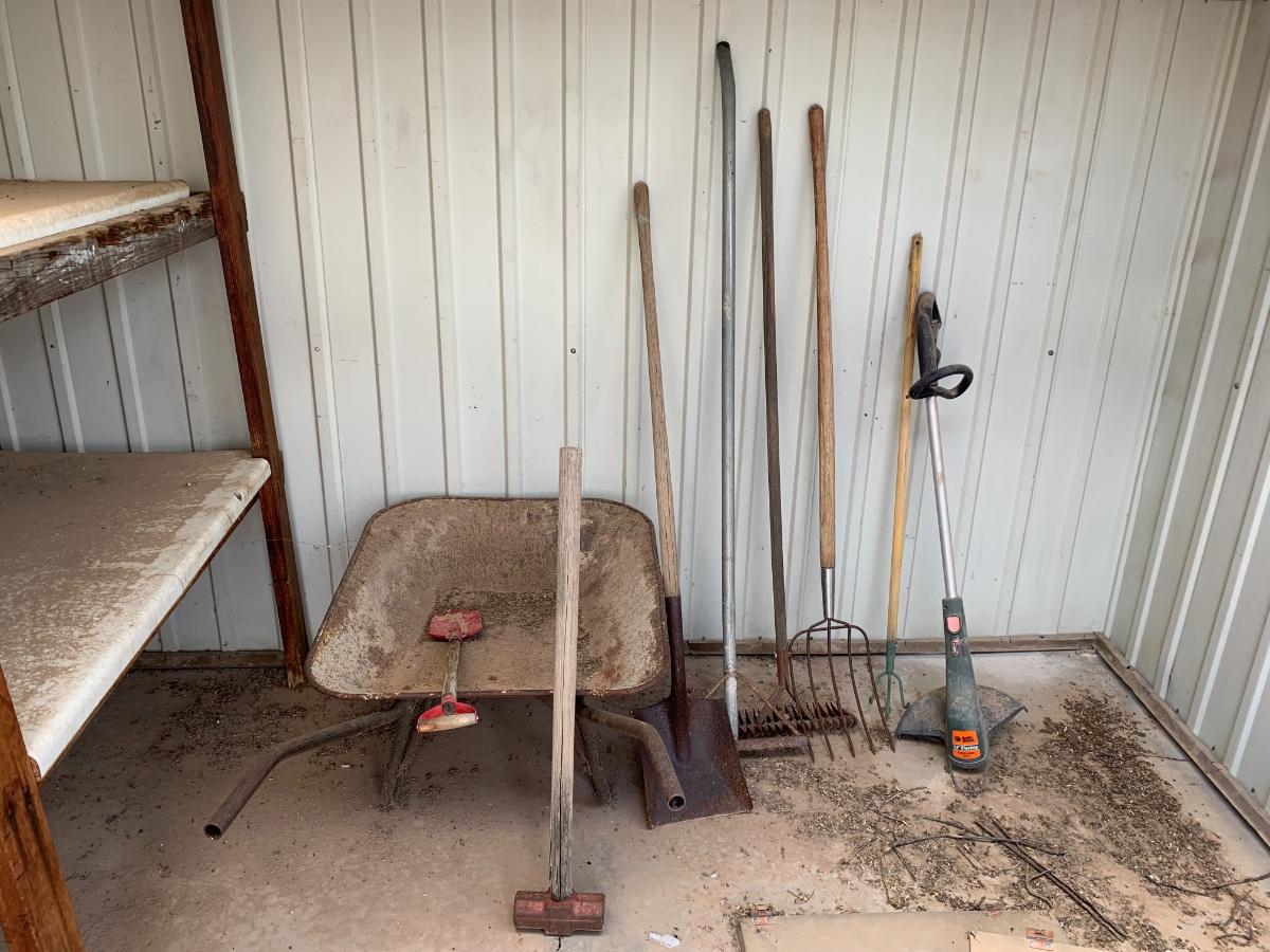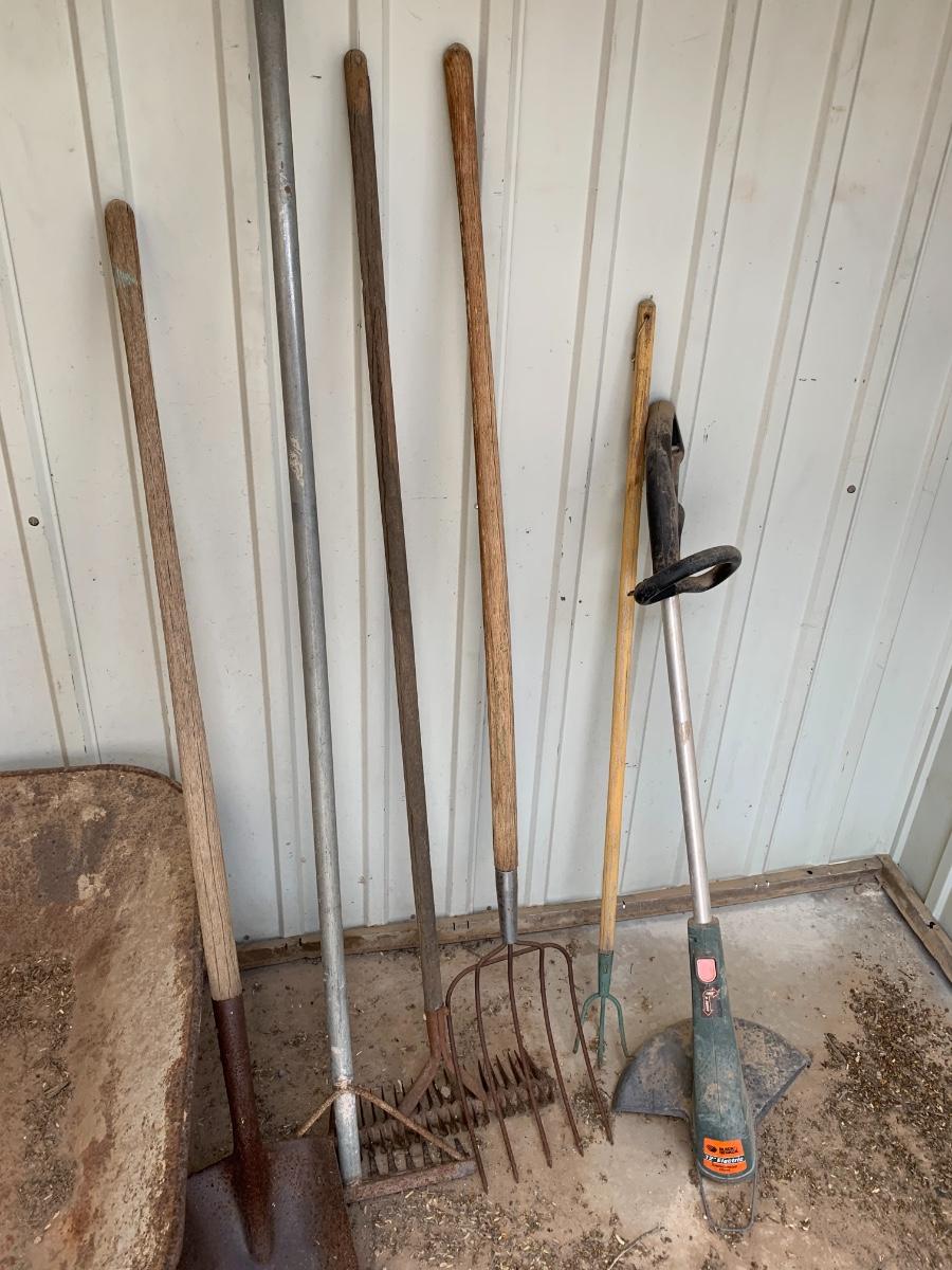 Includes an old rusty wheelbarrow with no wholes noticed (does have a flat tire), small red shovel, a metal sledge, a hoe, a tiller, a shovel. There is also an electric edger. All of the metal has rust and all of the wood is worn.