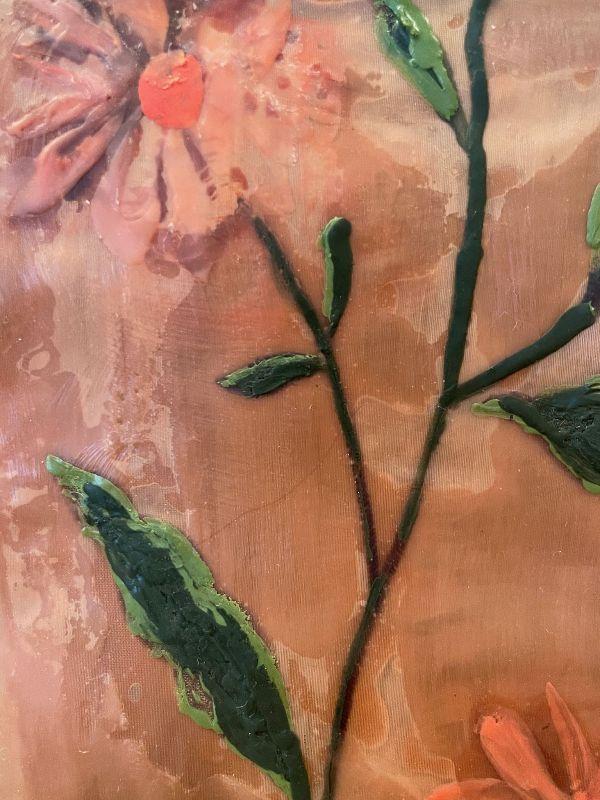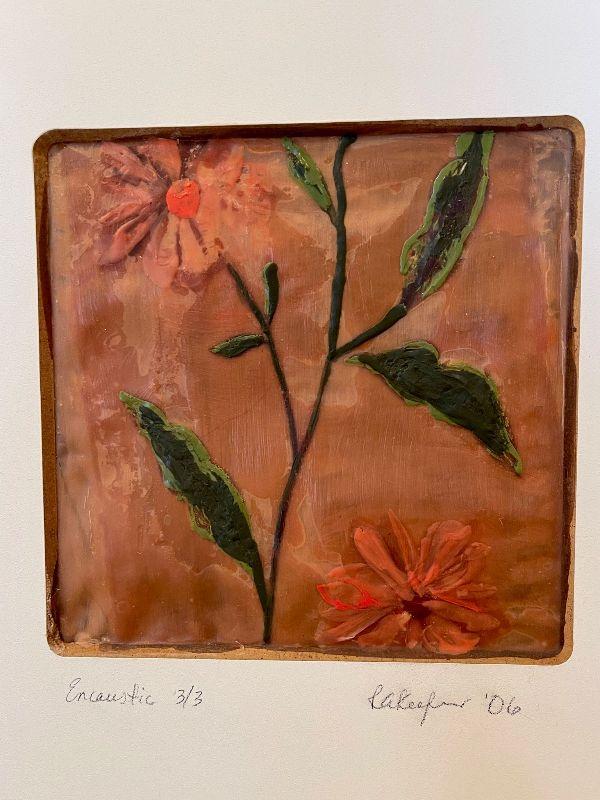 “Encaustic 3/3” featuring two stemmed flower blossoms handstitched into cotton fabric coated in an encaustic