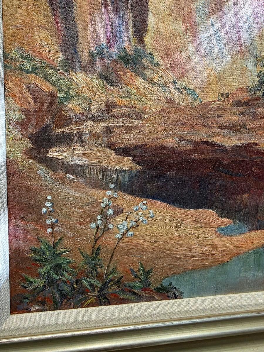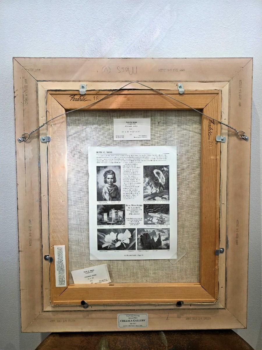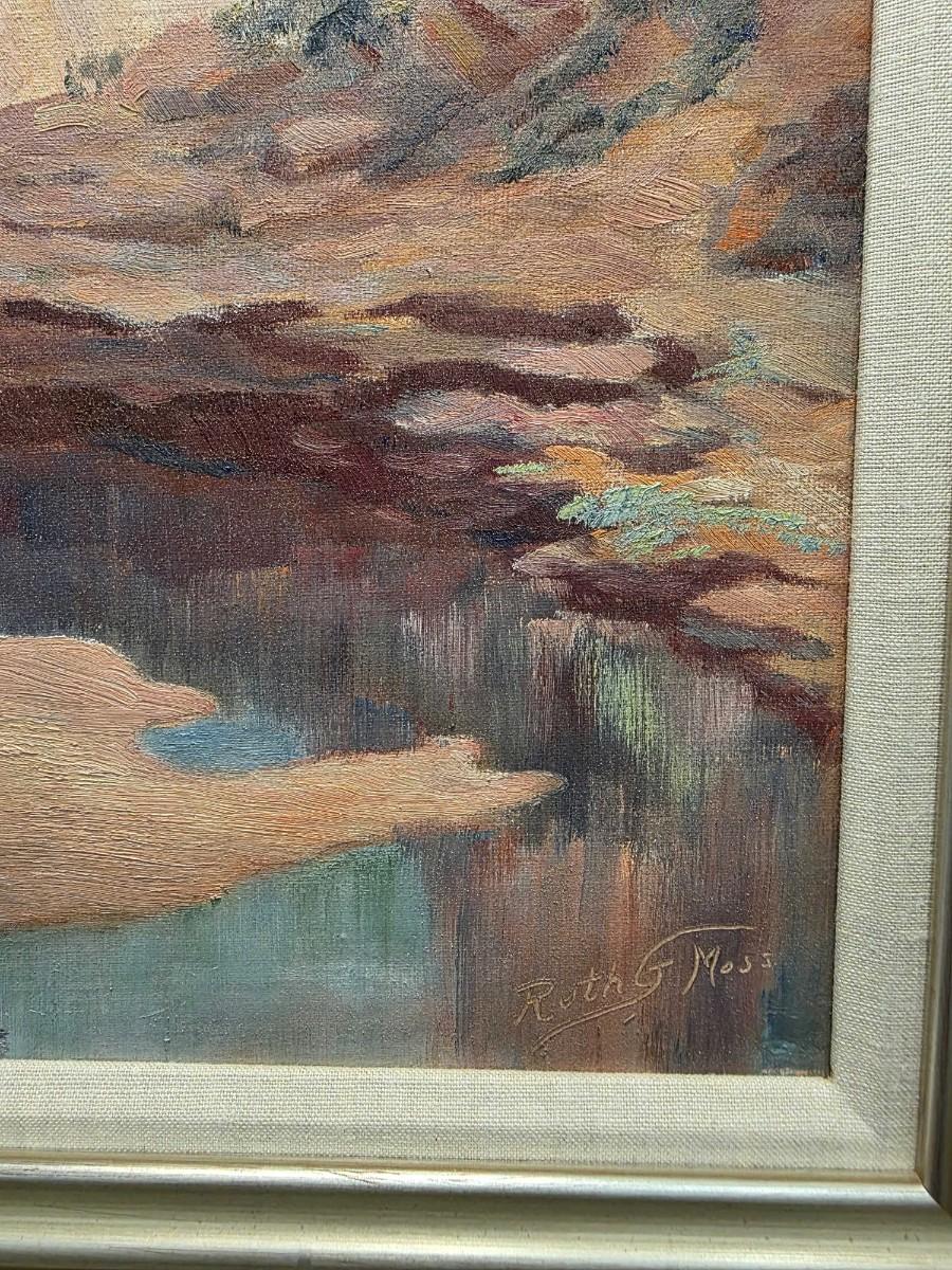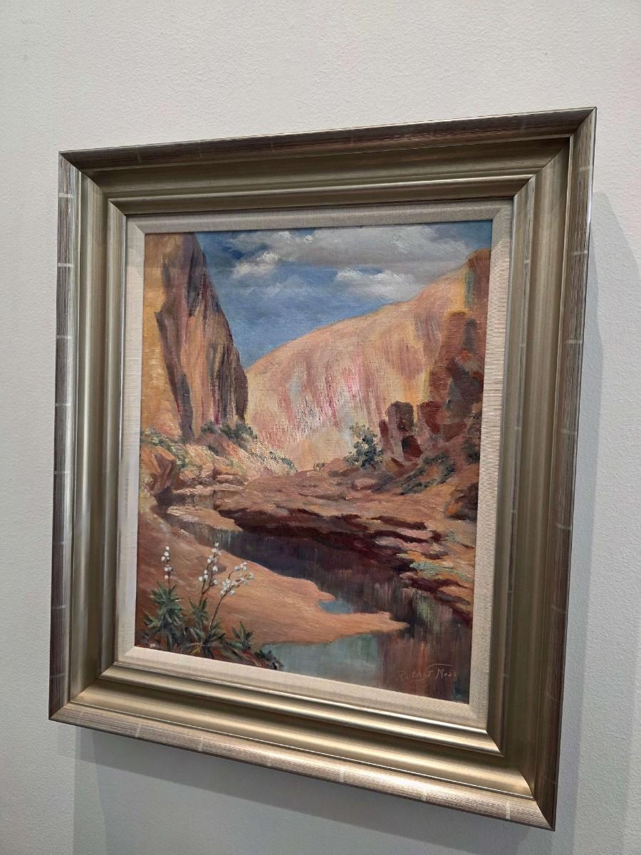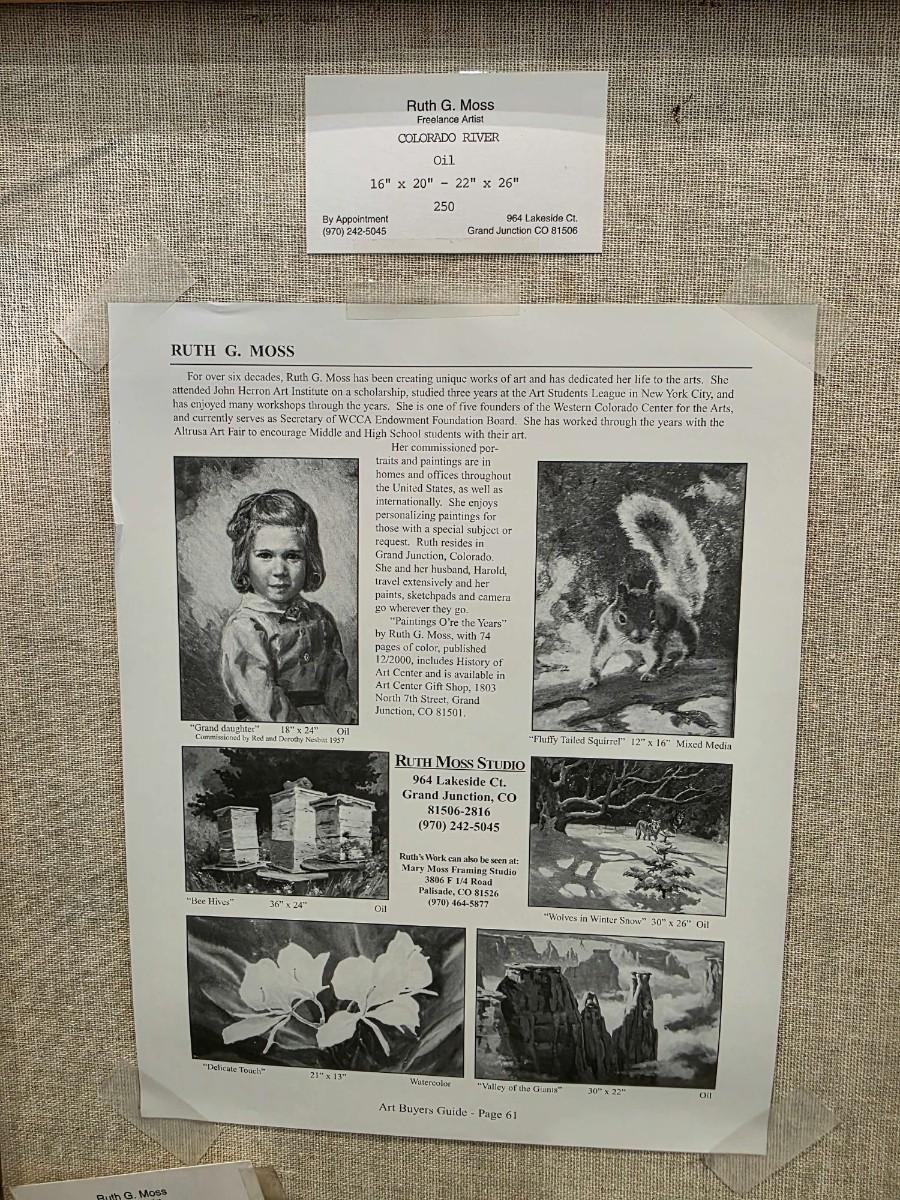 Original vintage oil on canvas, "Colorado River" by Grand Junction, CO artist, Ruth G. Moss (1916-2011) is exceptionally beautiful. It truly warrants appreciation. Ruth started with sculpting and works with clay in high school and pursued her education At John Herron Art Institute in Indianapolis, IN and then Students Art Legue in New York City. She was a founding member of the Western Colorado Center for Arts, as well as a long-time member of Altrusa. She favored landscape and portrait paintings. After viewing several of her works, I am in awe! In spite of its vintage classification, I find her art to be surprisingly relevant and modern. Measurements are in pictures, canvas 16"x 20", framed 22" x 26".