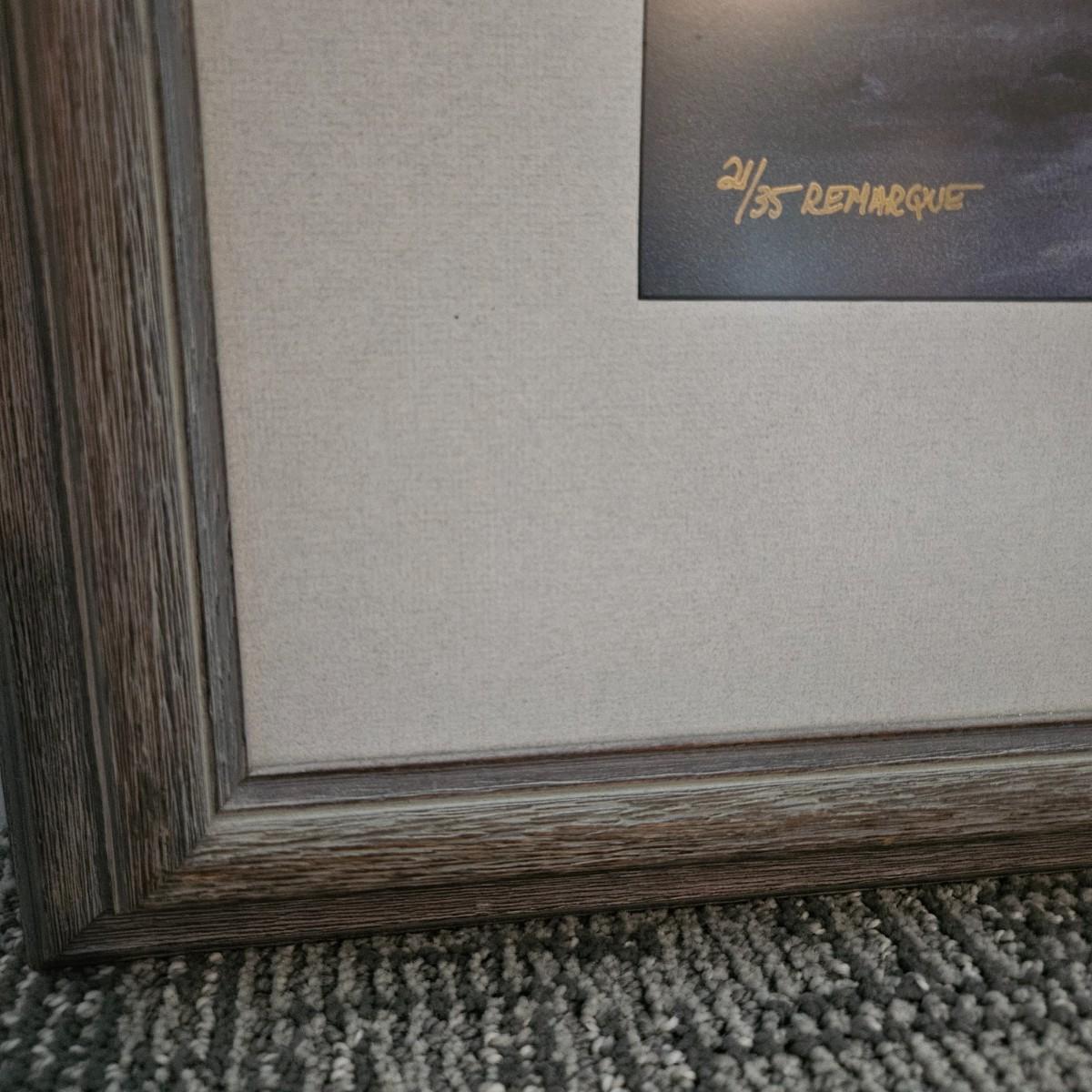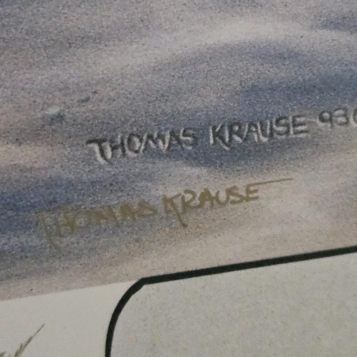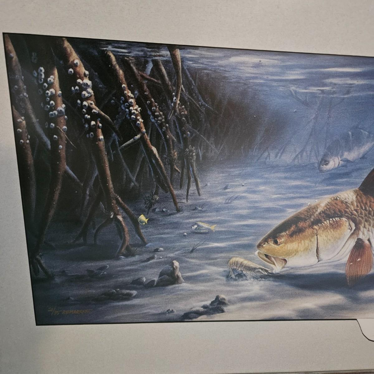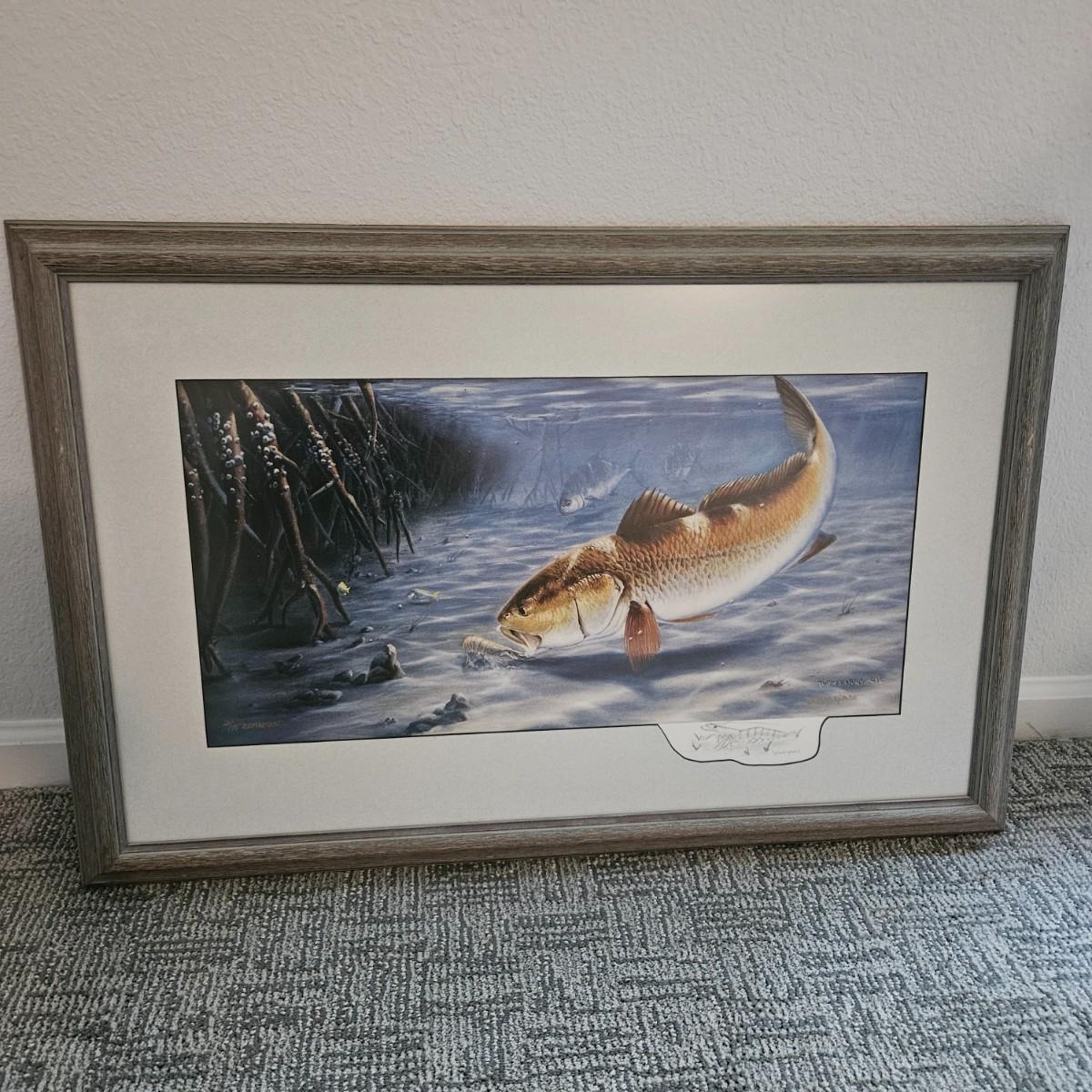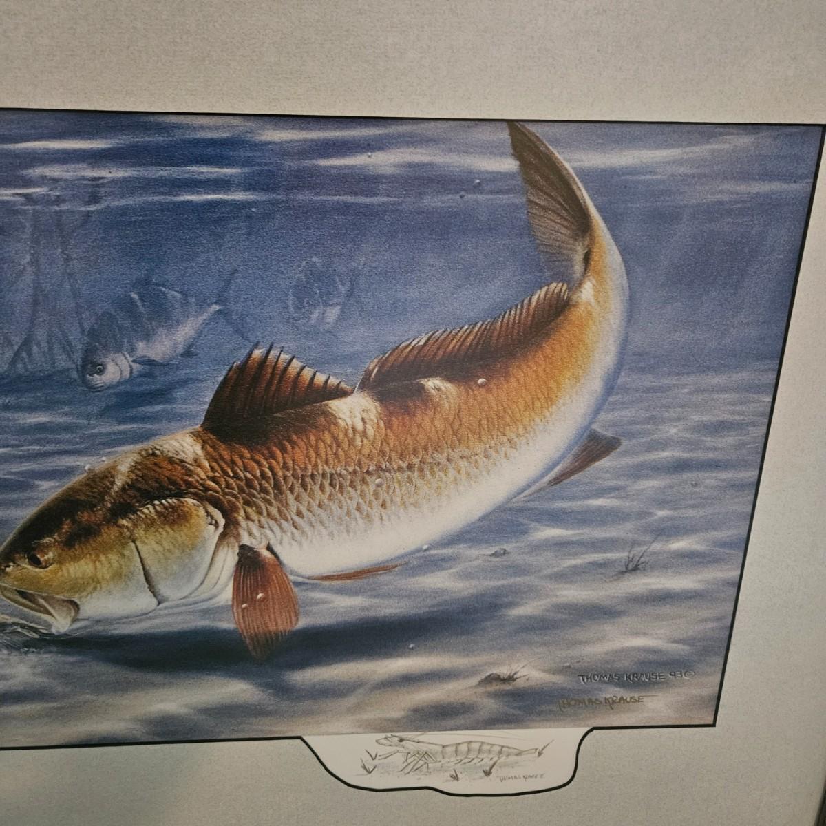 A custom framed Thomas Krause print of a red drum that is signed and numbered. It features a distressed wood frame with a single black core mat and non glare glass. It measures approximately 33" x 21.5"H. Local pickup only. Winning bidder must bring assistance to help move and load this item due to its weight and/or size.
