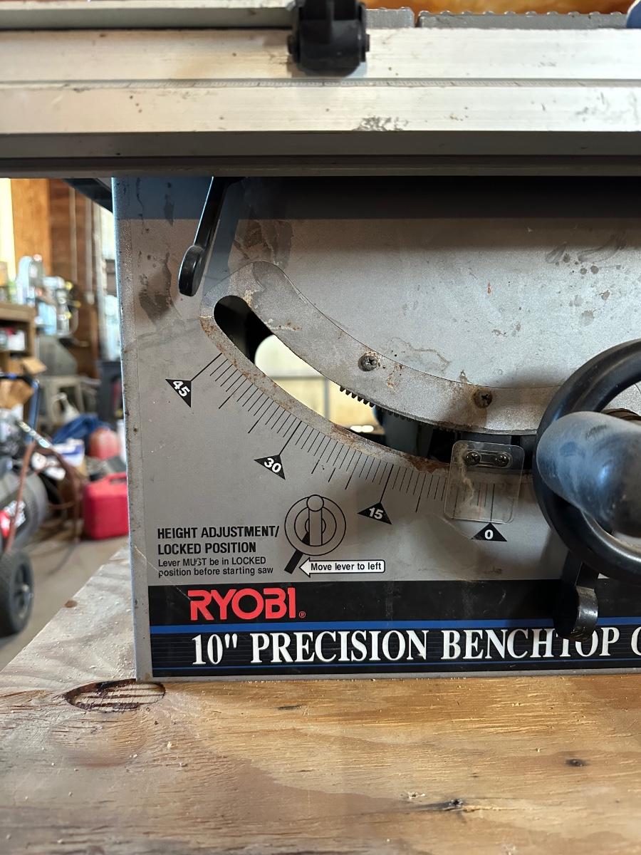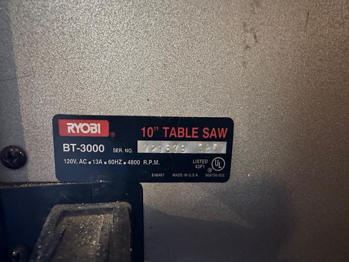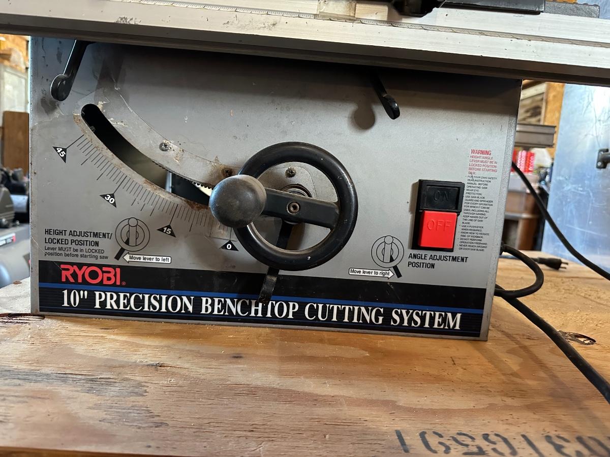 Good condition Ryobi 10” Table Saw - model number BT-3000. It is a 10” precision benchtop cutting system. See pictures for more specifications.