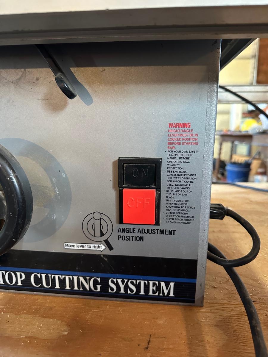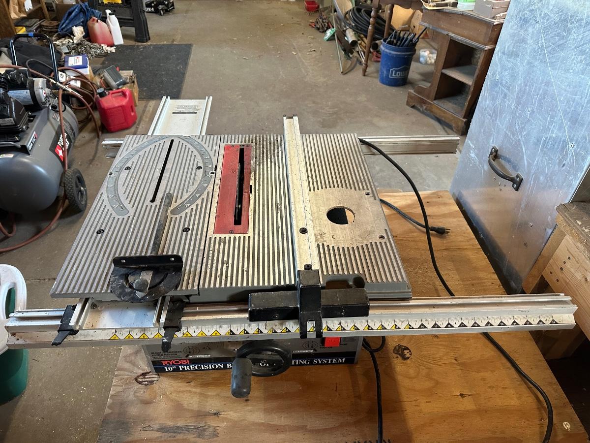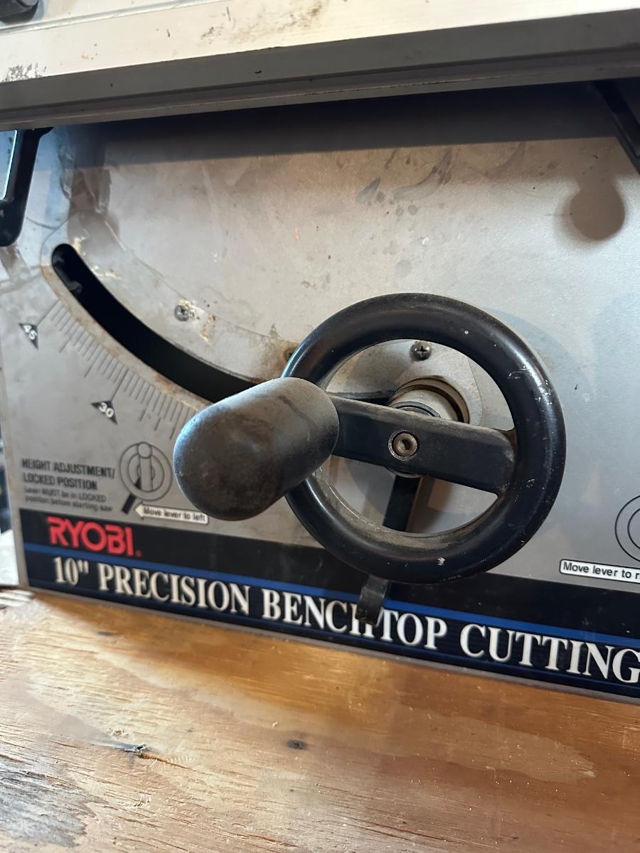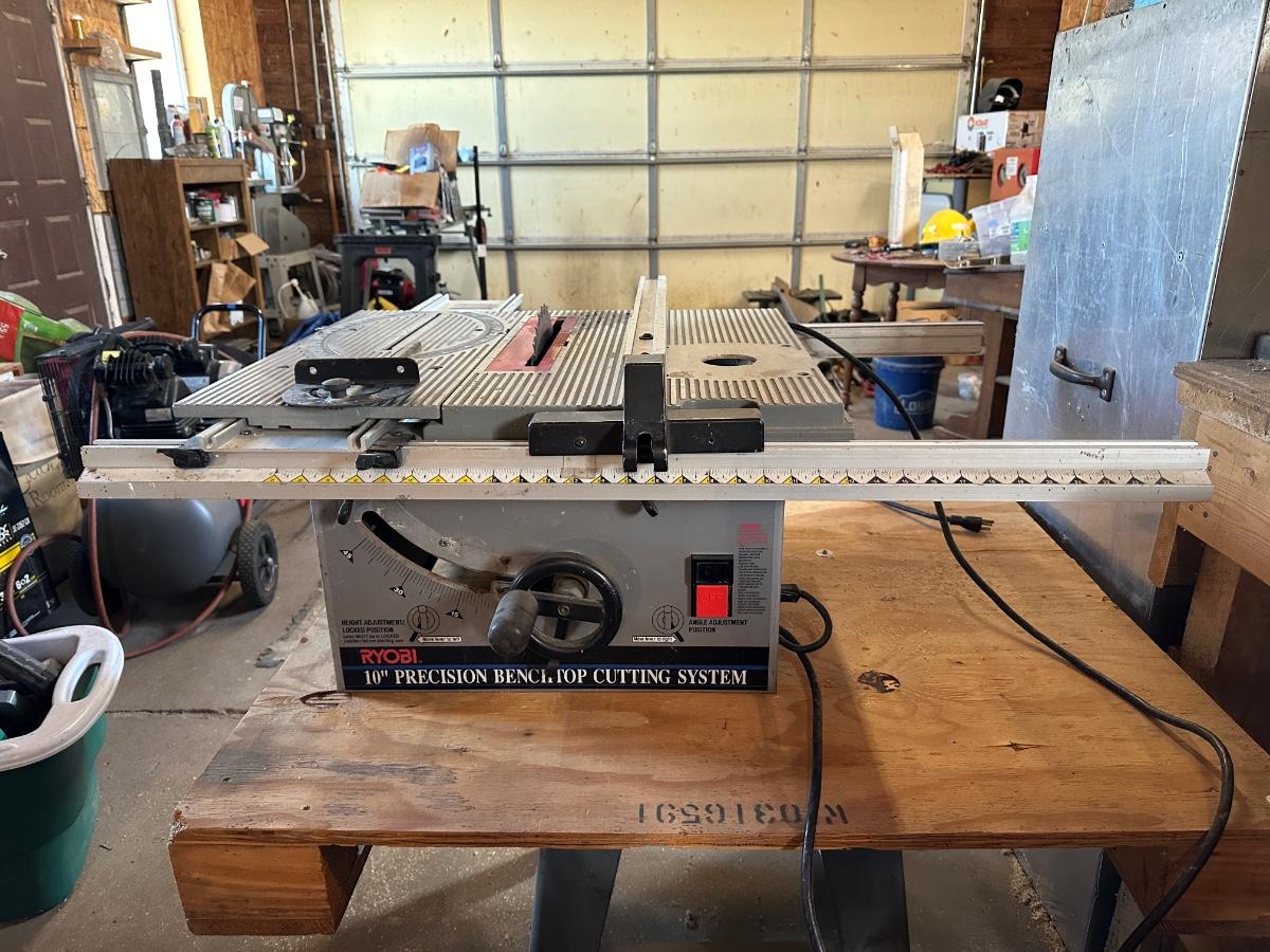 Good condition Ryobi 10” Table Saw - model number BT-3000. It is a 10” precision benchtop cutting system. See pictures for more specifications.
