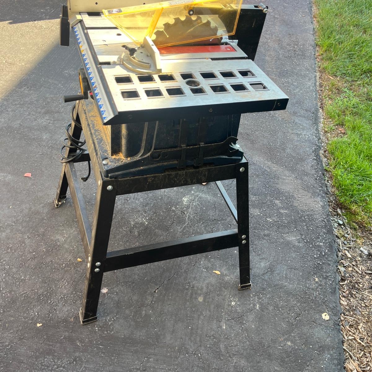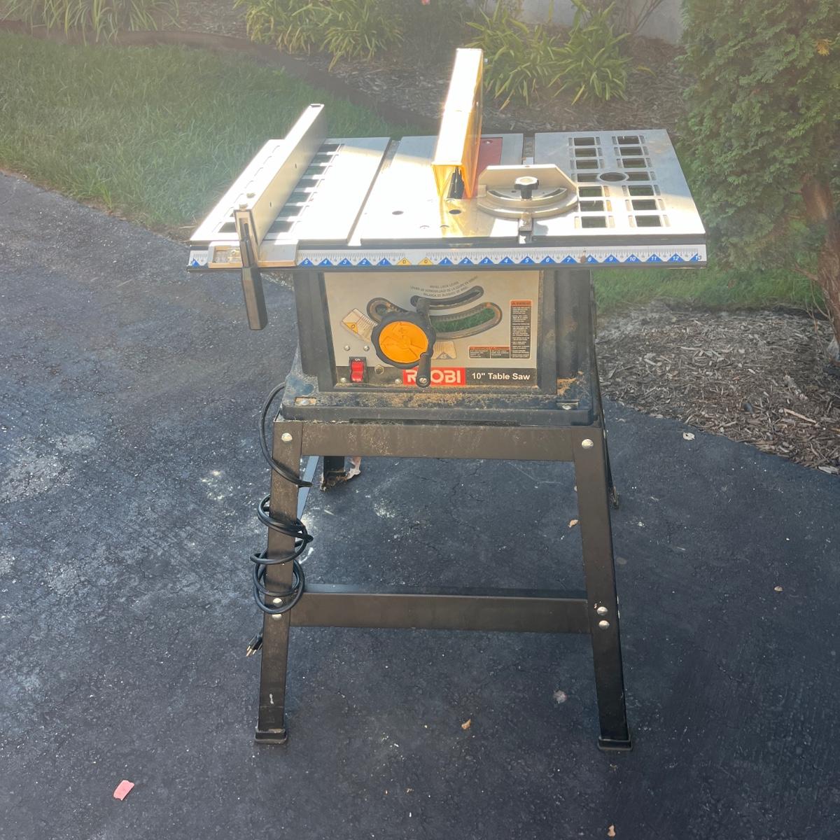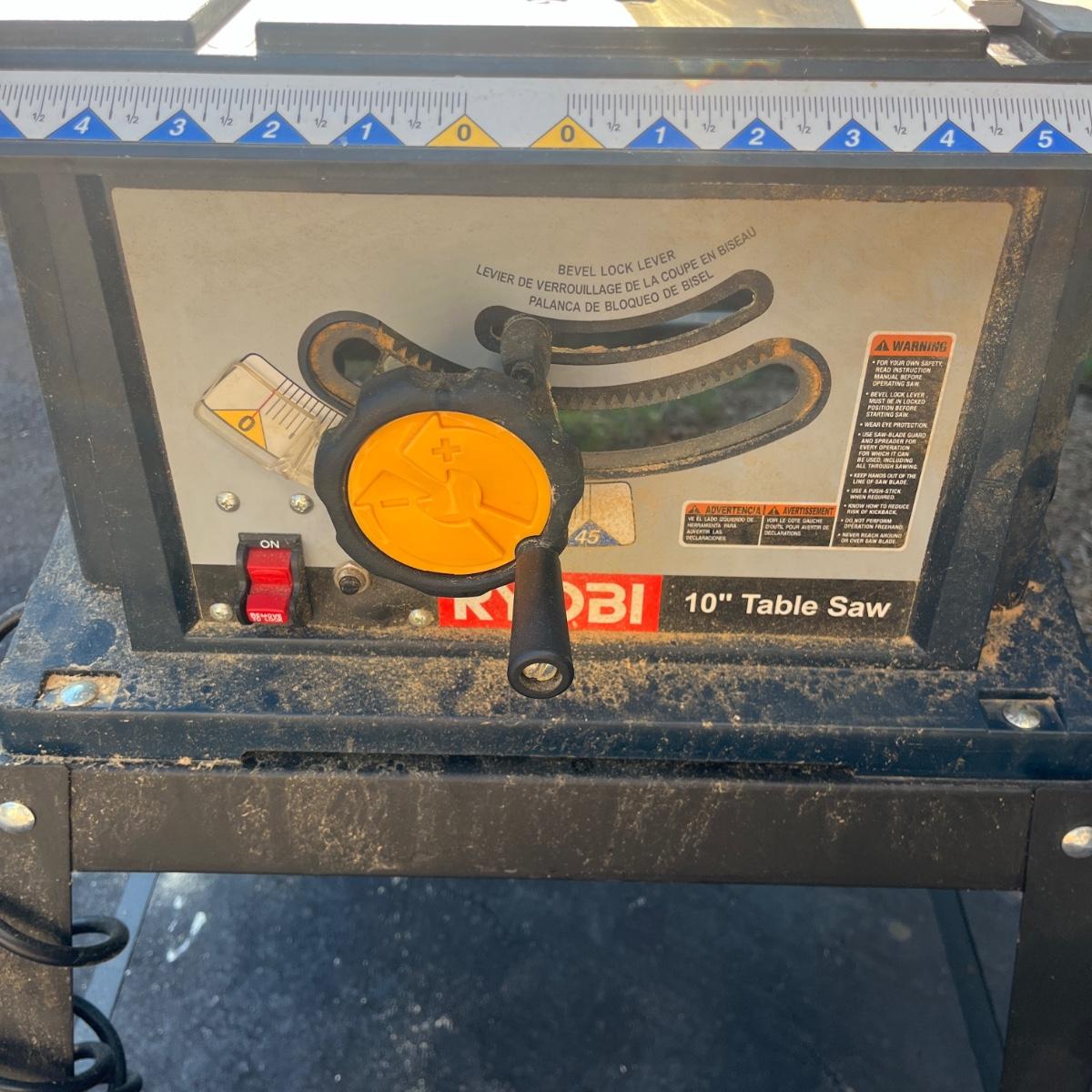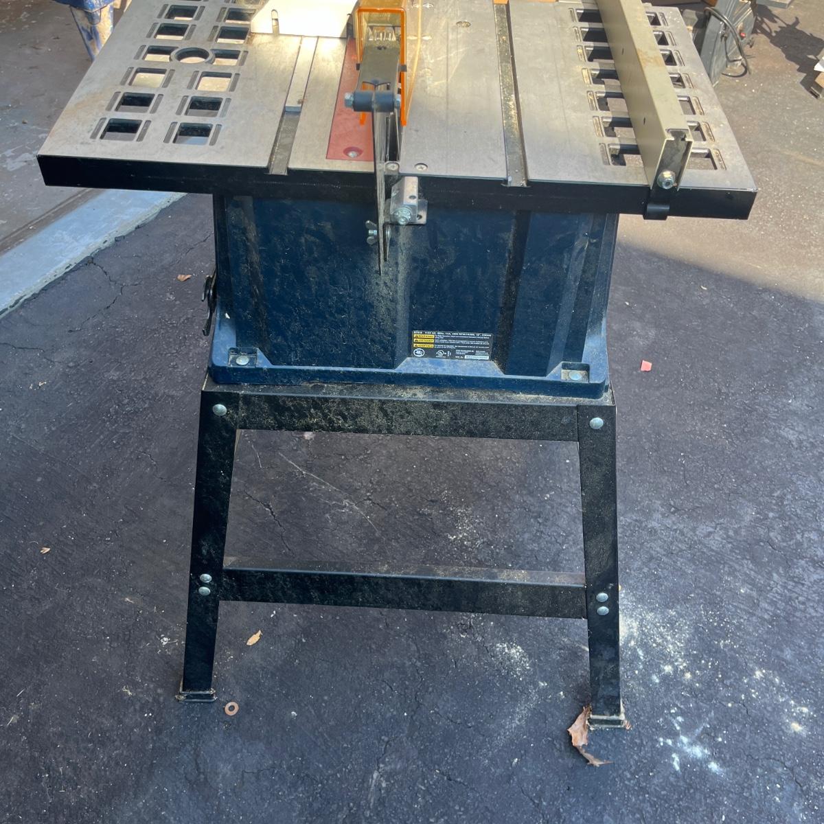 Lot includes a Ryobi 10” table saw with metal stand. Saw and stand measure 26” x 20” x 40”H. Saw powered on when plugged in.