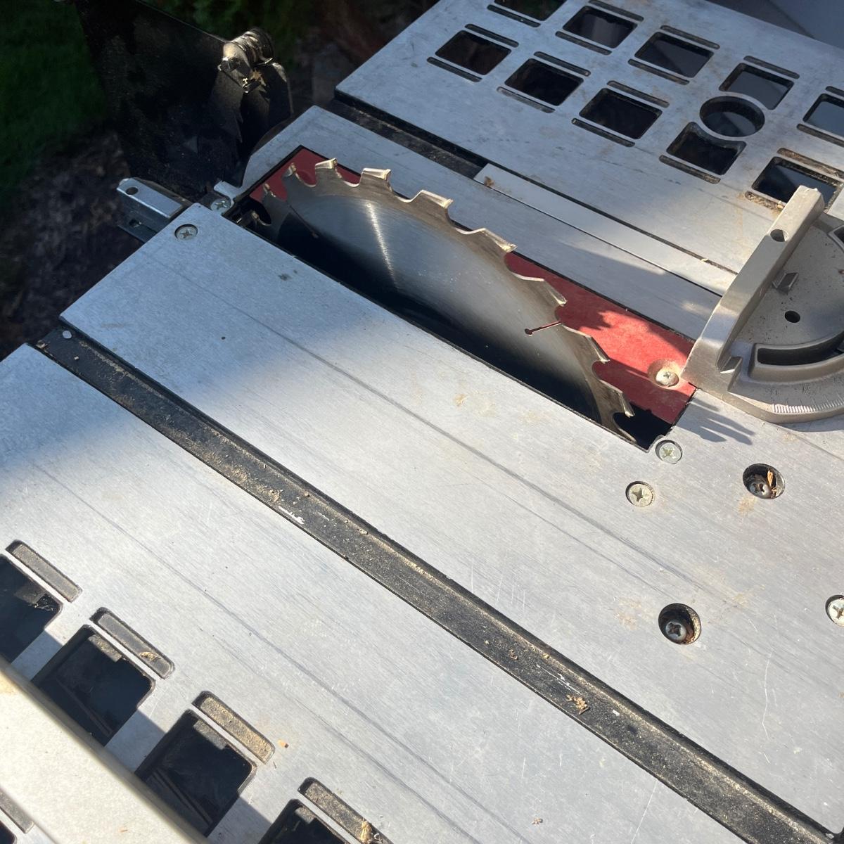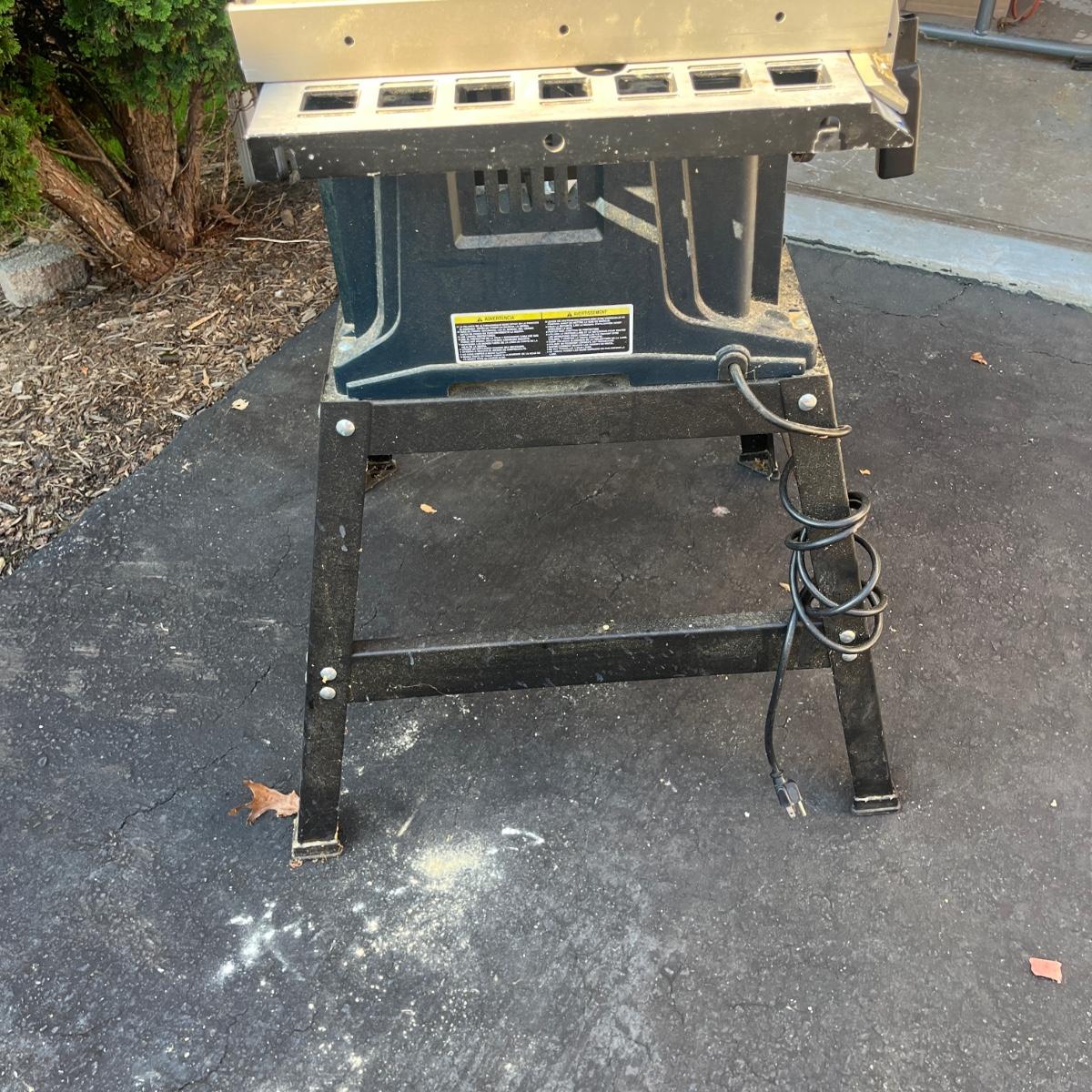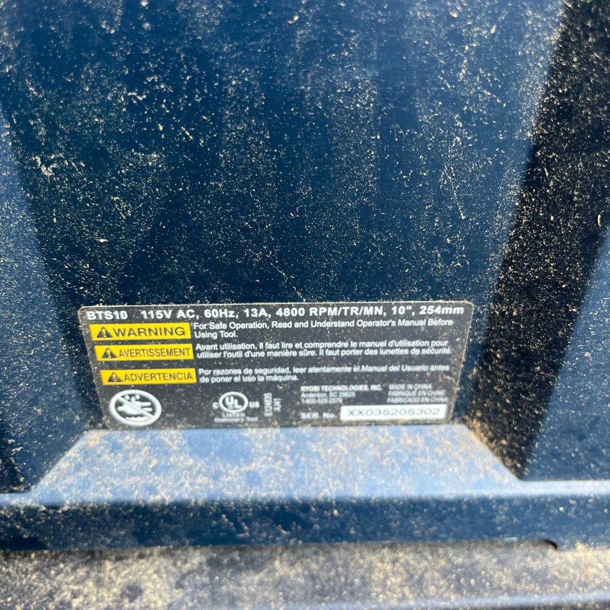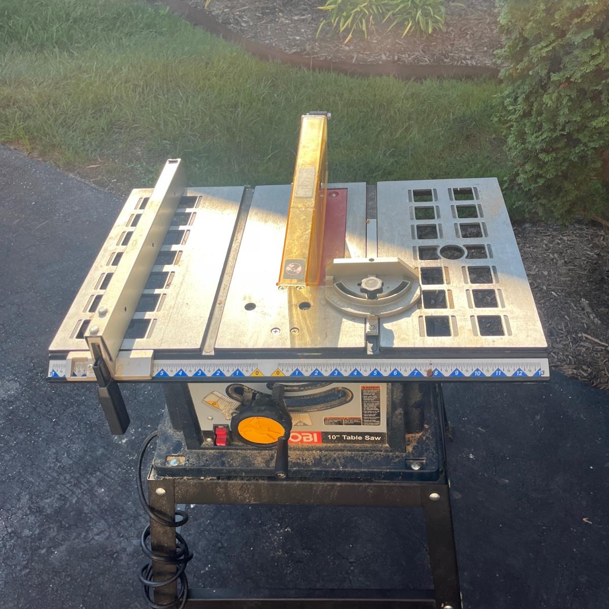 Lot includes a Ryobi 10” table saw with metal stand. Saw and stand measure 26” x 20” x 40”H. Saw powered on when plugged in.