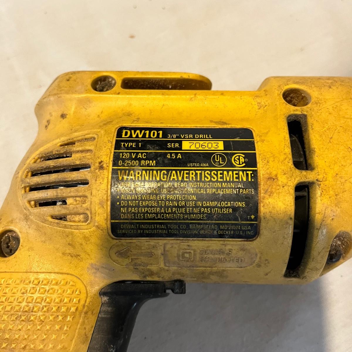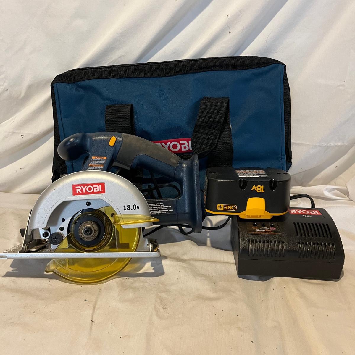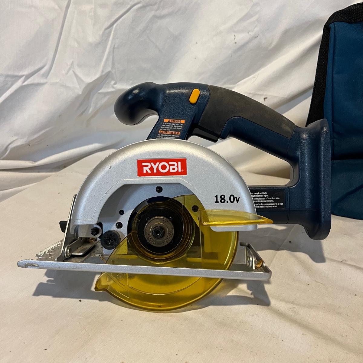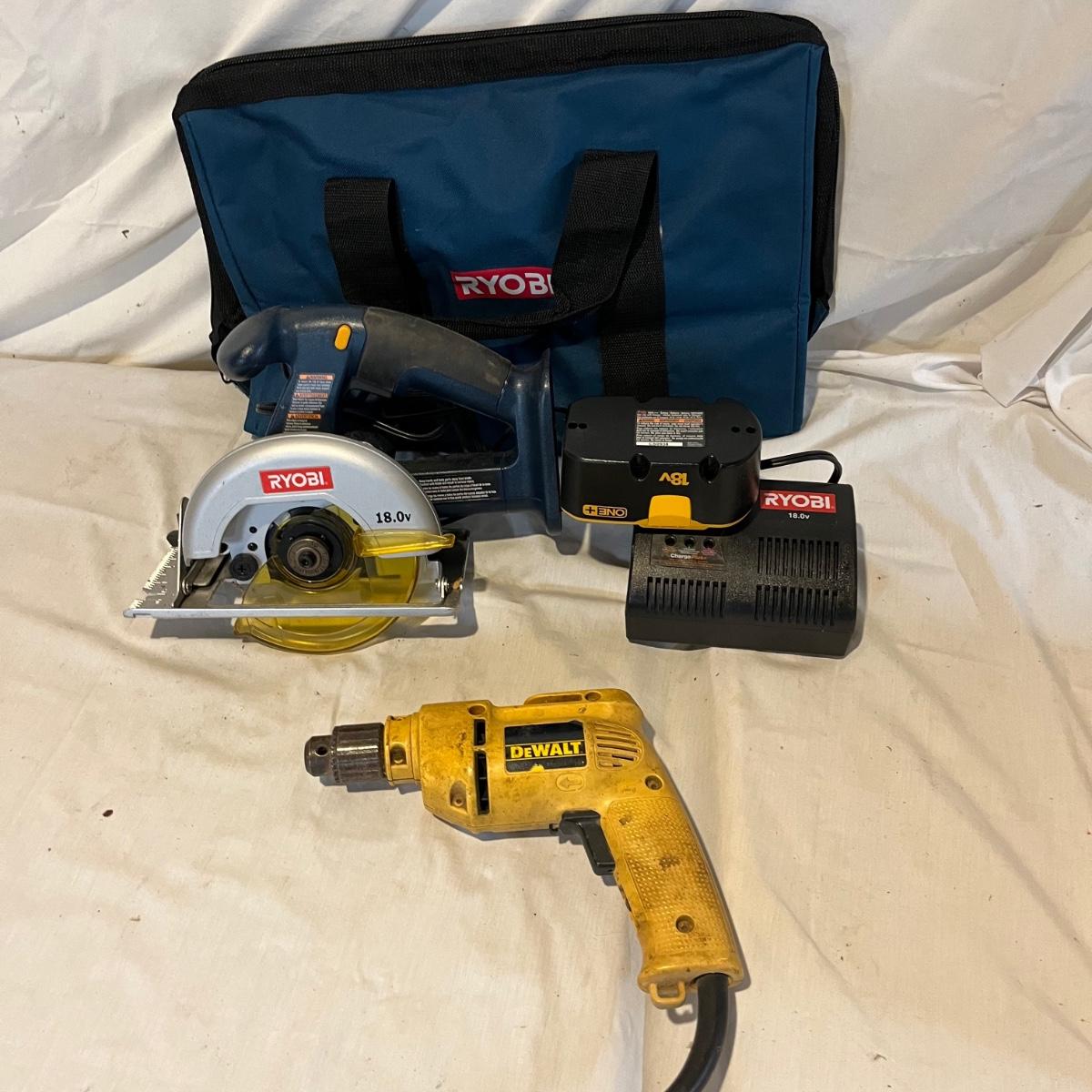 Lot includes a 3/8” Dewalt electric drill model # DW101 and a Ryobi 18V model # P501 5 1/2” circular saw with one battery, charger and soft sided carrying bag. Both items worked when tested, but saw has no blade.