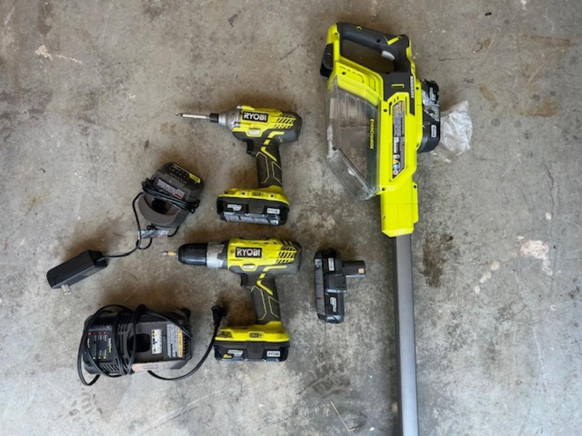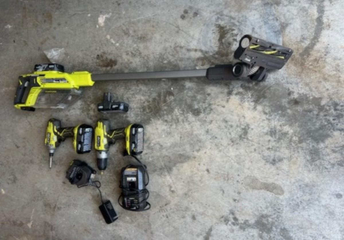 Includes a vacuum, a drill, an impact driver, four batteries, and two chargers. Working at time of catalog.