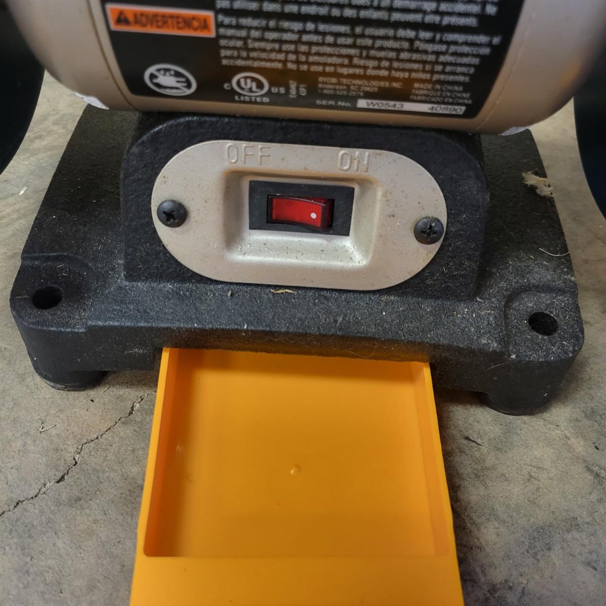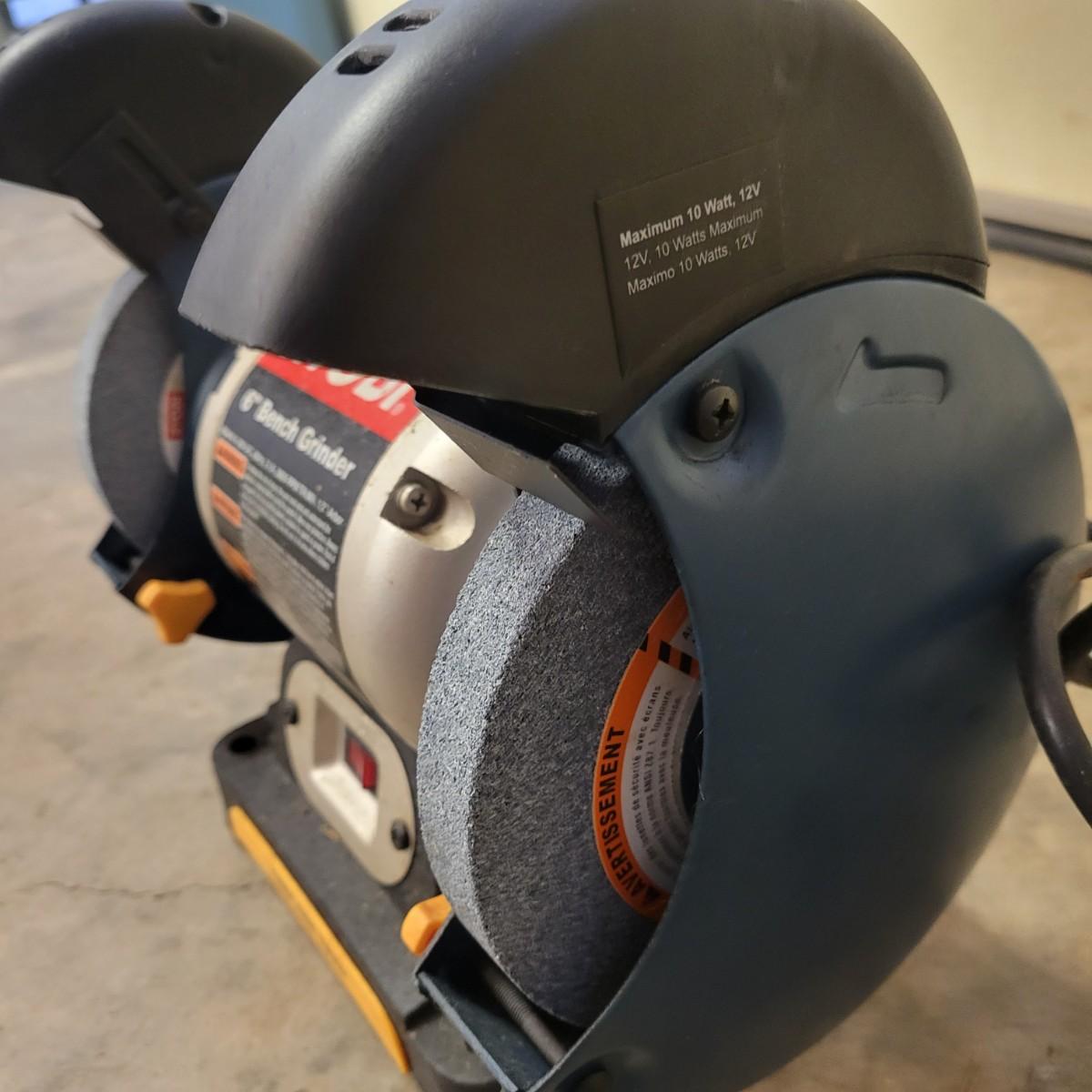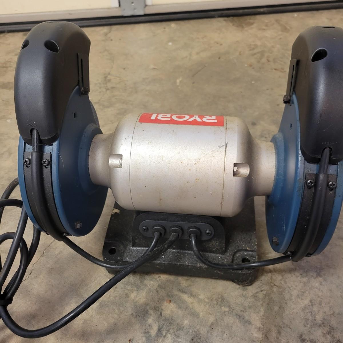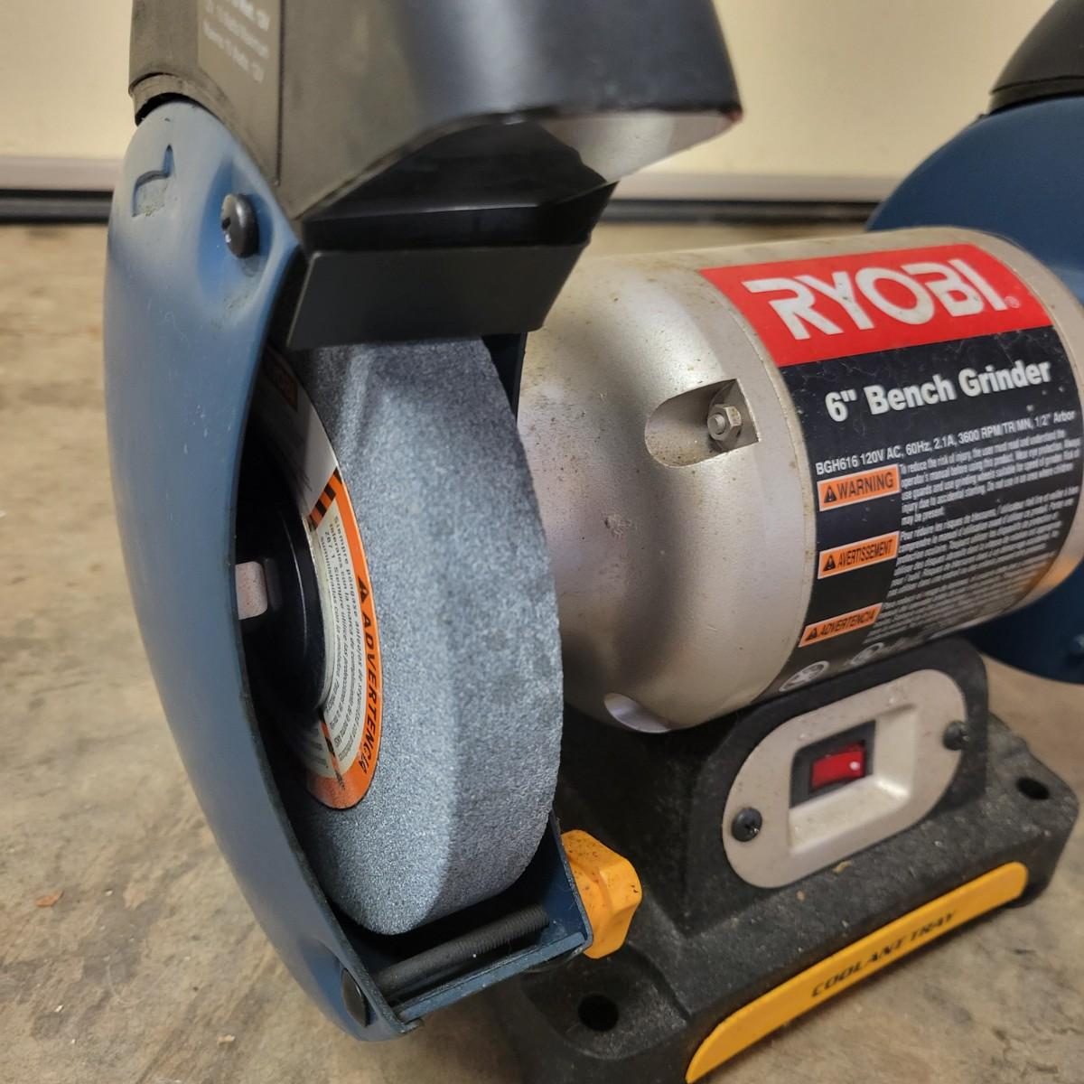 A Ryobi 6" bench grinder in good condition and appears to have never been used. This 6" bench grinder features a 2.1 amp 3600 rpm motor with a .5" arbor. Item was tested and works. Coolant tray has no residue and the grinding stones show no use. Model # BGH616. Measures approximately 13" x 7" x 11.5". Local pickup only