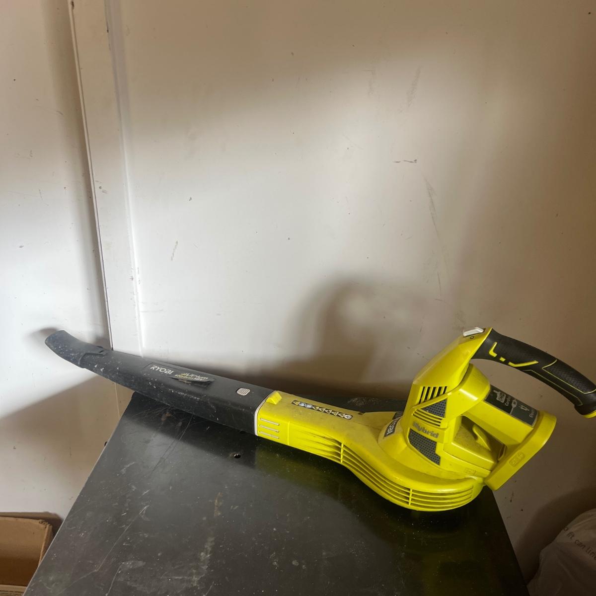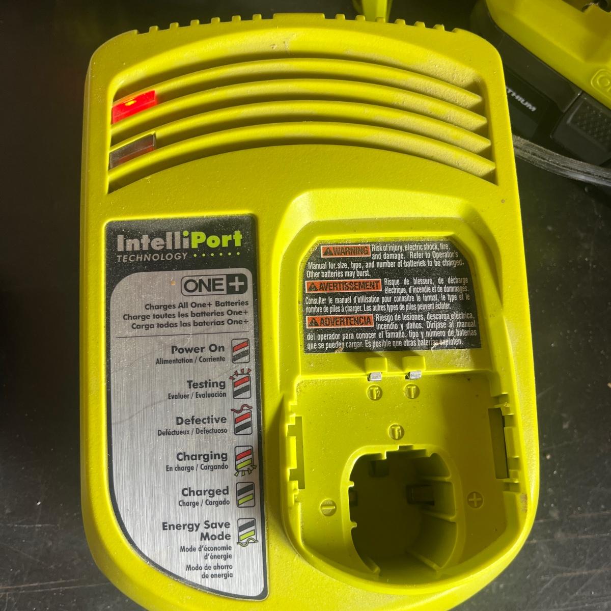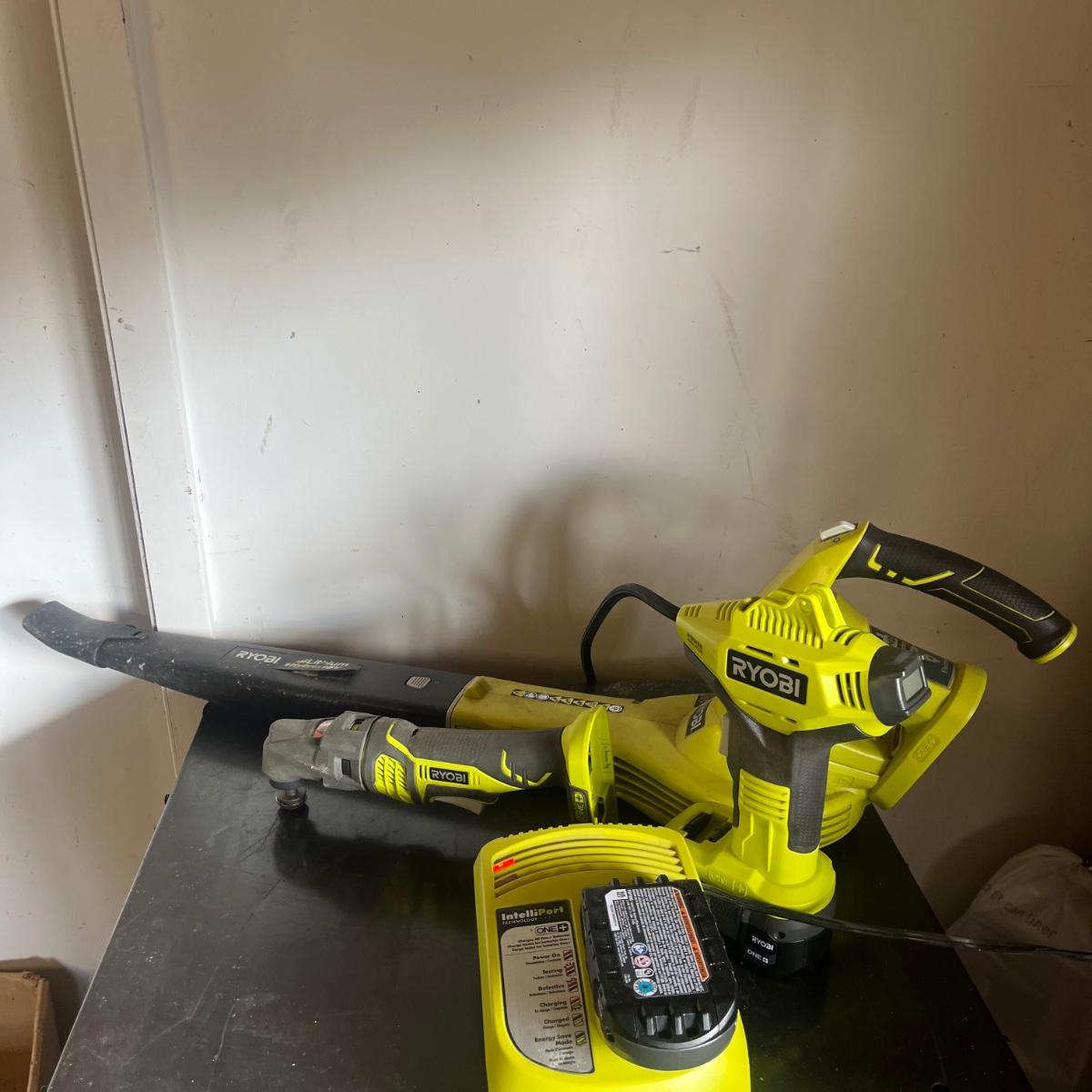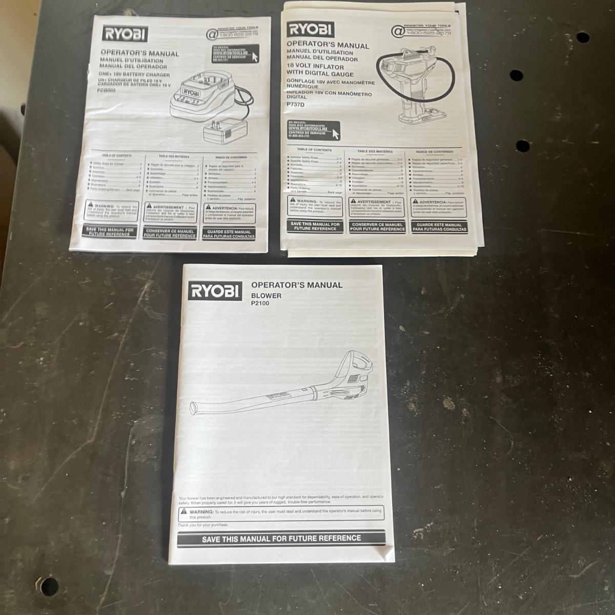 Lot contains a collection of Ryobi 18v tools that includes charger two batteries, blower, inflator and a vibrating saw. Also includes owners manuals. All items powered on when battery was installed.
