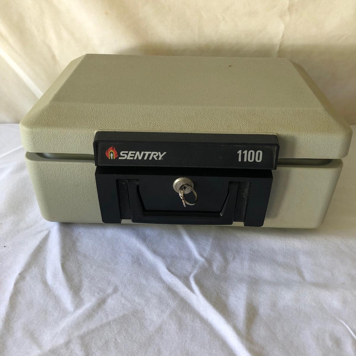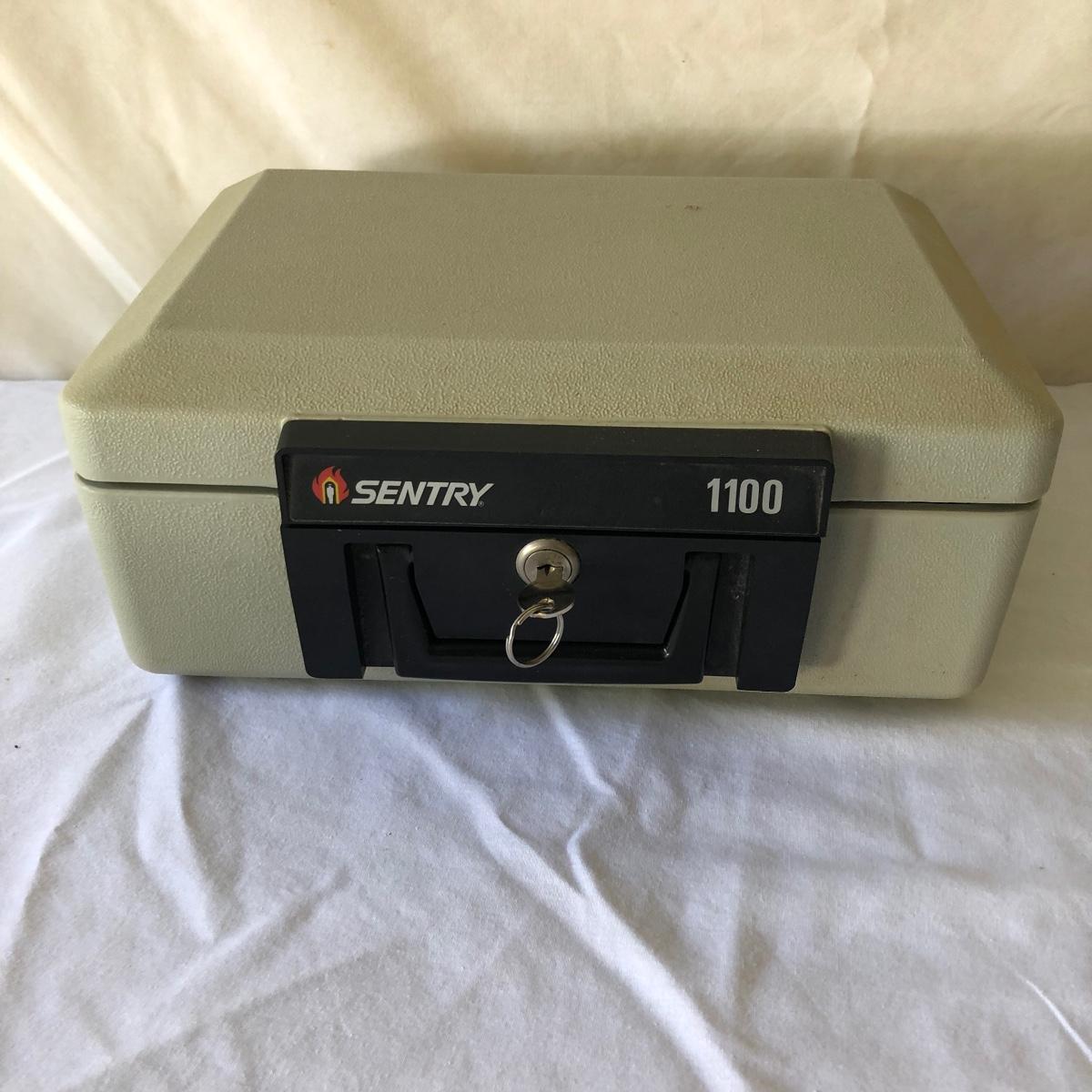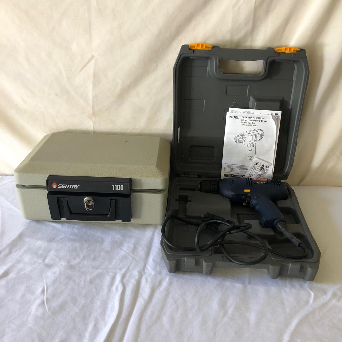 Lot includes Ryobi 3/8 electric drill with case and a Sentry 1100 safe box with key. Sentry box measures 10” x 14” x 16”. Drill worked when tested. Key on Sentry box takes a little jiggle to unlock.