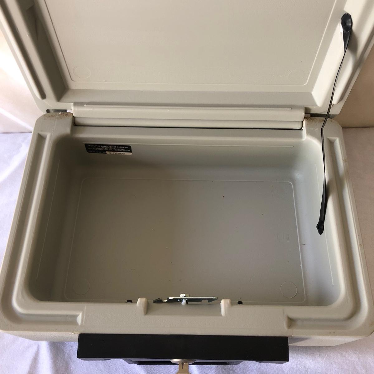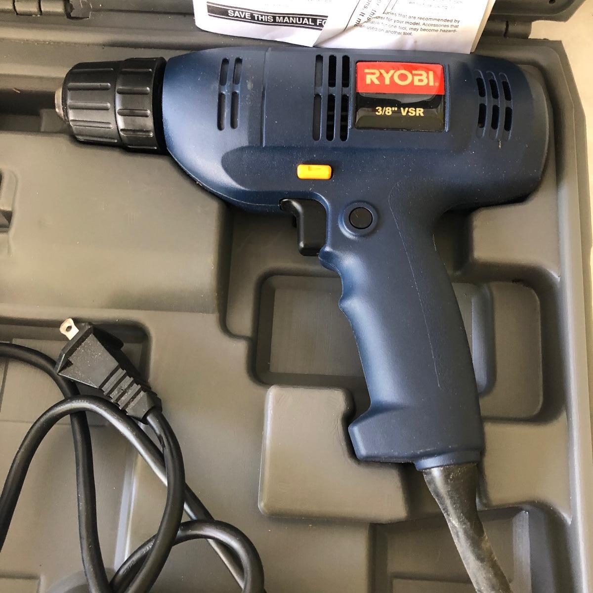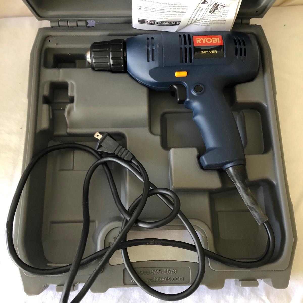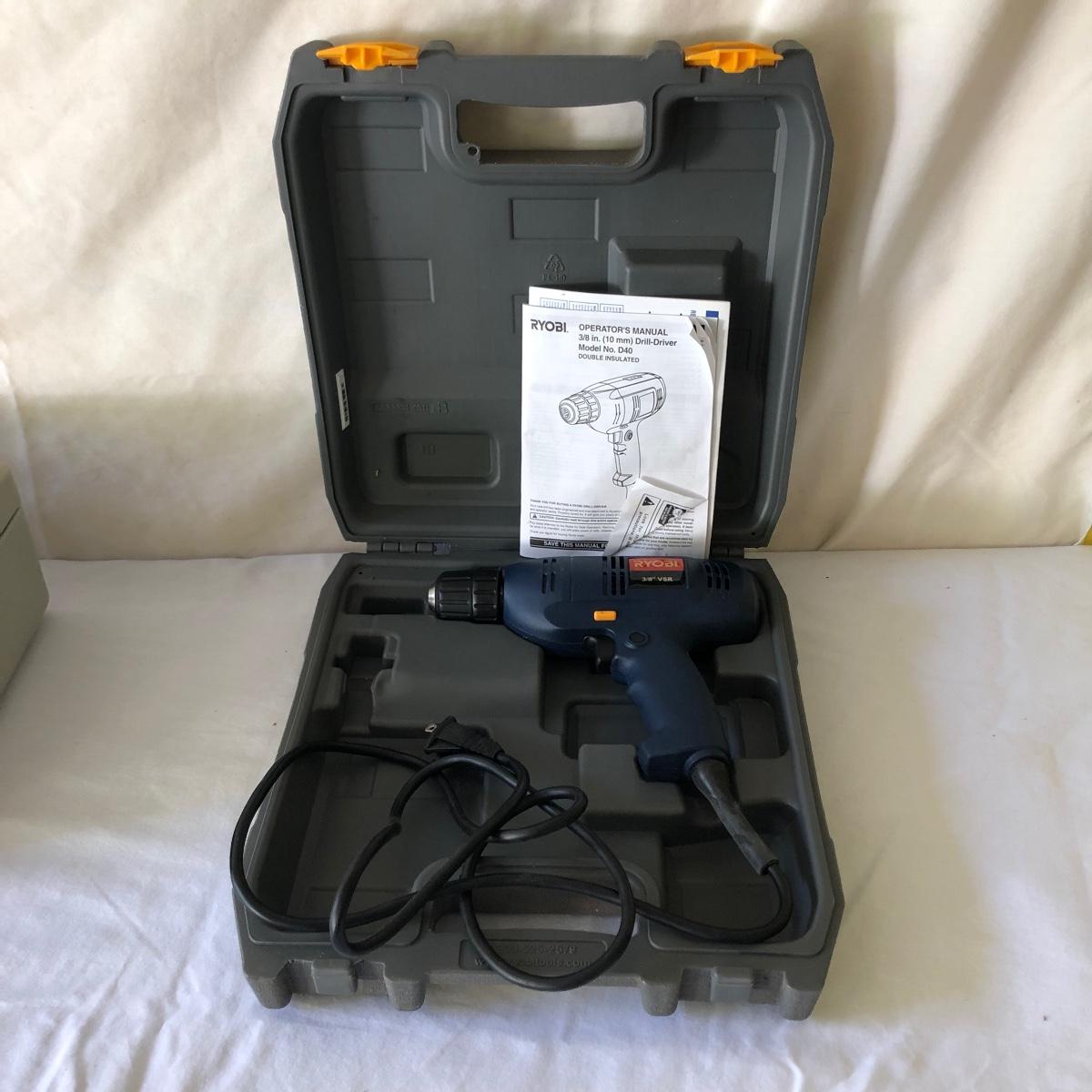 Lot includes Ryobi 3/8 electric drill with case and a Sentry 1100 safe box with key. Sentry box measures 10” x 14” x 16”. Drill worked when tested. Key on Sentry box takes a little jiggle to unlock.