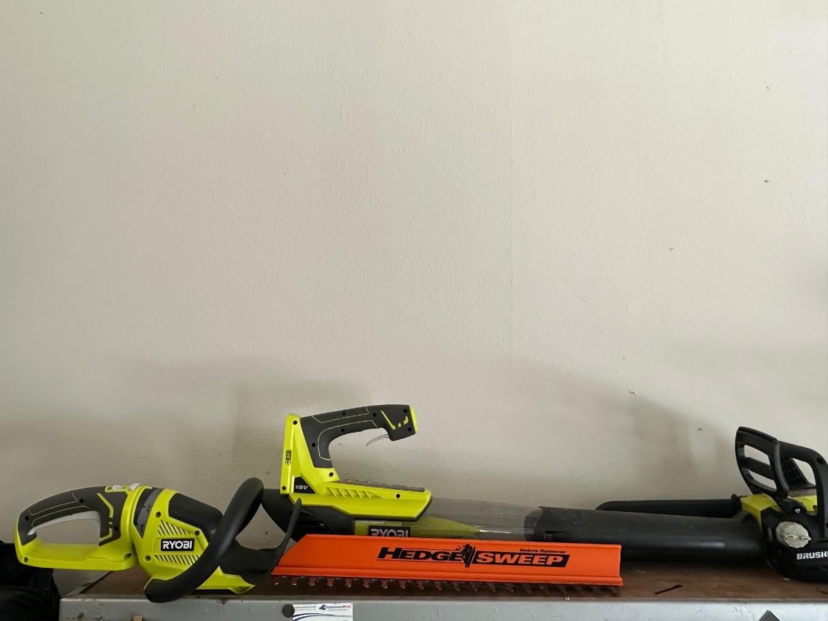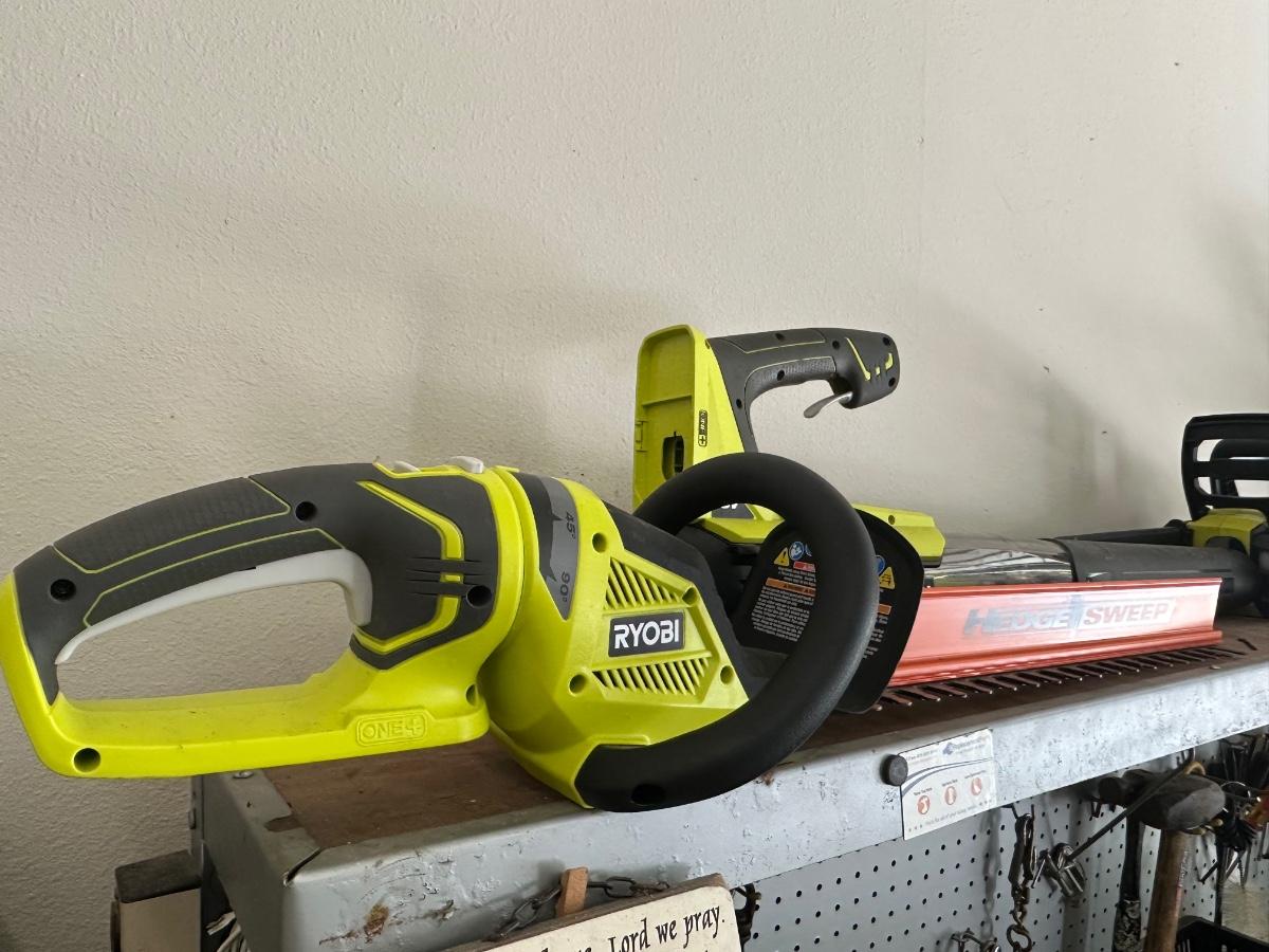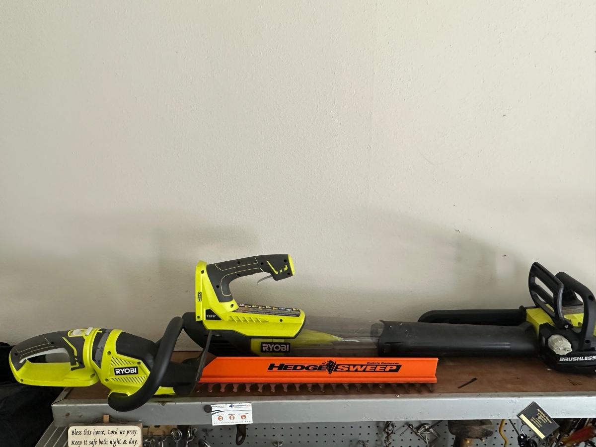 Ryobi hedge trimmer, chainsaw and blower with charger