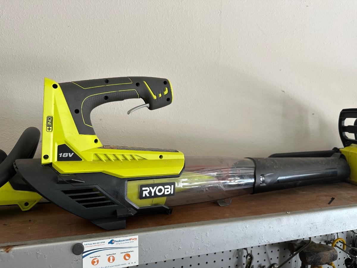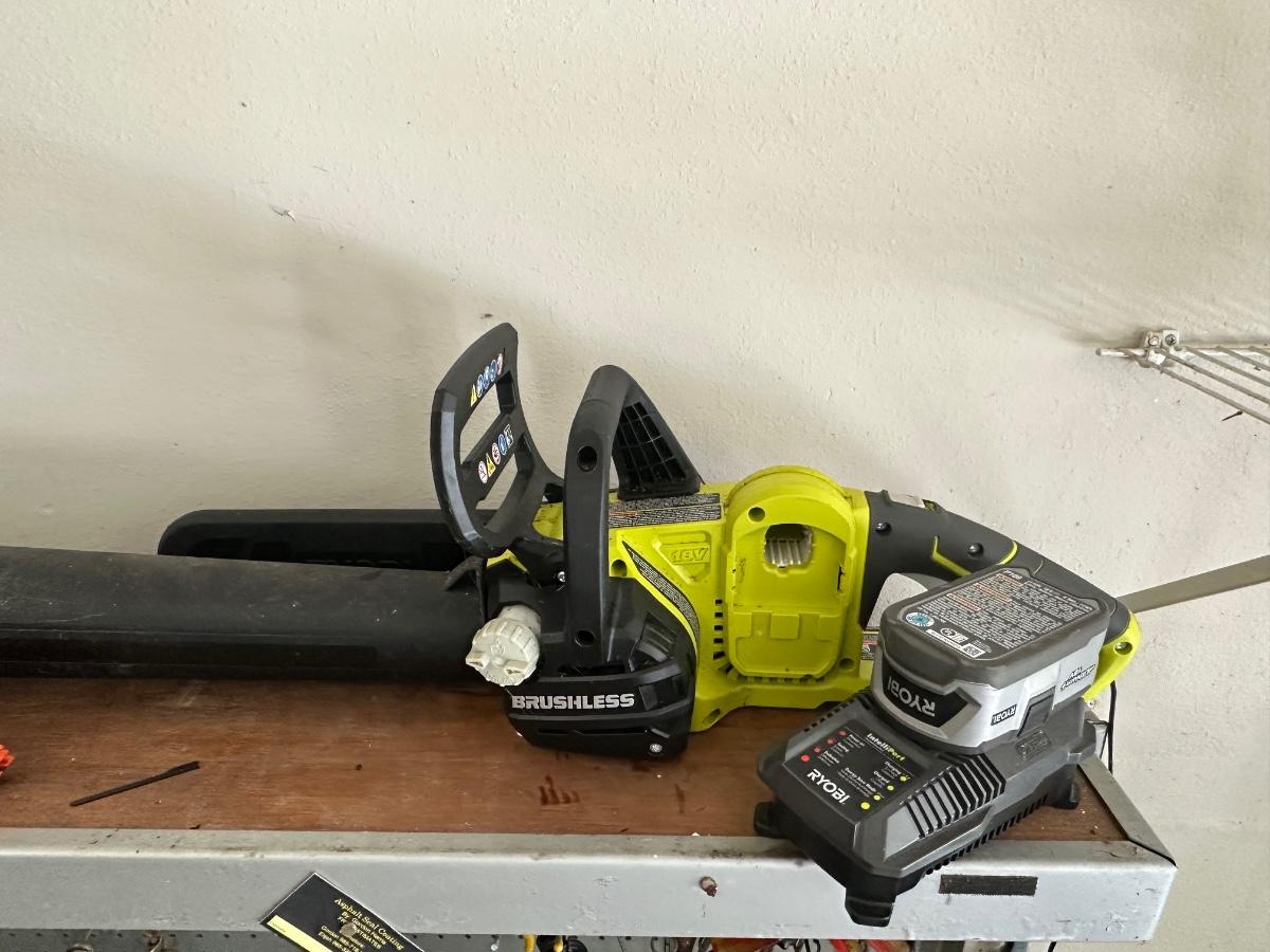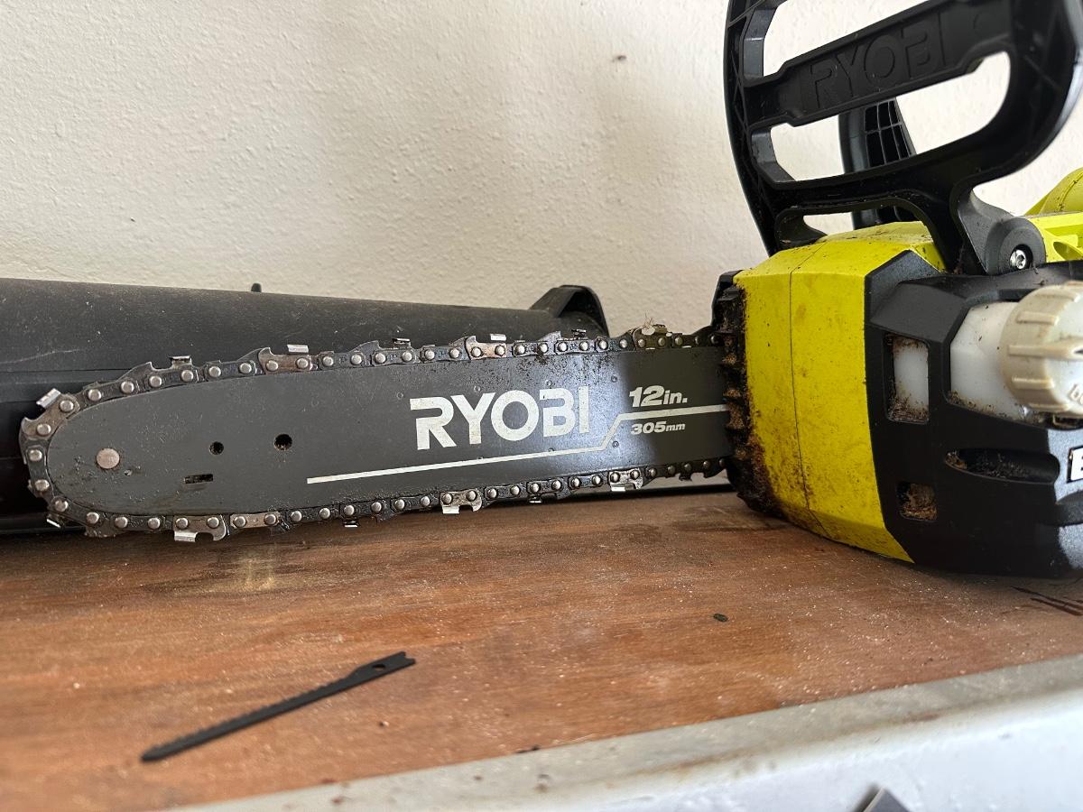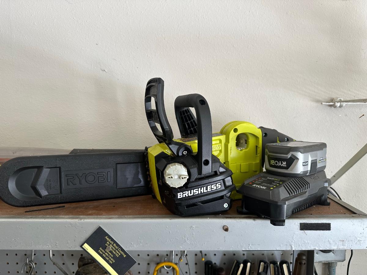 Ryobi hedge trimmer, chainsaw and blower with charger