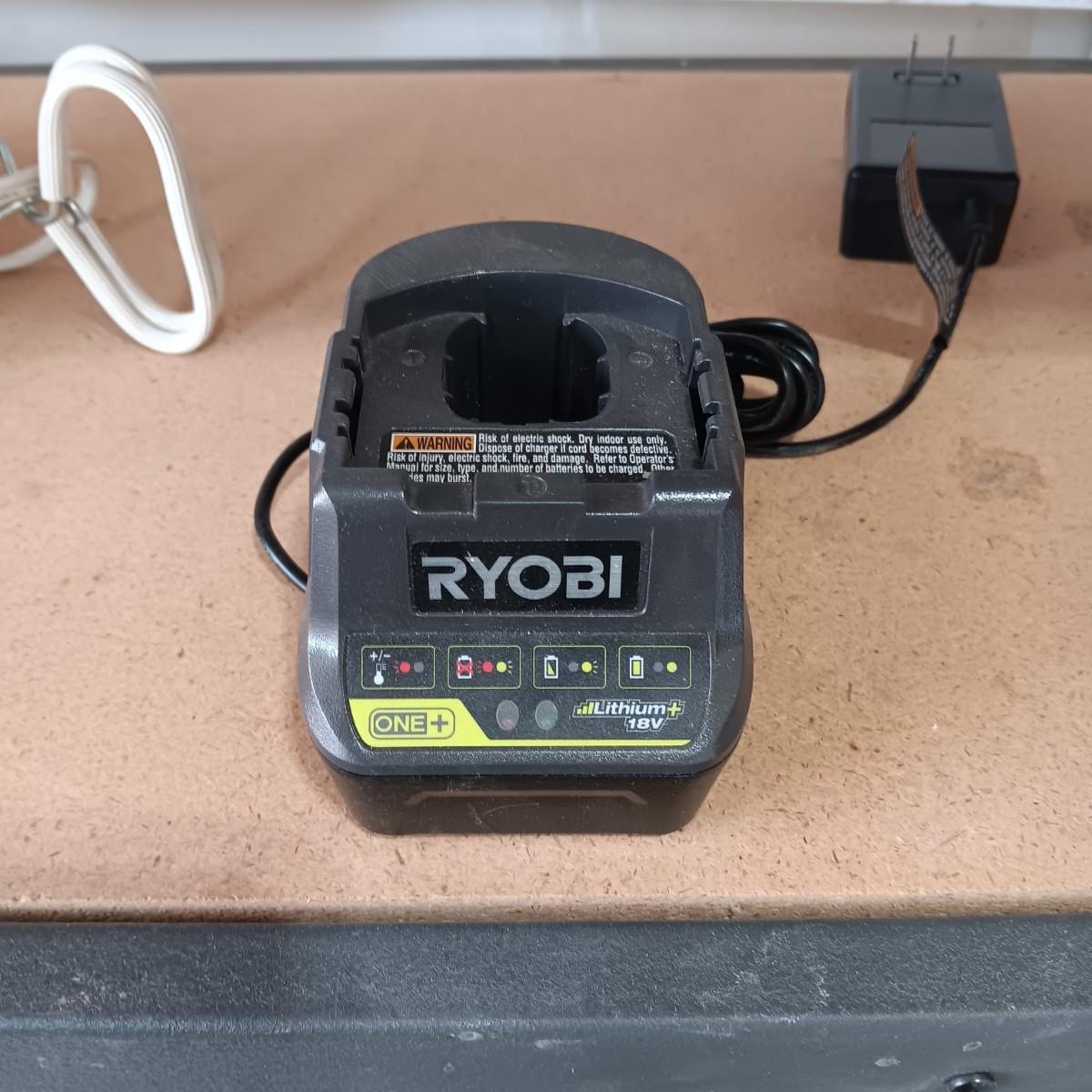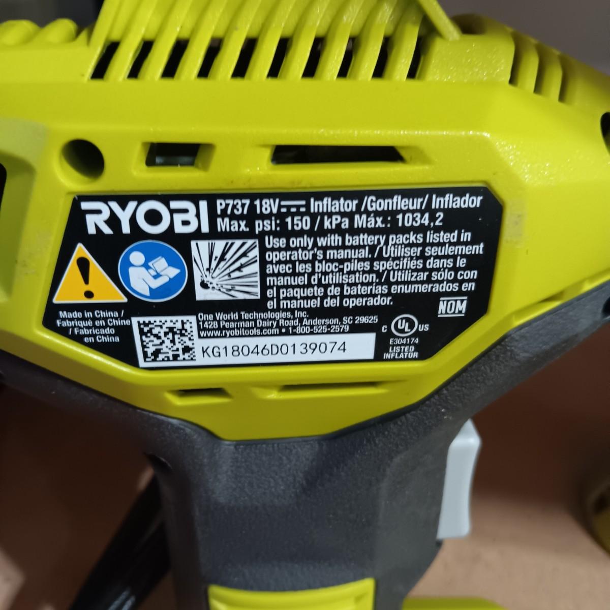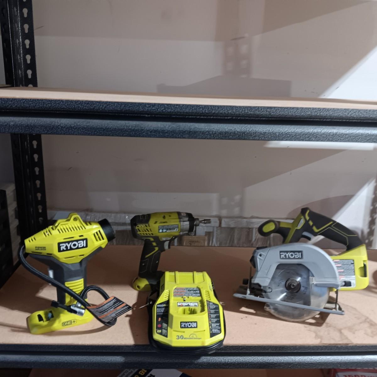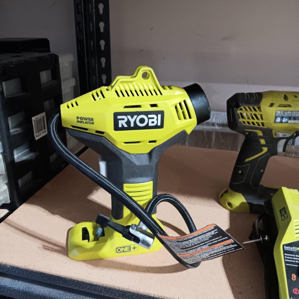 RYOBI INFLATOR, CIRCULAR SAW AND DRILL (INCLUDES CHARGER BUT NO BATTERY)