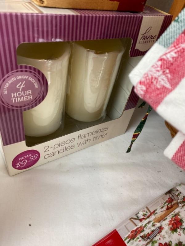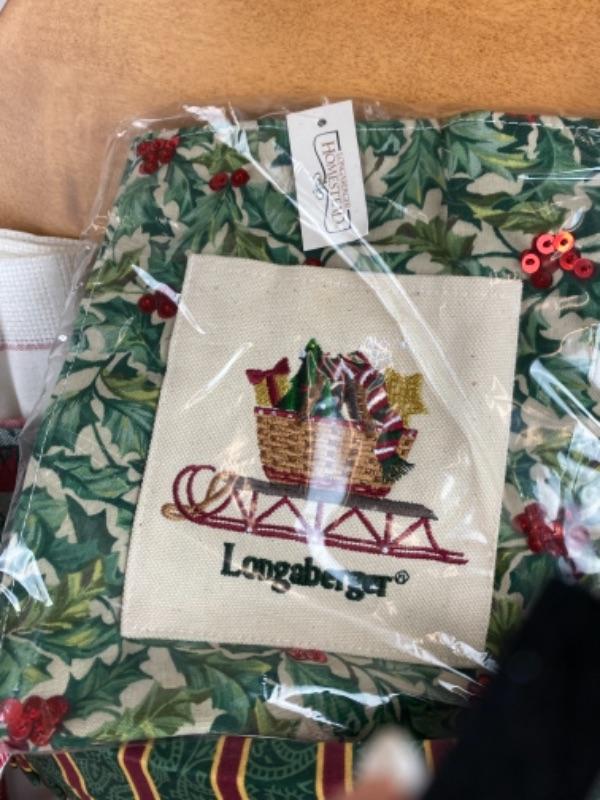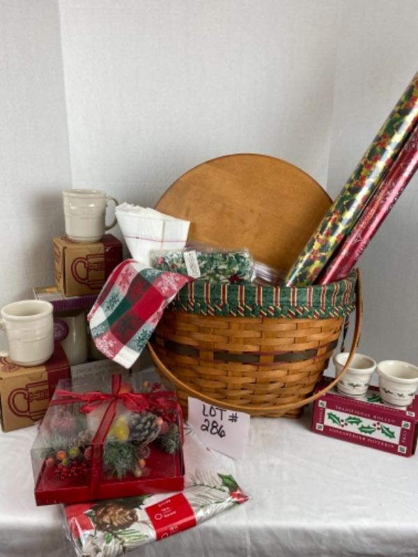 Large Longaberger basket filled with wrapping paper, frameless candle set, table cloth , napkins, reindeer bells, pair of Longaberger mugs, and pottery, tea towels, pine cone candle set, apron and cloth bag