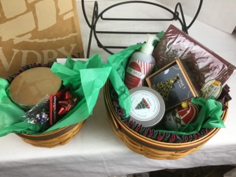 The Snowman Stand is 2 Tiered 22” Wrought Iron Stand with 2 Longaberger baskets filled with items such as -