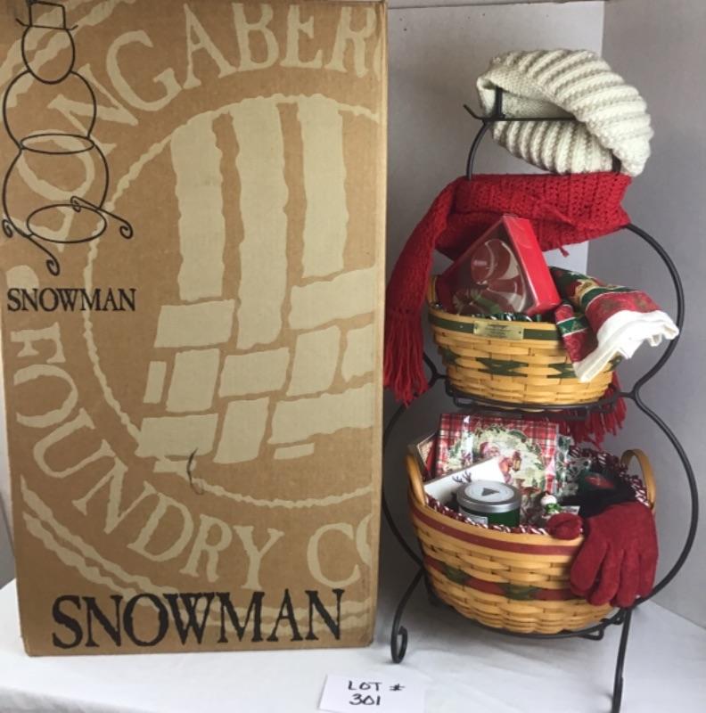 S - 301 Longaberger 32” 2 Tired Snowman Stand & 2 Christmas Gift Filled Baskets