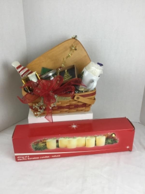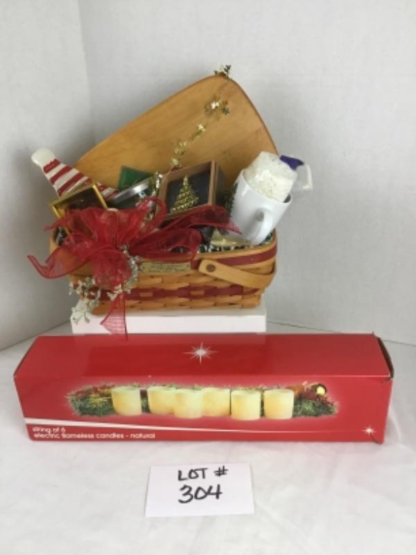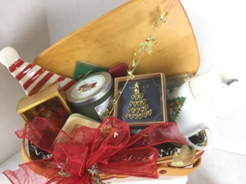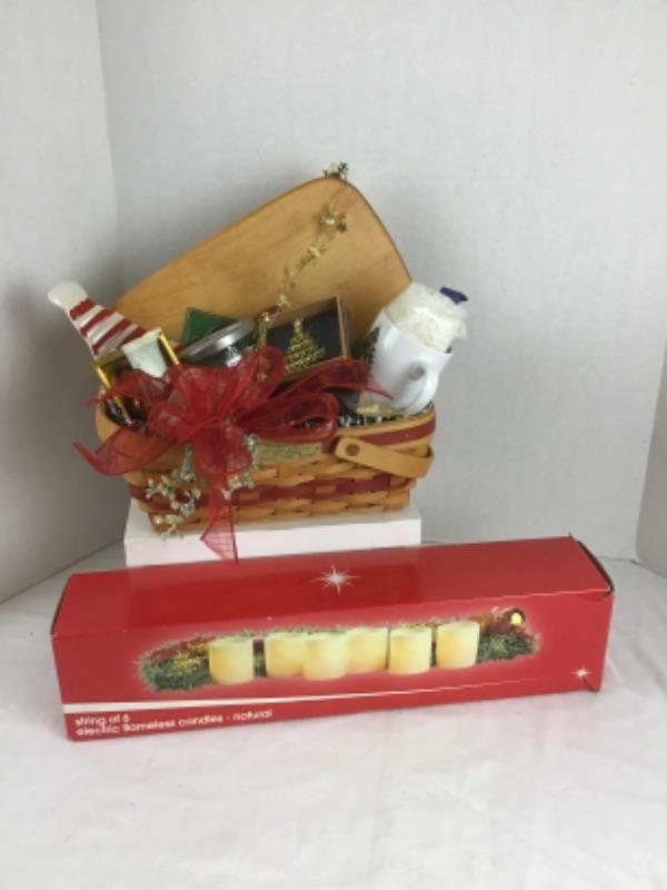 Merry Christmas with this 1996 Holiday Cheer Longaberger 2 Handles Basket filled with items such as - Set of 6 Flameless Candle Set, Candles, Jewelry, Mug, Spoon Rest, Soap, Coasters and more. Basket has both a fabric and plastic liners.