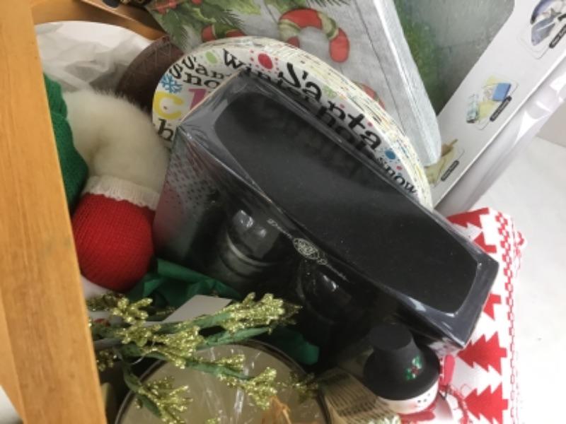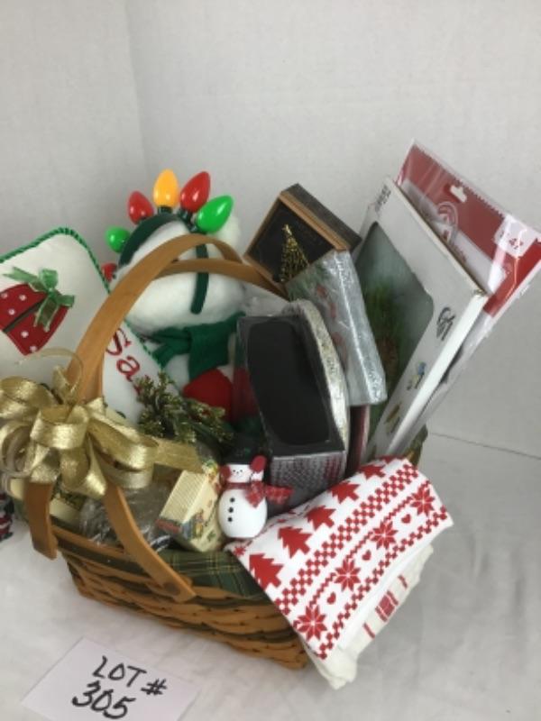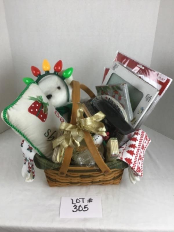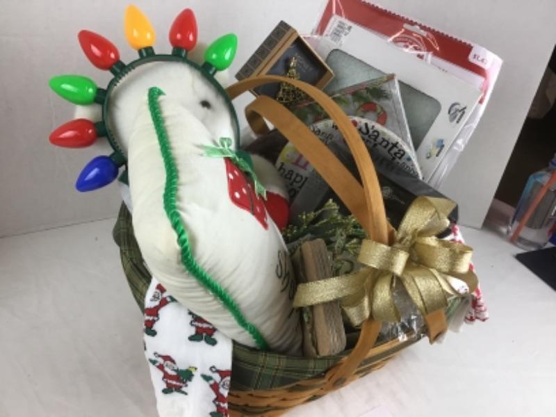 2 Handled Longaberger Christmas Gift Basket has White Teddy Bear with Christmas Light Headband, Tea Towels, Paper Products, Cutting Board, Candles, Jewelry, S/P Shaker, Coasters, Ornaments, Socks, Pillow, Hanging Decorative's and more