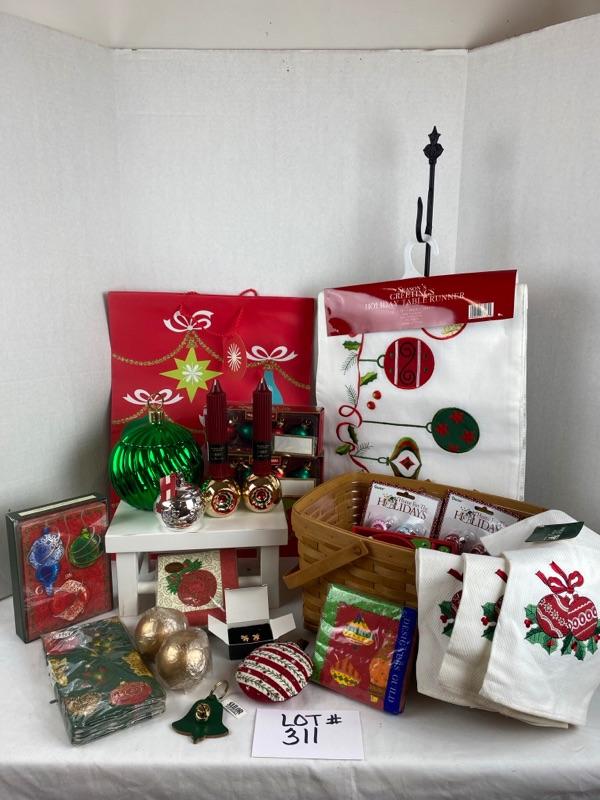 Ornaments, Tea Towels, Place card Holders, Napkins, Earrings, Candle and more are all in this Large 2 handled Longaberger Basket with Plastic Liner