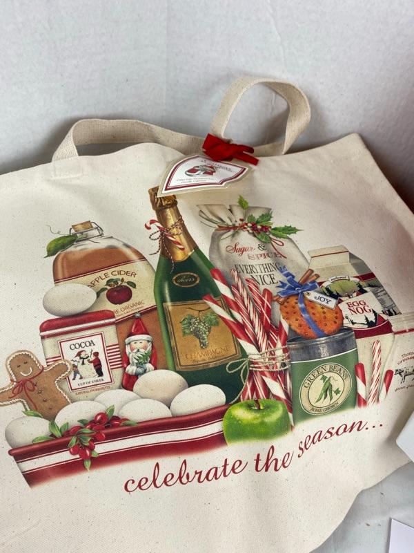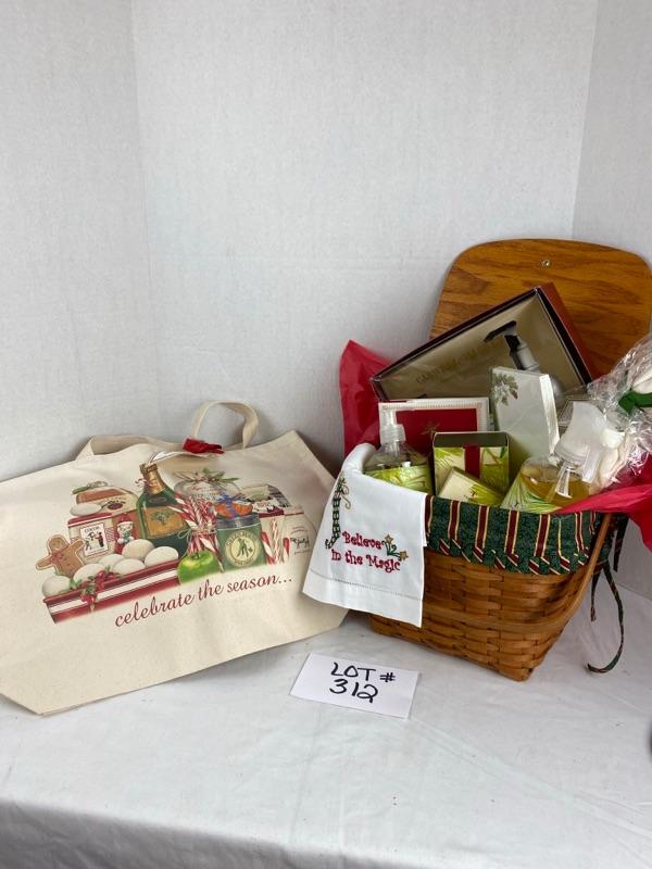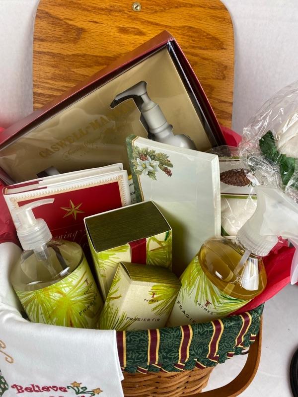 This Longaberger Gift Basket has a hinged top, Fabric & Plastic Liners, filled with items such as - Caswell Massey Lotion, Thymes Fraser Fur, tea Towels, Book, Notepad, Canvas Tote Bag and more