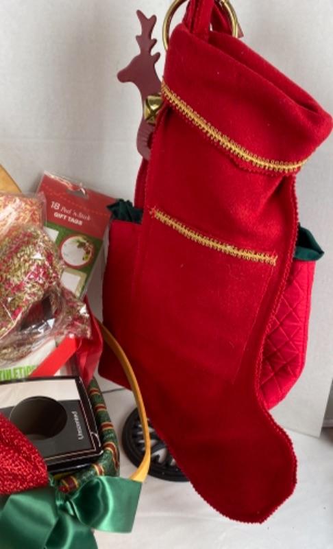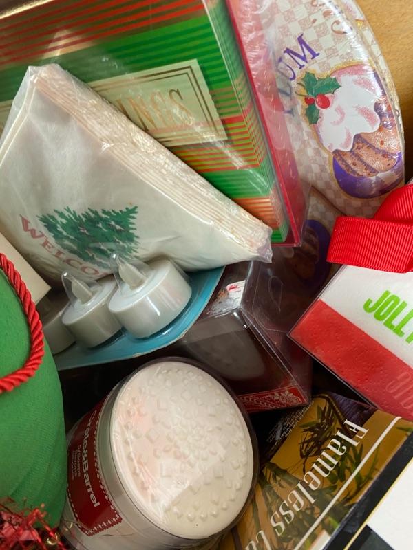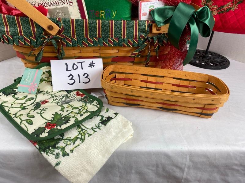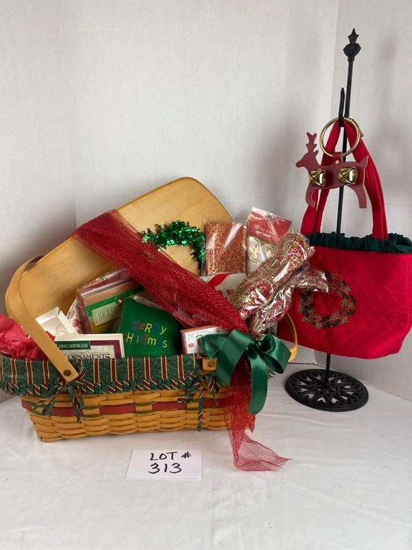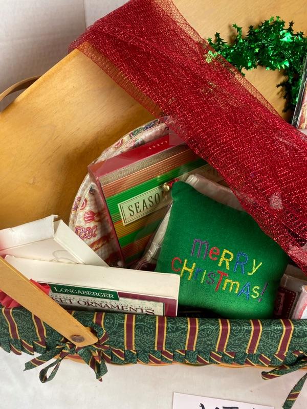 Scarf, Longaberger Ornaments, Angel, Cards, Paper Products, Candles, Handbag, Stocking, and a smaller Rectangular Longaberger Basket, Tea Towels